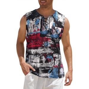 COOFANDY Men Tank Top Cotton Linen Beach Sleeveless Shirt Lace Up Bohemian Hippie Renaissance Pirate Kilt Medieval Tunic(Tie-dye- Navy)