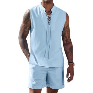 COOFANDY Men Tank Top Cotton Linen Beach Sleeveless Shirt Lace Up Bohemian Hippie Renaissance Pirate Kilt Medieval Tunic(Sky Blue)