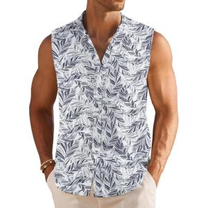 COOFANDY Sleeveless Beach Shirts for Men Summer Tank Shirts Casual Henley Tank Top(Blue Leaves)