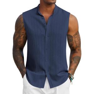 COOFANDY Mens Sleeveless Summer Shirts Beach Tank Tops Button Up Textured Tank Shirt for Vacation(Navy Blue)
