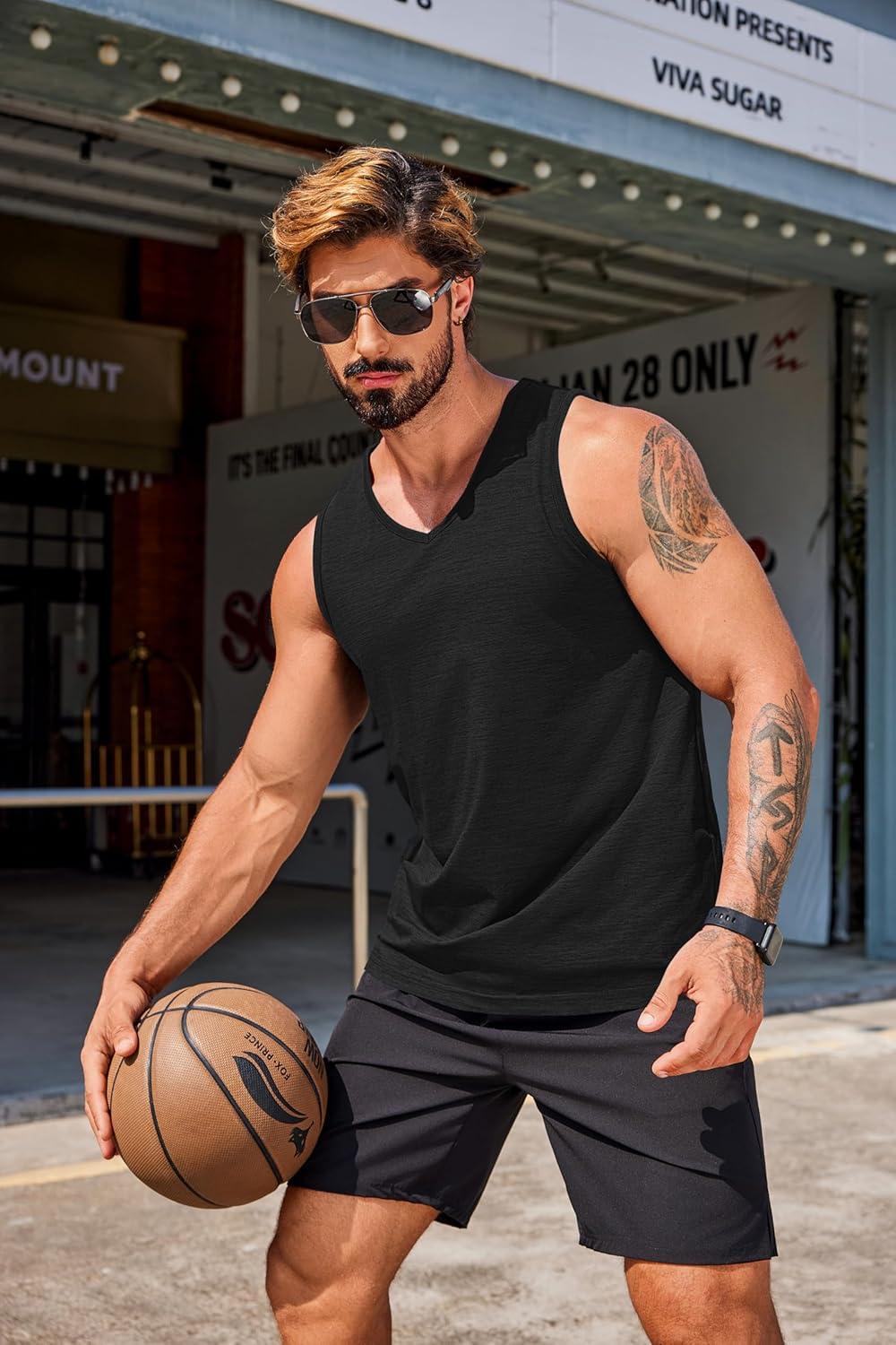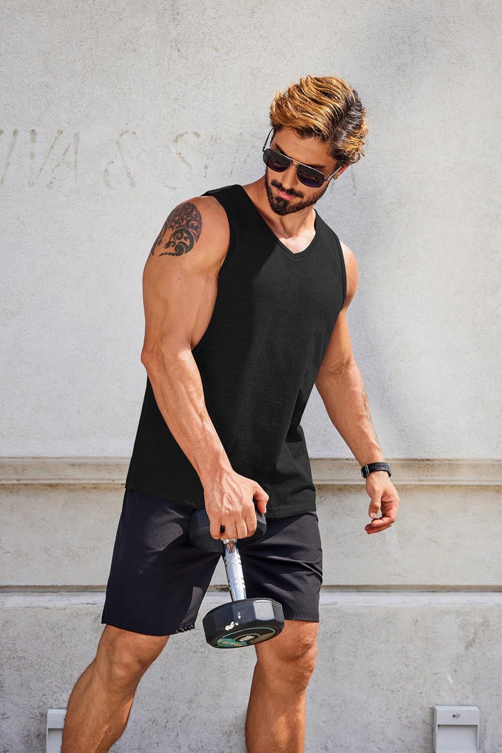 COOFANDY Men’s Workout Tank Top V Neck Gym Sleeveless Muscle T Shirts Textured Casual Tank Tops Summer(Black/Dark Grey (2 Pcs))