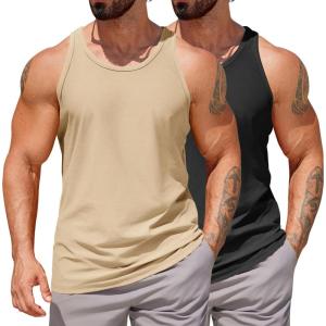 COOFANDY Men’s Workout Tank Tops 2 Pack Y Back Sleeveless Shirts Gym Muscle T Shirt Bodybuidling Athletic Stringer Tee(Khaki/Black)