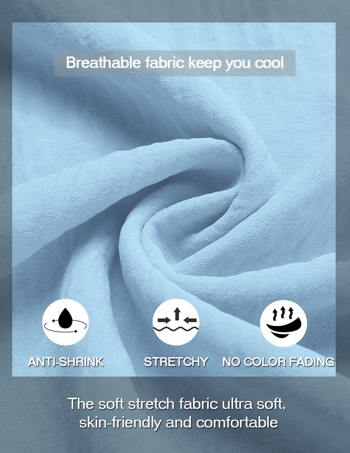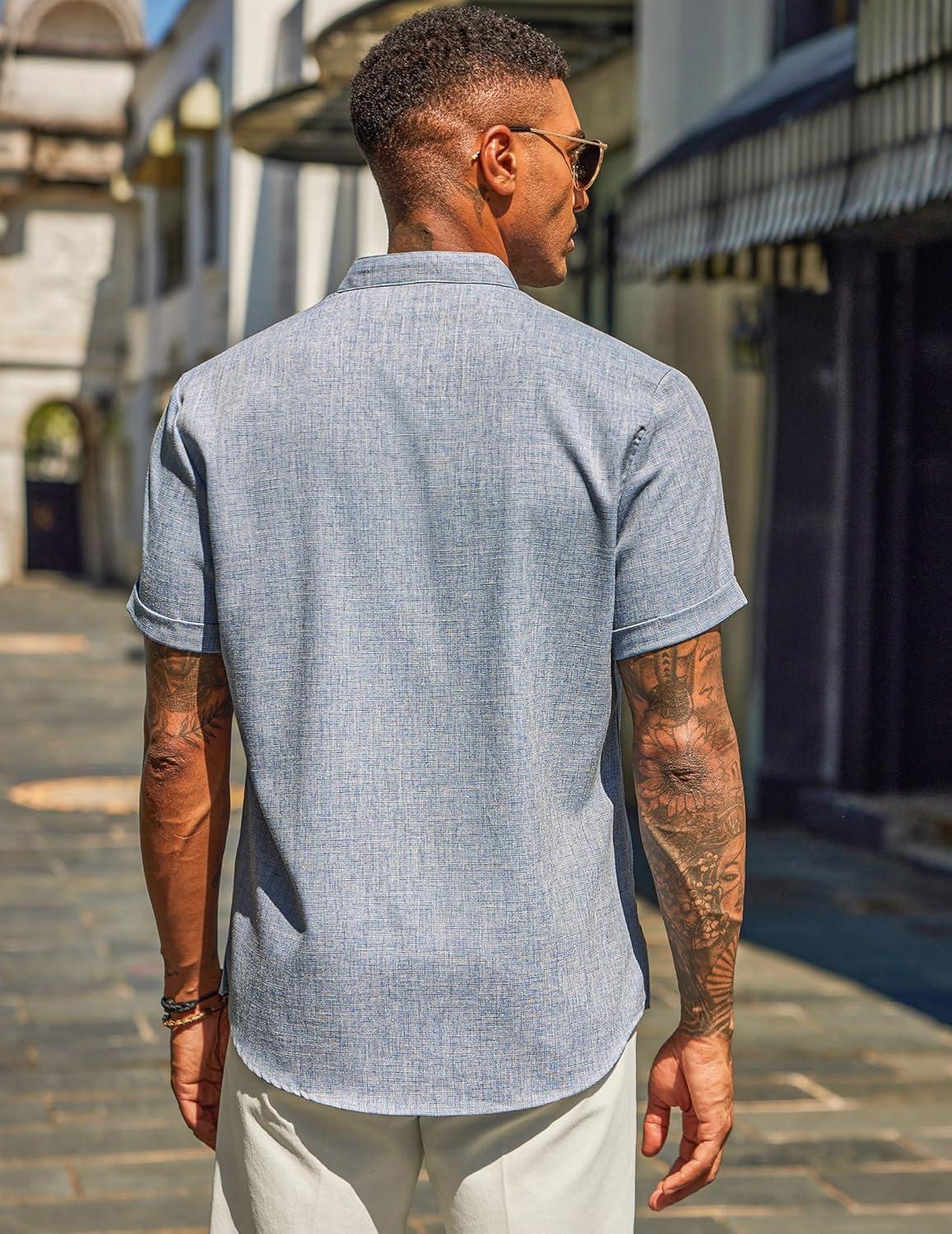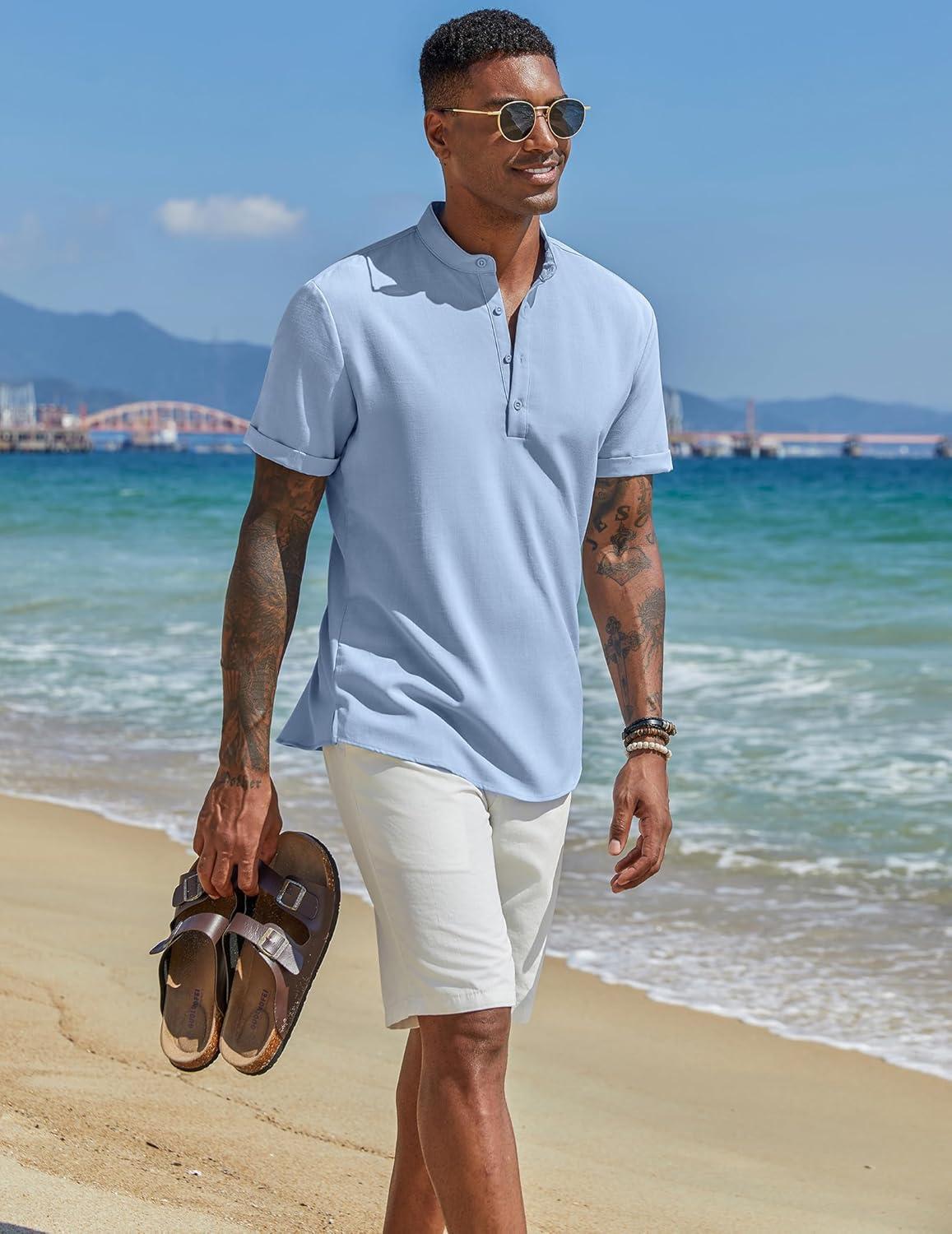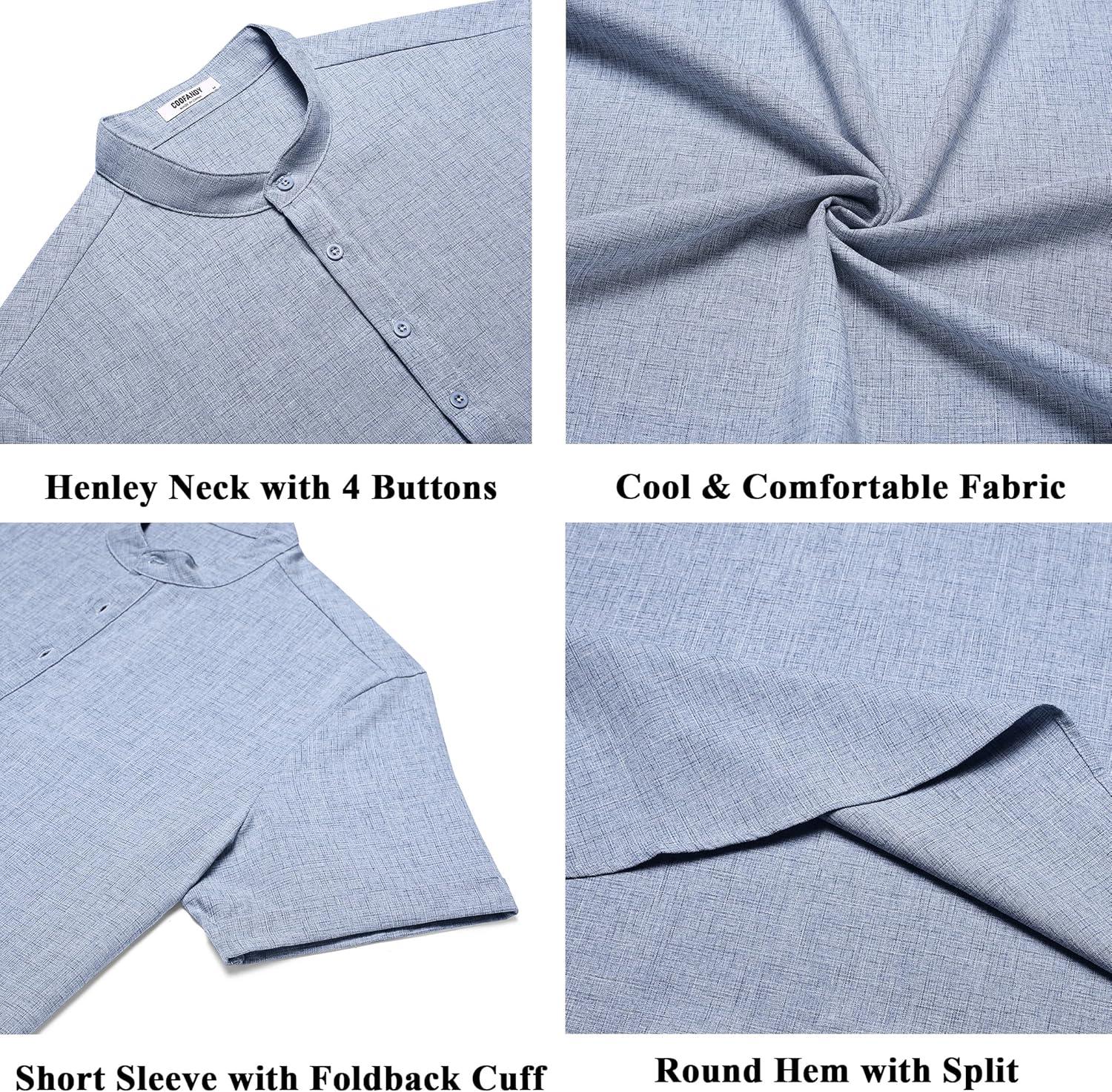 COOFANDY Men’s Casual Linen Henley Shirts Short Sleeve Band Collar Summer Beach Vacation T-Shirts(Light Heather Blue)