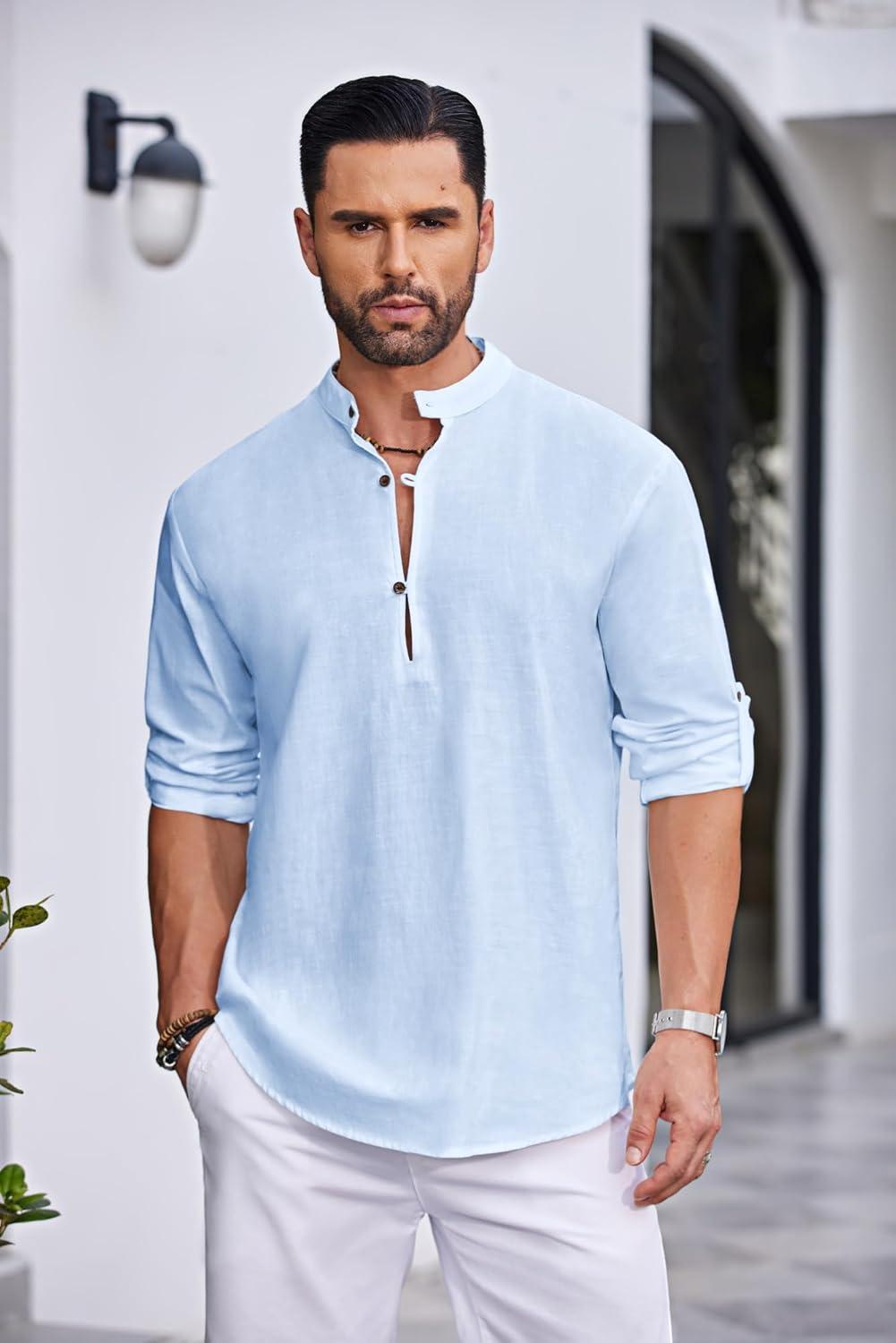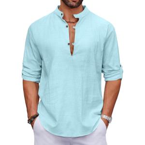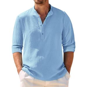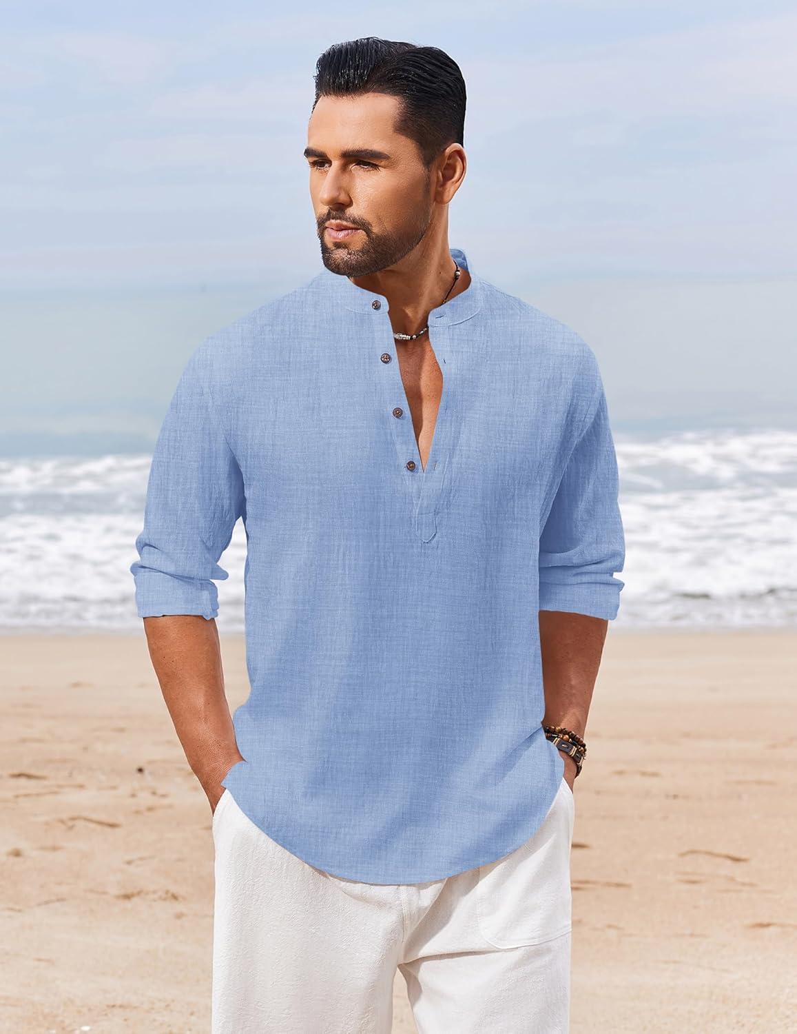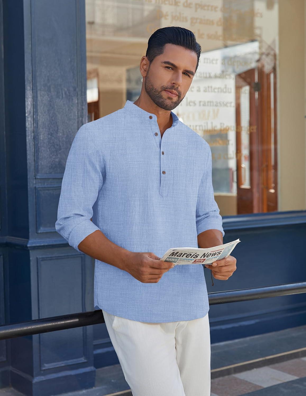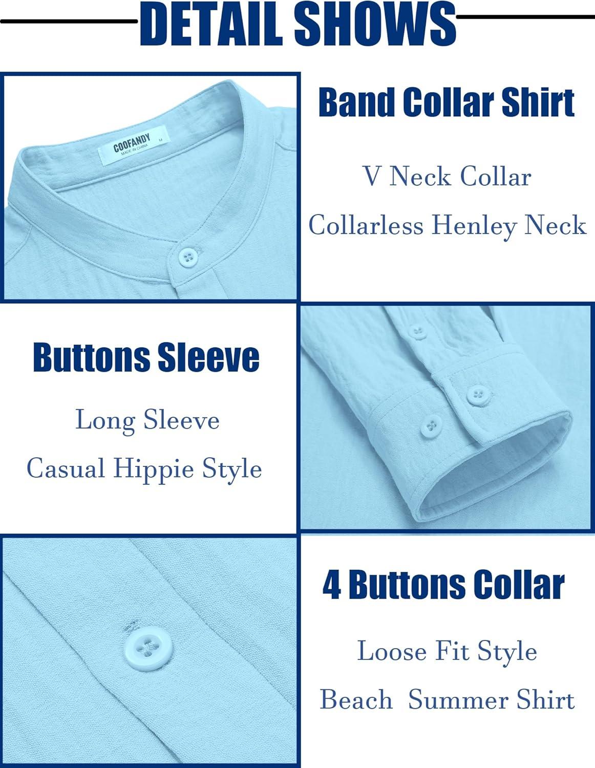 COOFANDY Men’s Casual Henley Shirt Band Collar Long Sleeve Shirt Beach Hippie Summer Button T Shirt(Light Blue)