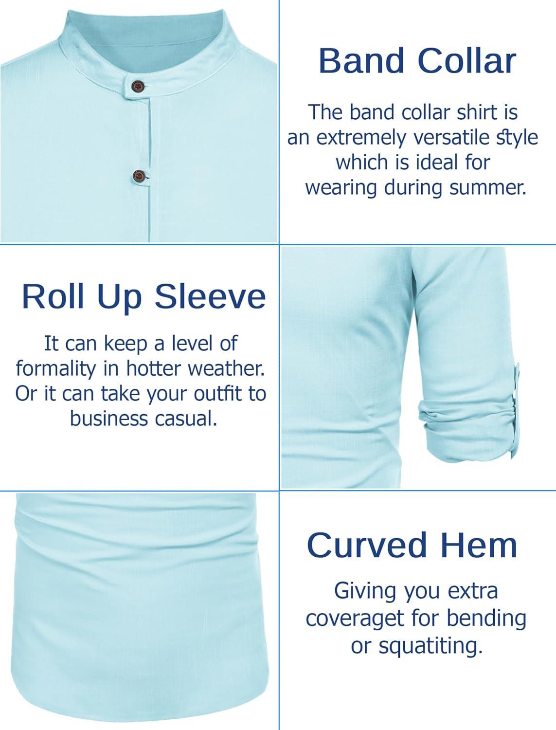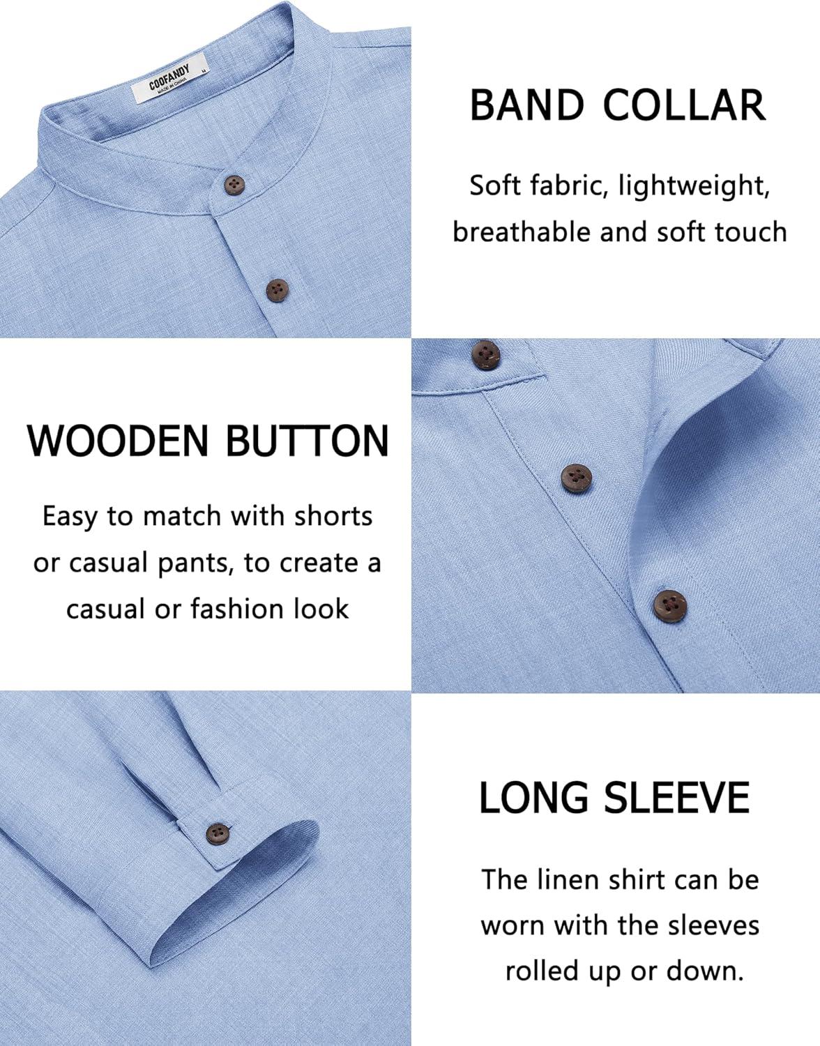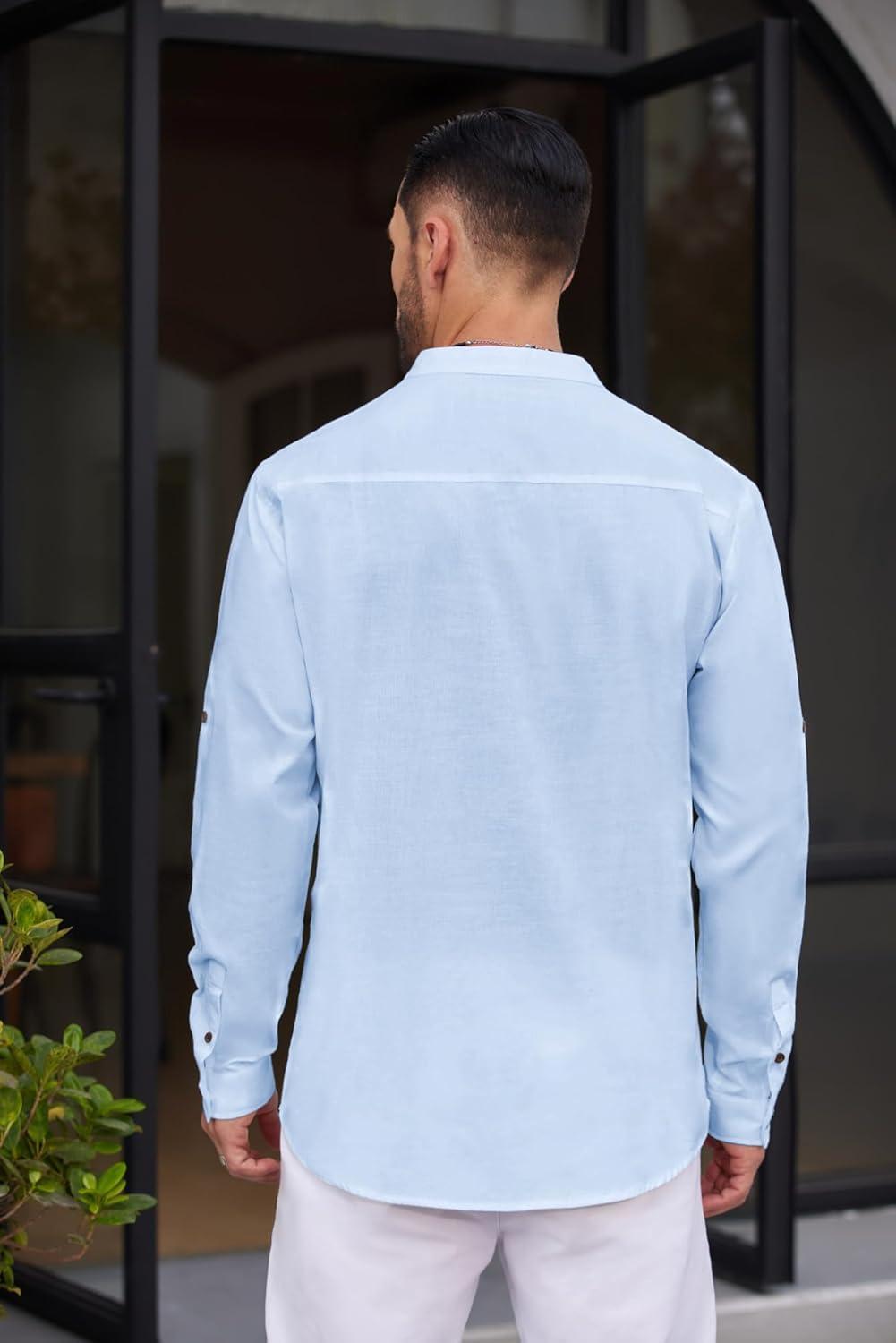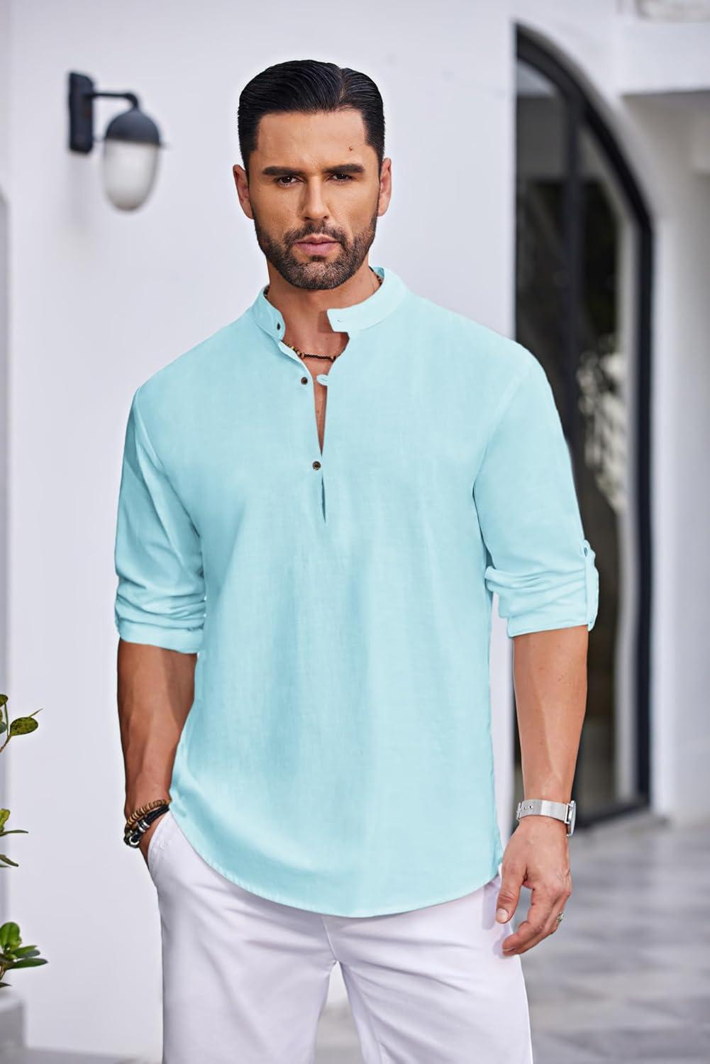 COOFANDY Men’s Casual Henley Shirt Band Collar Long Sleeve Shirt Beach Hippie Summer Button T Shirt(Light Blue)