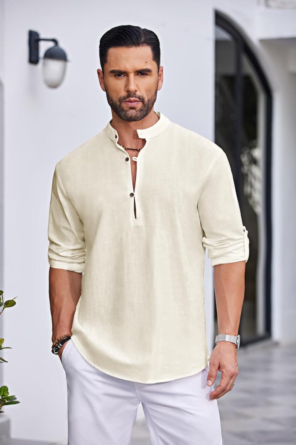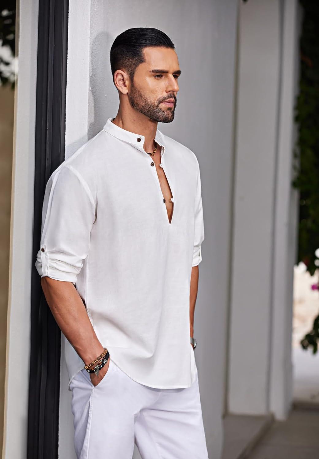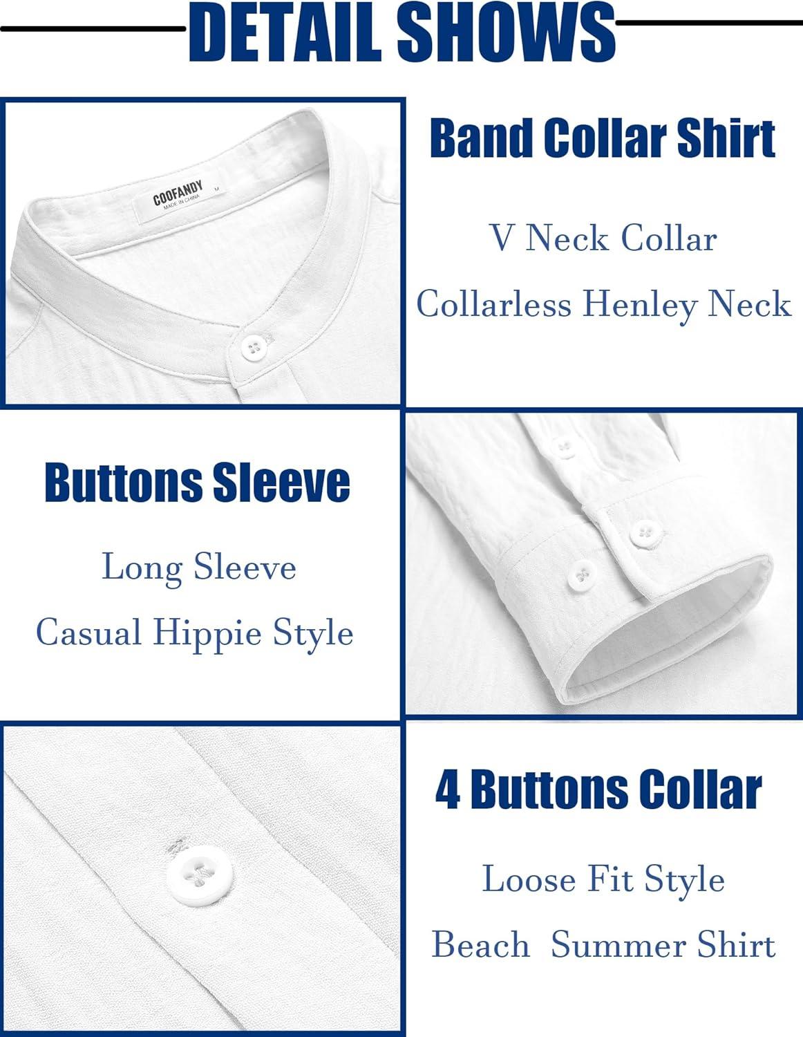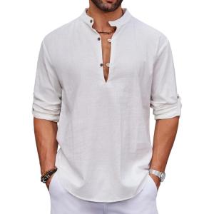 COOFANDY Men’s Casual Henley Shirt Band Collar Long Sleeve Shirt Beach Hippie Summer Button T Shirt(White)