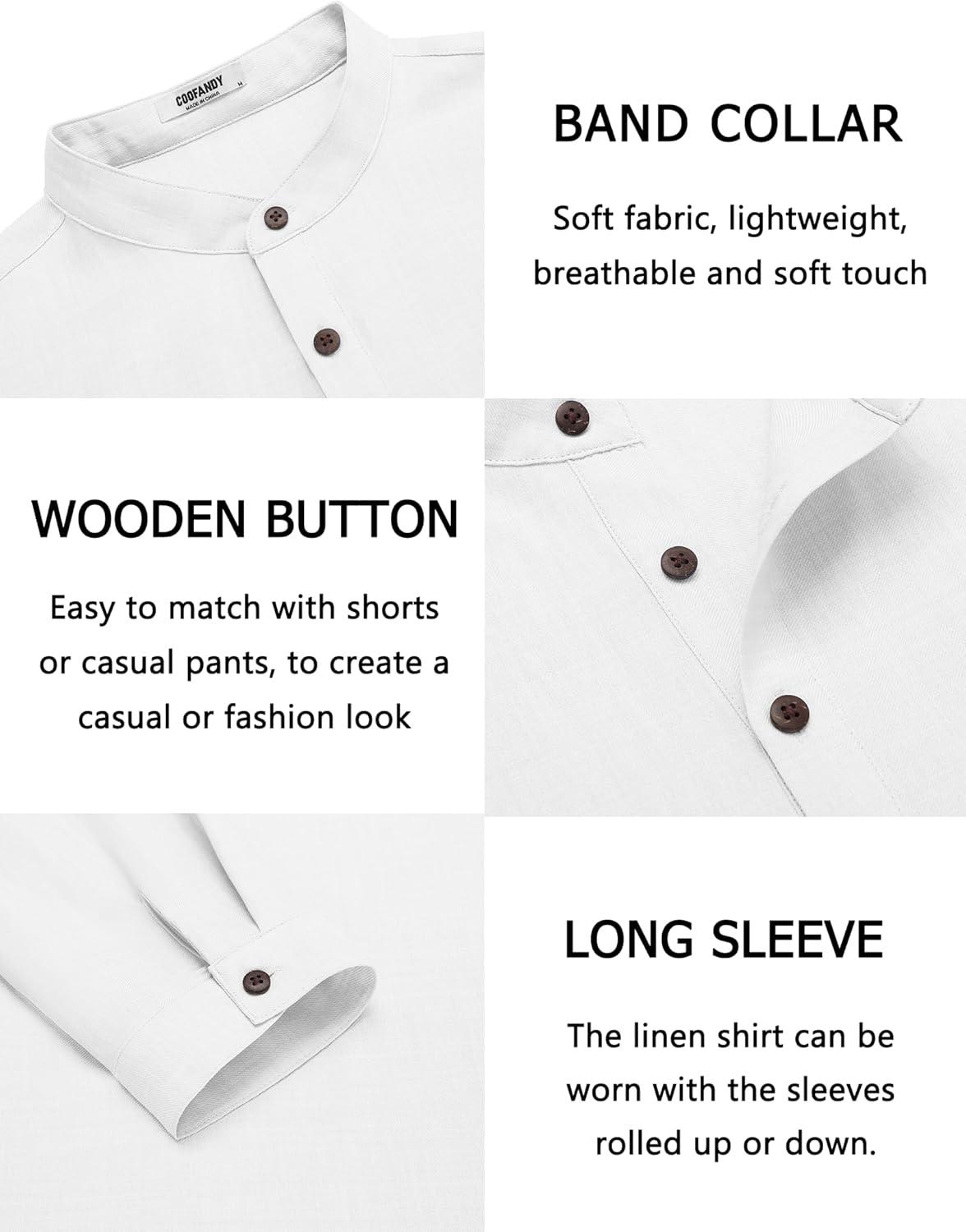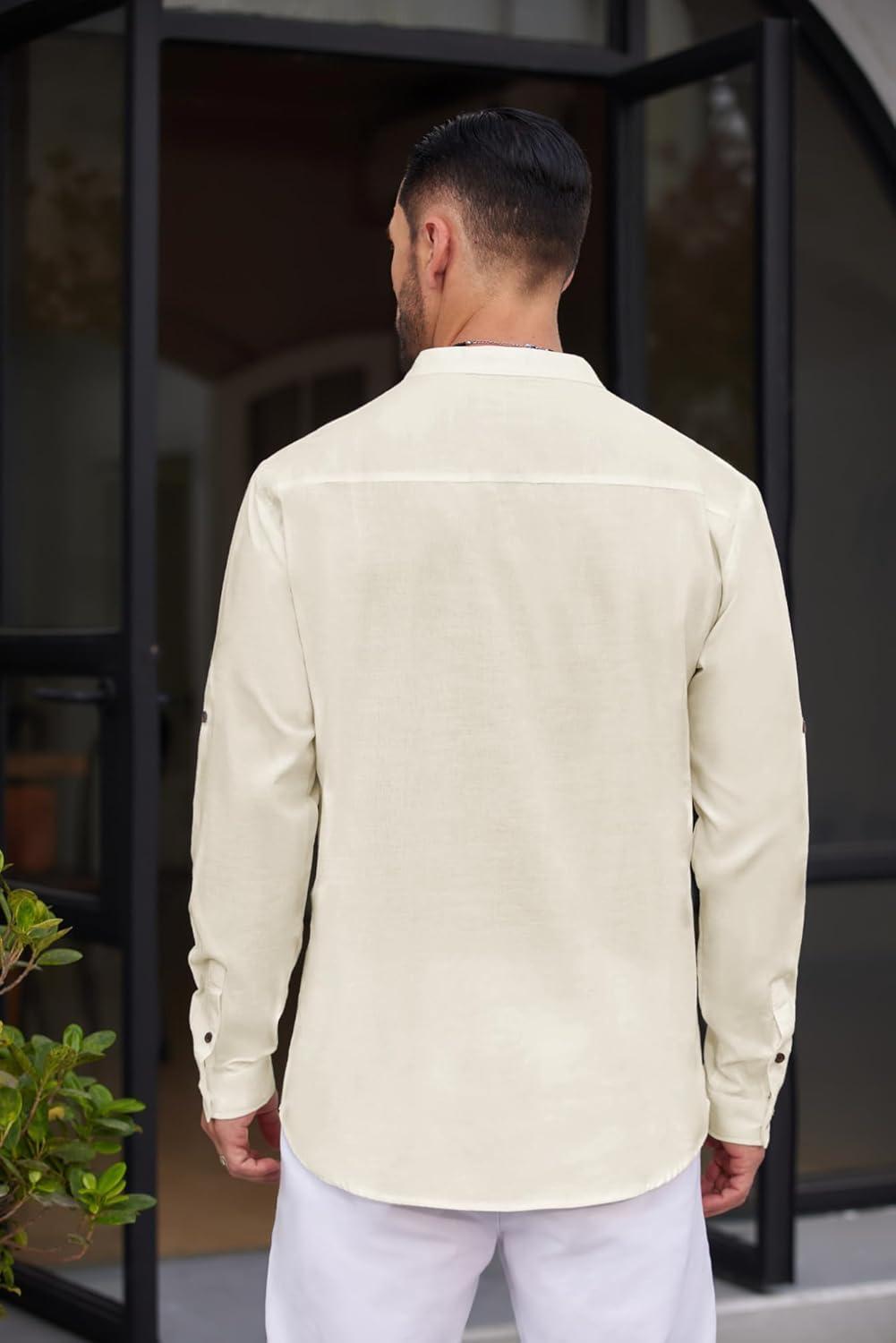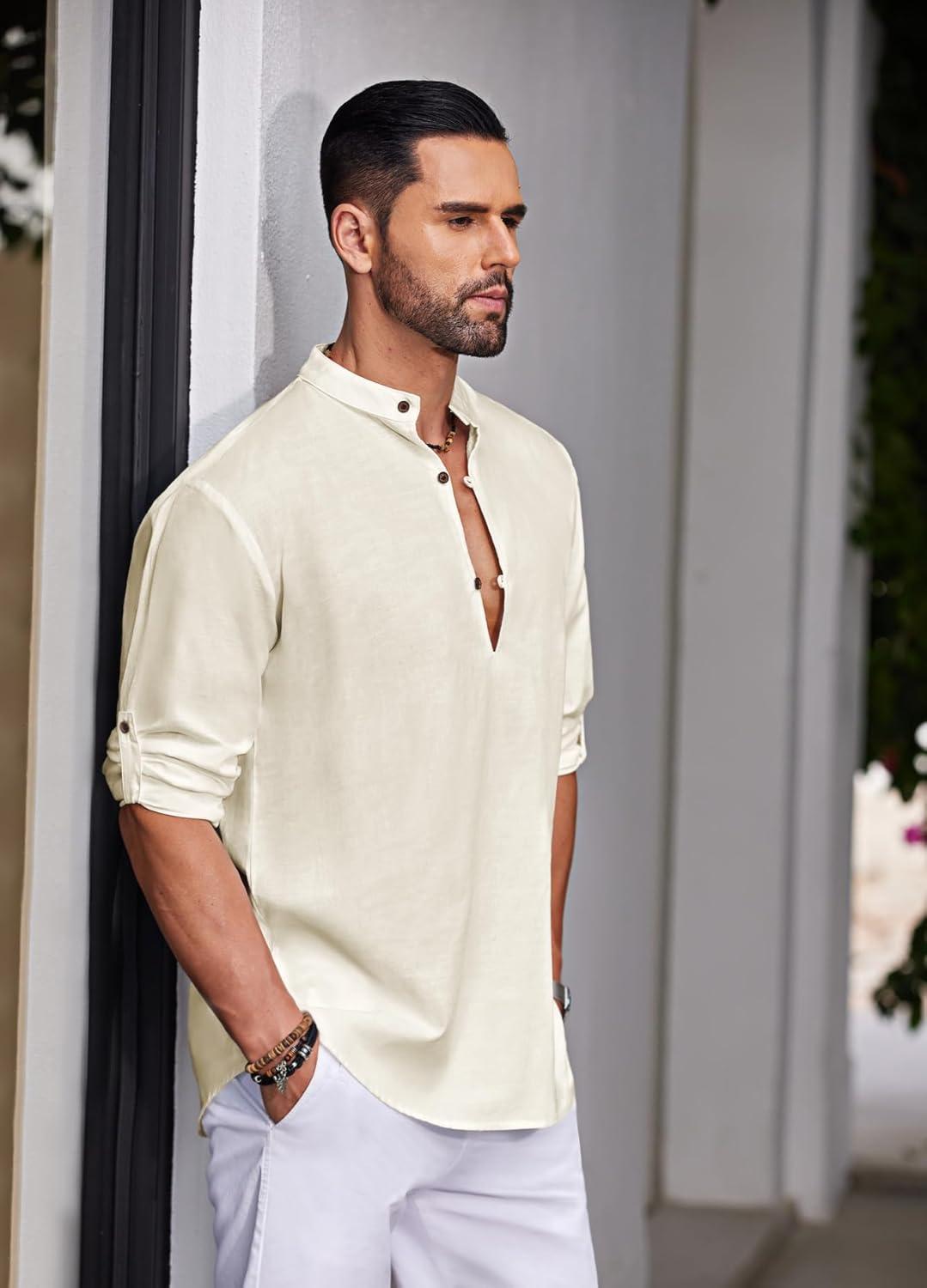 COOFANDY Men’s Casual Henley Shirt Band Collar Long Sleeve Shirt Beach Hippie Summer Button T Shirt(White)