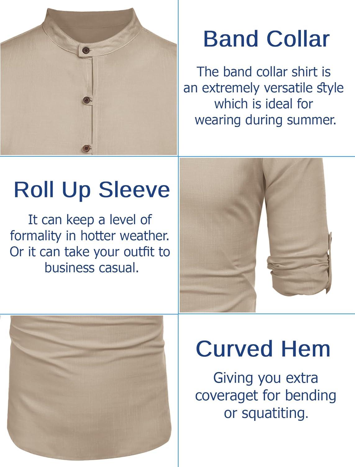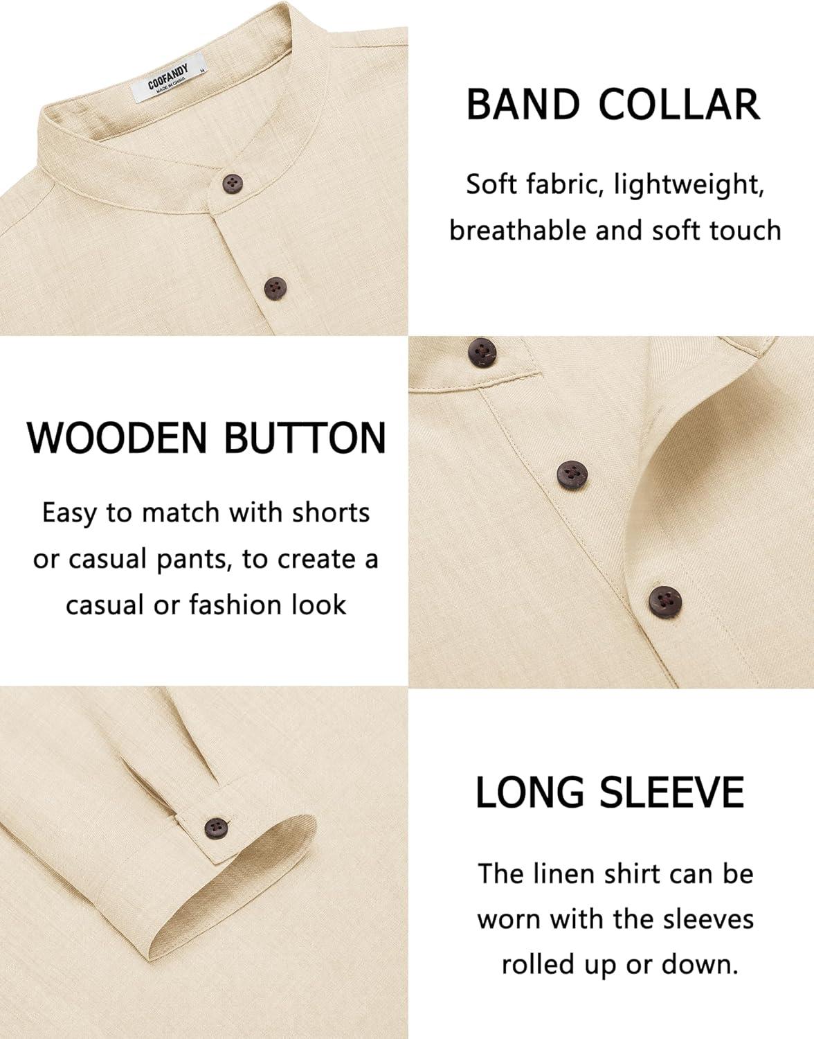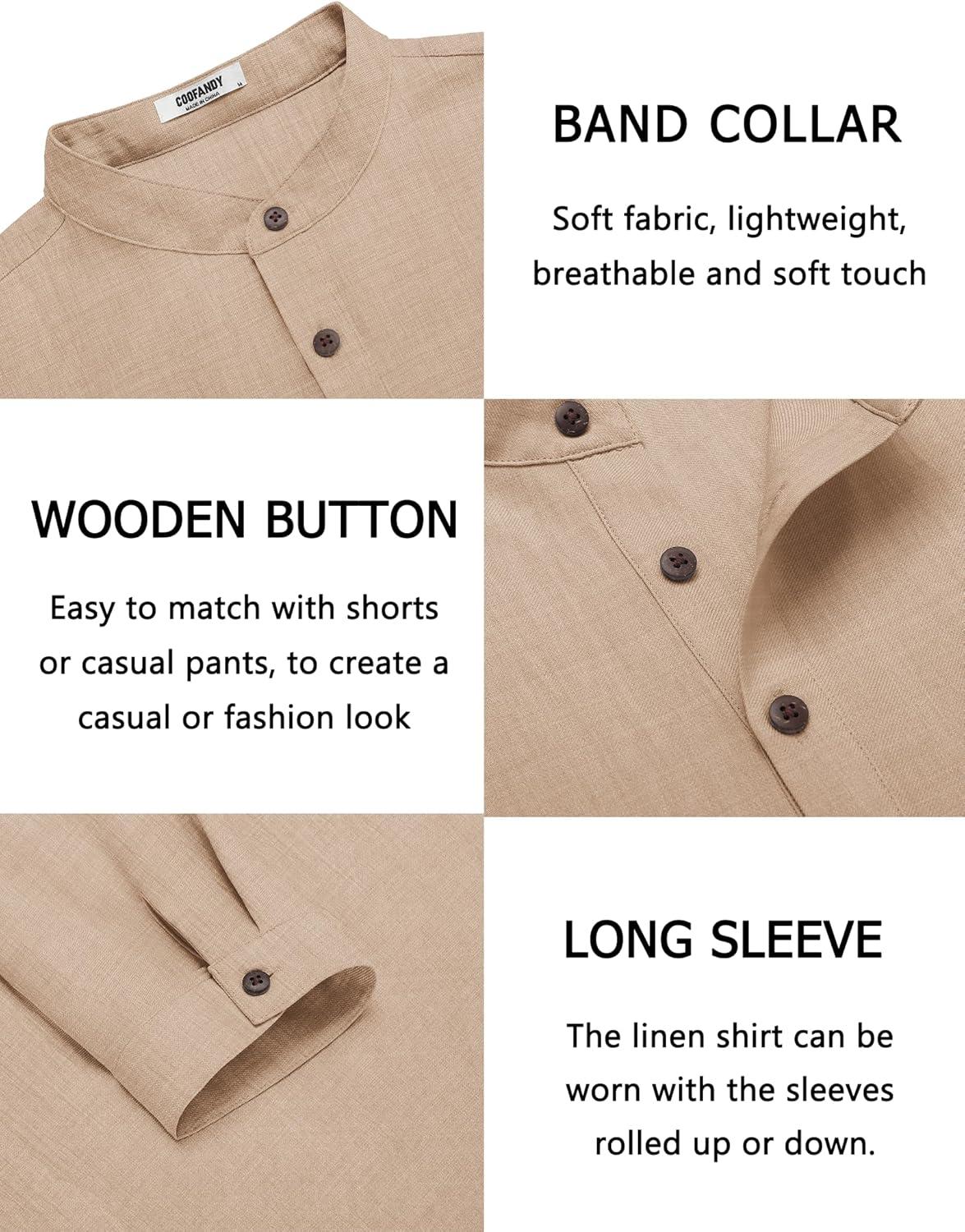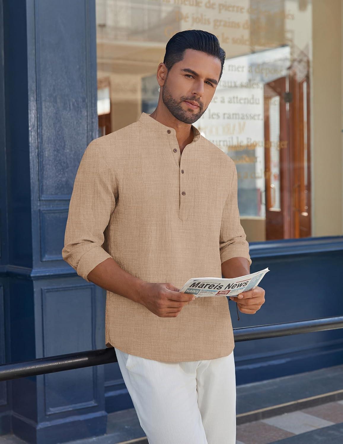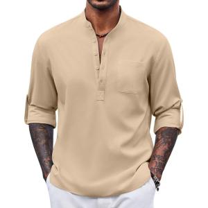 COOFANDY Men’s Casual Henley Shirt Long Sleeve Band Collar Shirts Summer Beach Hippie Button T-Shirts(Khaki)