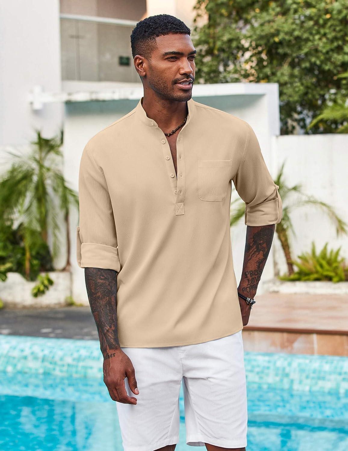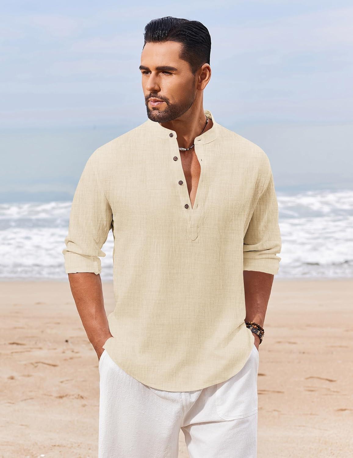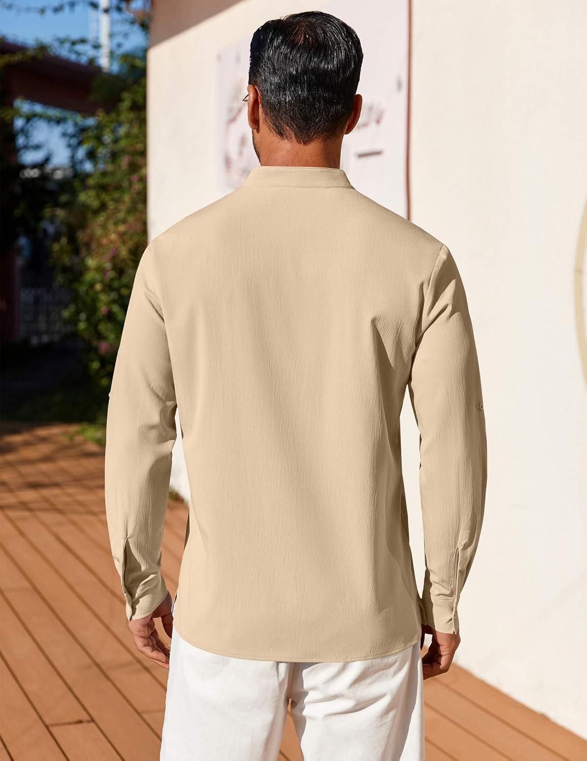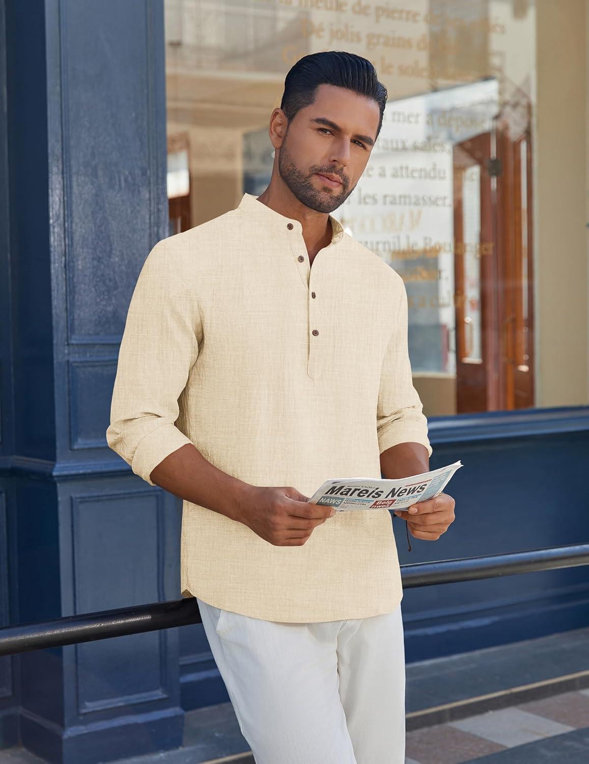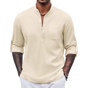COOFANDY Men’s Casual Henley Shirt Long Sleeve Band Collar Shirts Summer Beach Hippie Button T-Shirts(Beige)