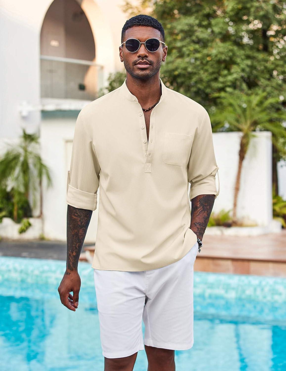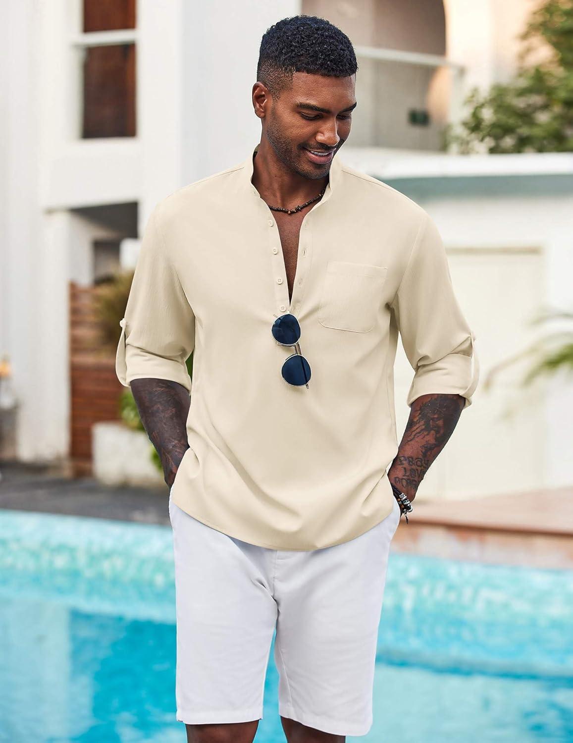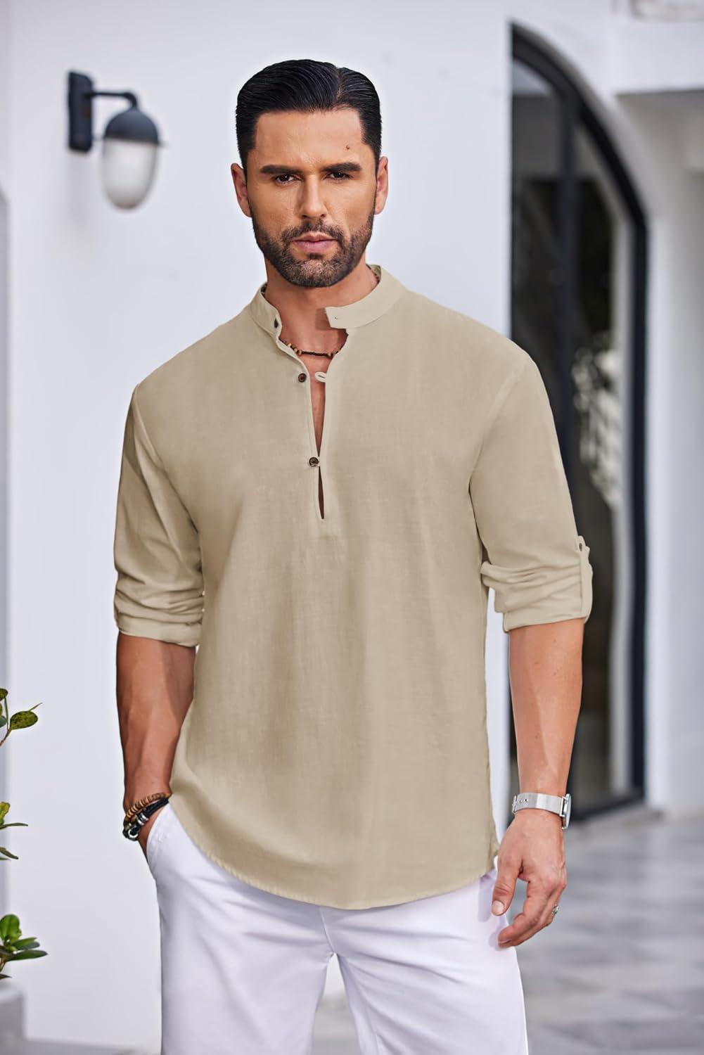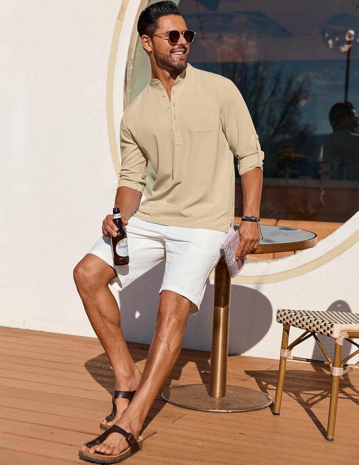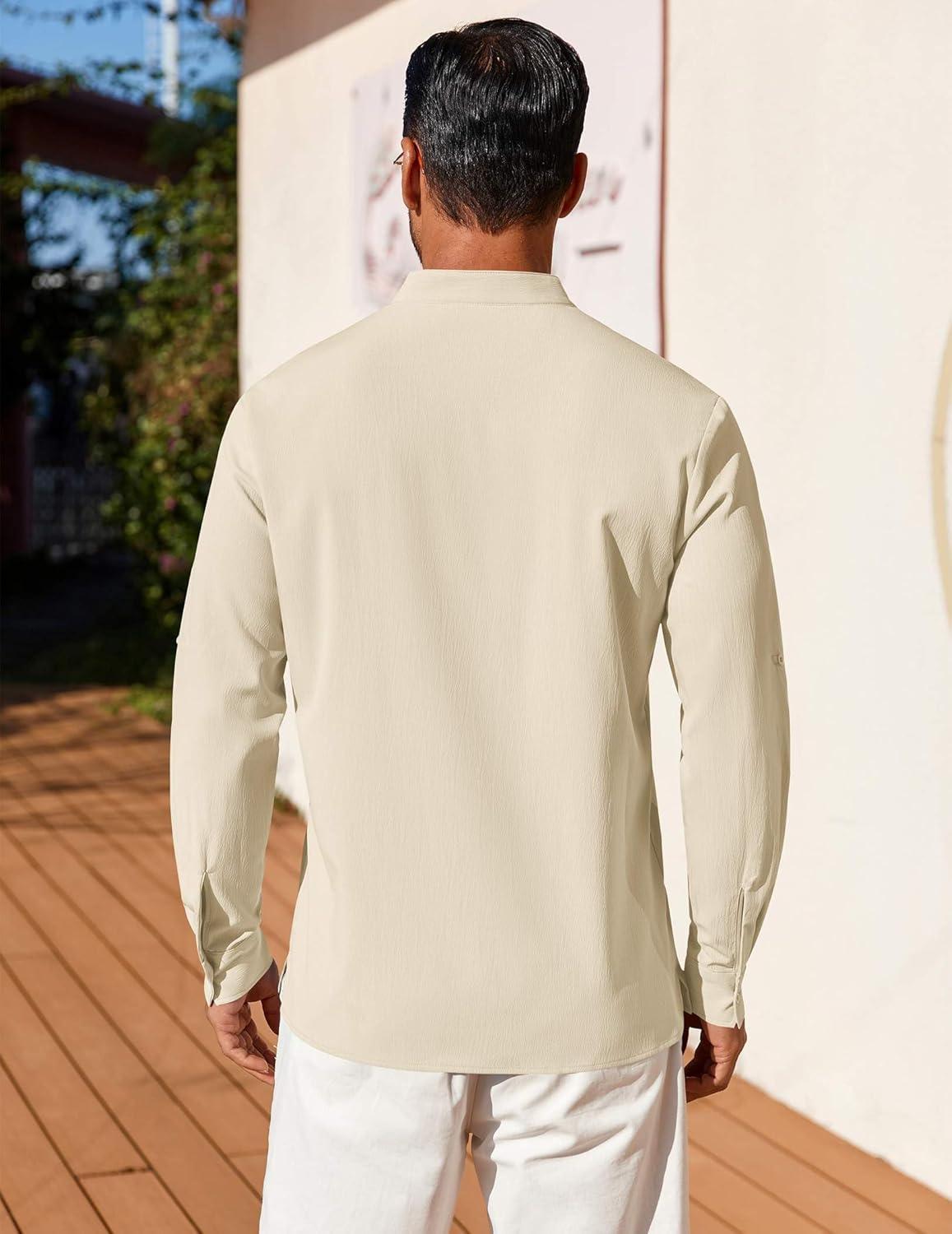 COOFANDY Men’s Casual Henley Shirt Long Sleeve Band Collar Shirts Summer Beach Hippie Button T-Shirts(Beige)
