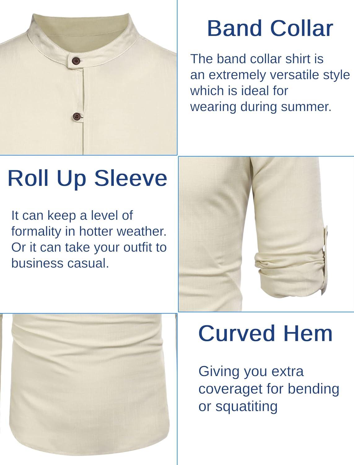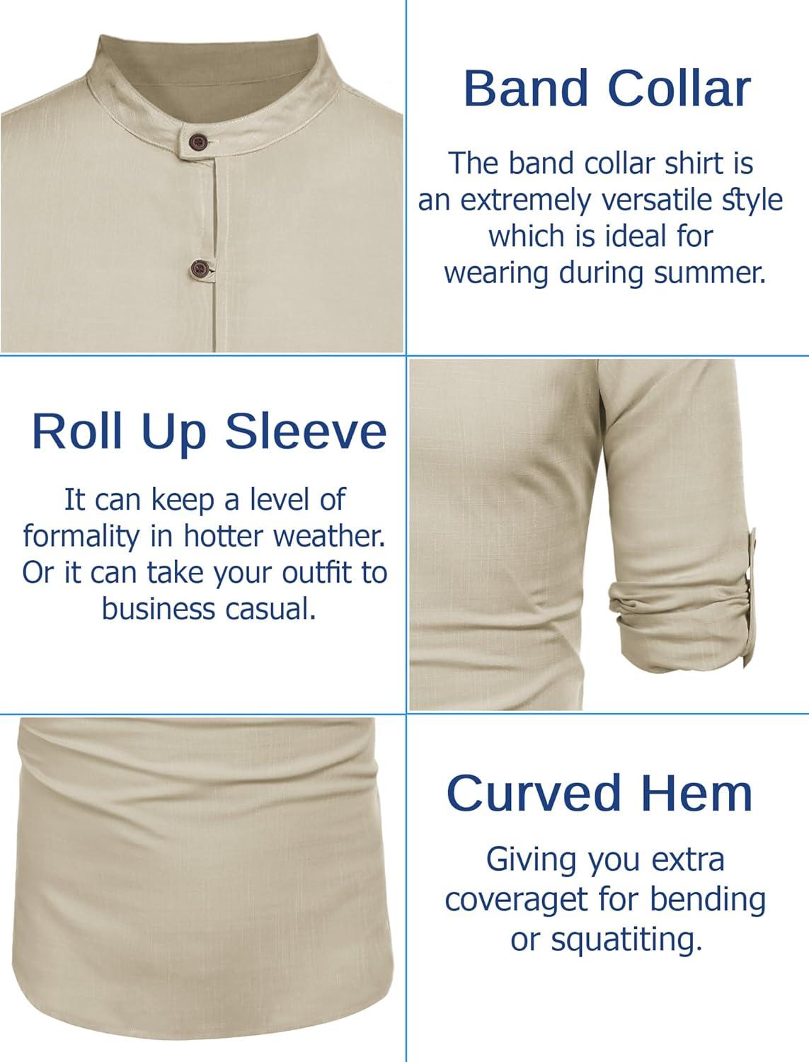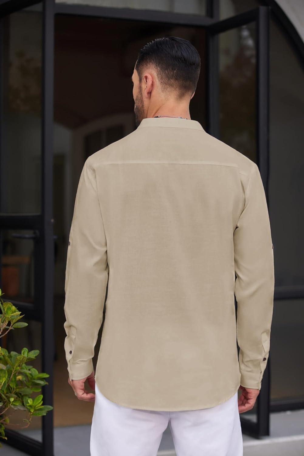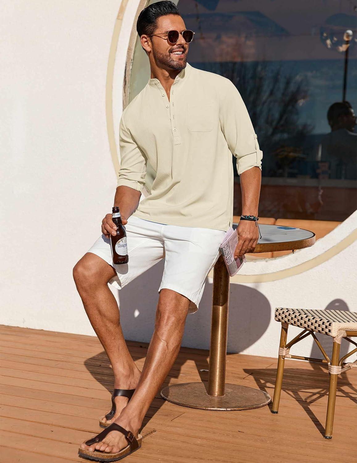 COOFANDY Men’s Casual Henley Shirt Long Sleeve Band Collar Shirts Summer Beach Hippie Button T-Shirts(Beige)