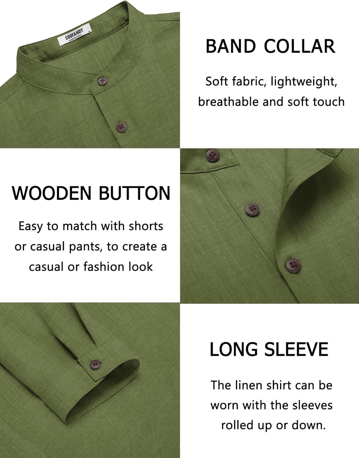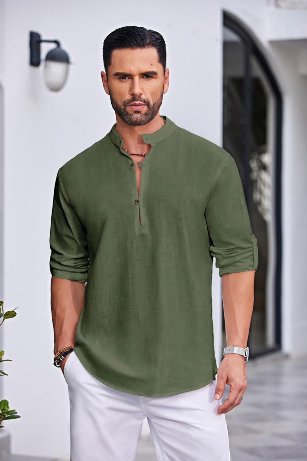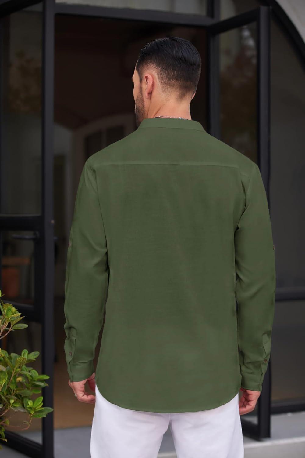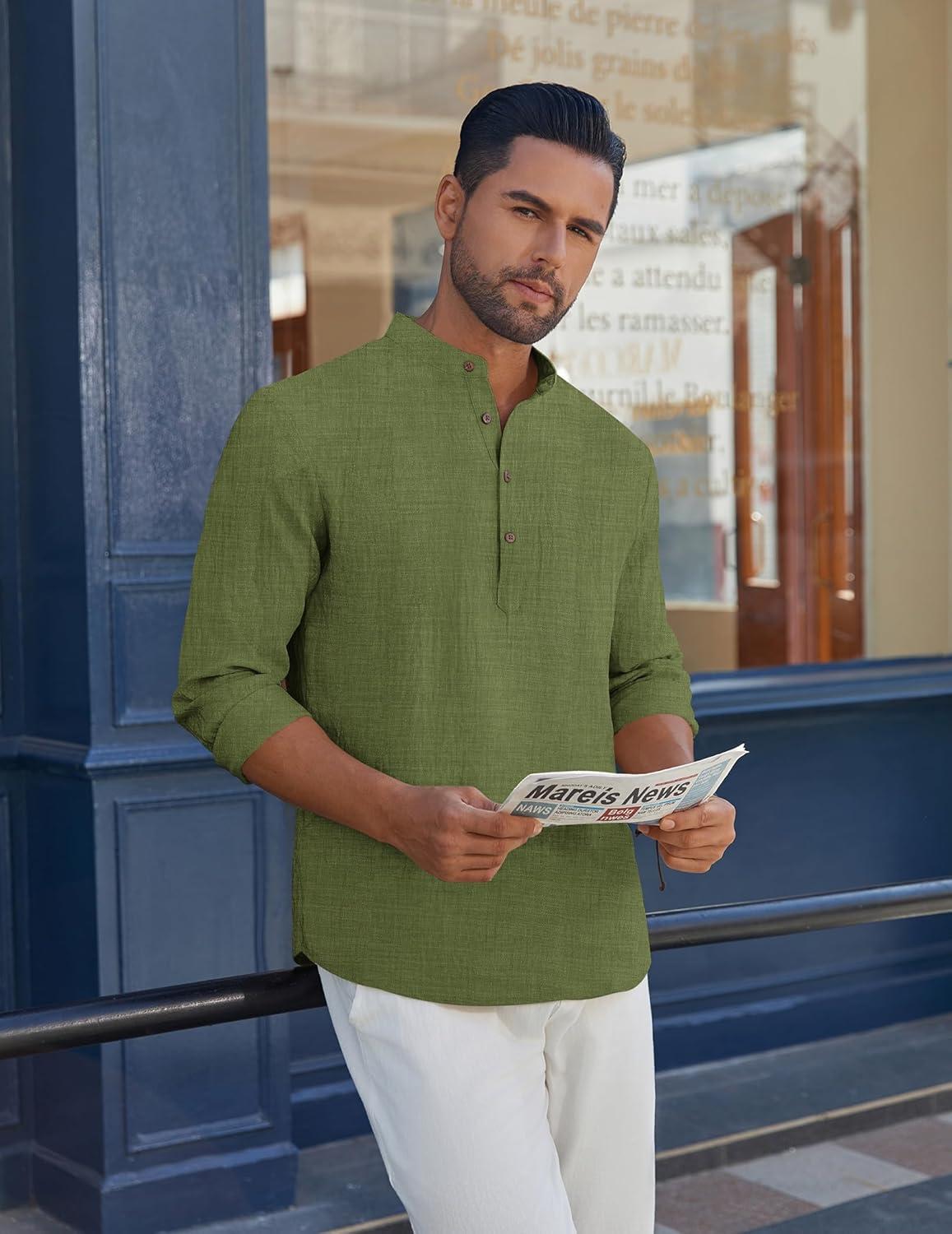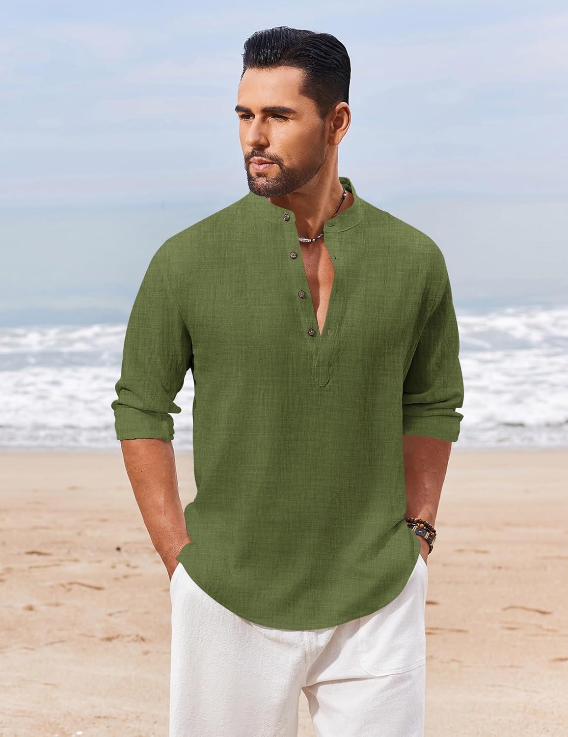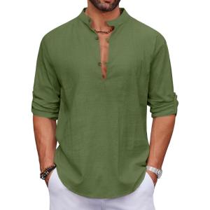 COOFANDY Men’s Cotton Linen Henley Shirt Casual Beach Hippie Shirts Long Sleeve T-Shirts(Army Green)