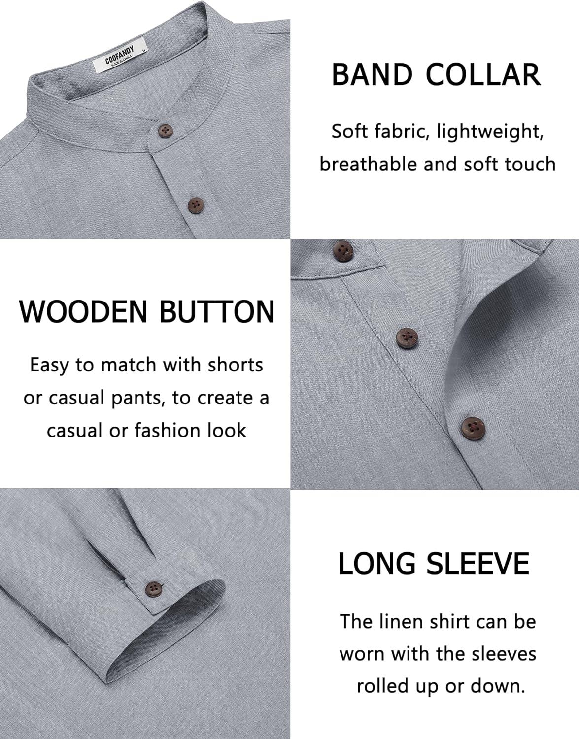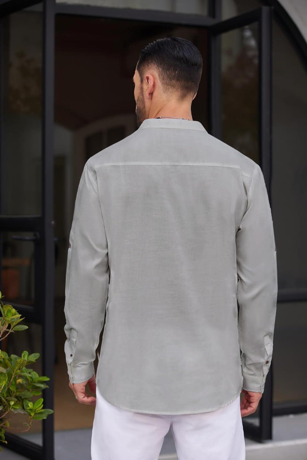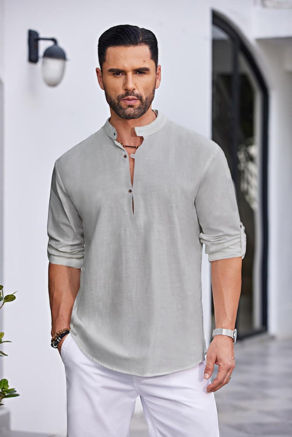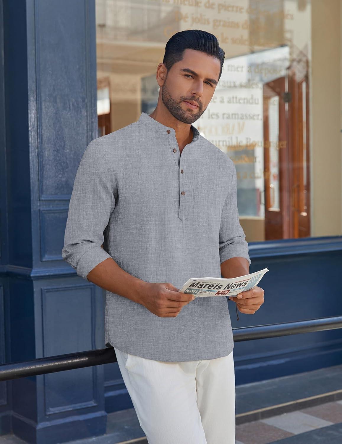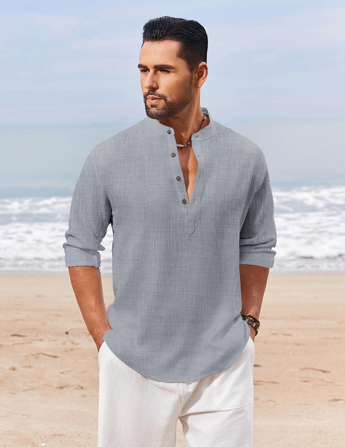 COOFANDY Men’s Cotton Linen Henley Shirt Casual Beach Hippie Shirts Long Sleeve T-Shirts(Light Grey)