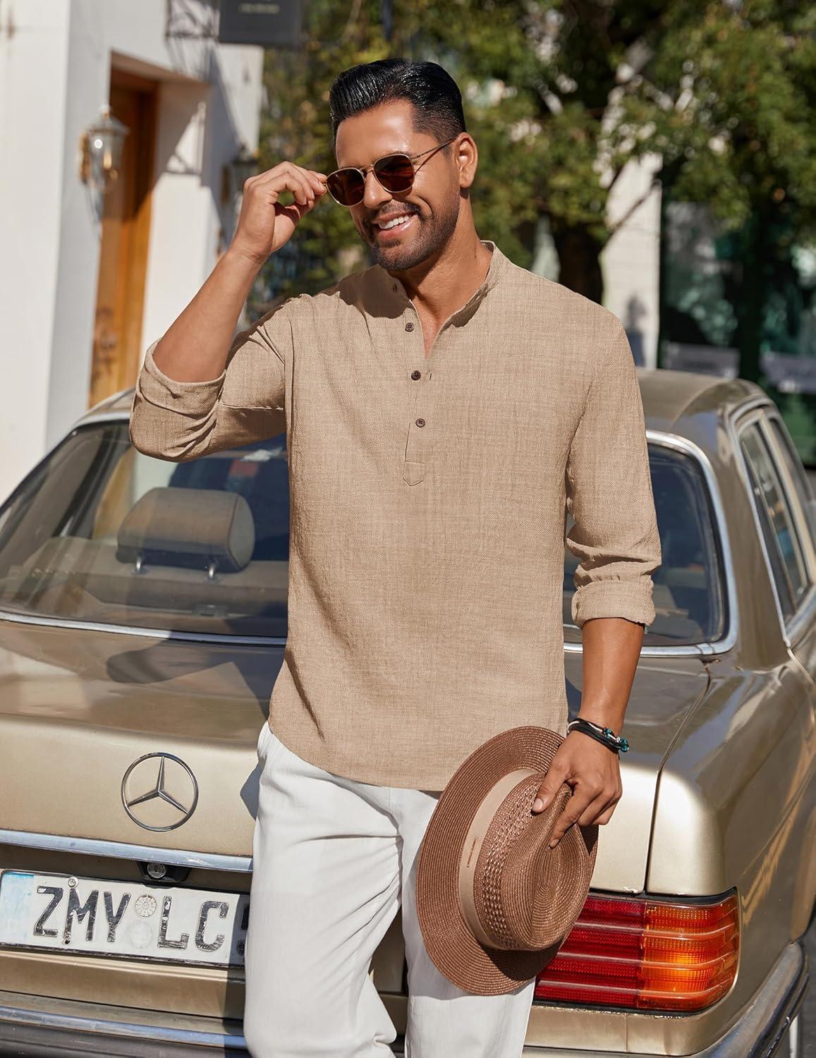 COOFANDY Men’s Cotton Linen Henley Shirt Casual Beach Hippie Shirts Long Sleeve T-Shirts(Khaki Henley)