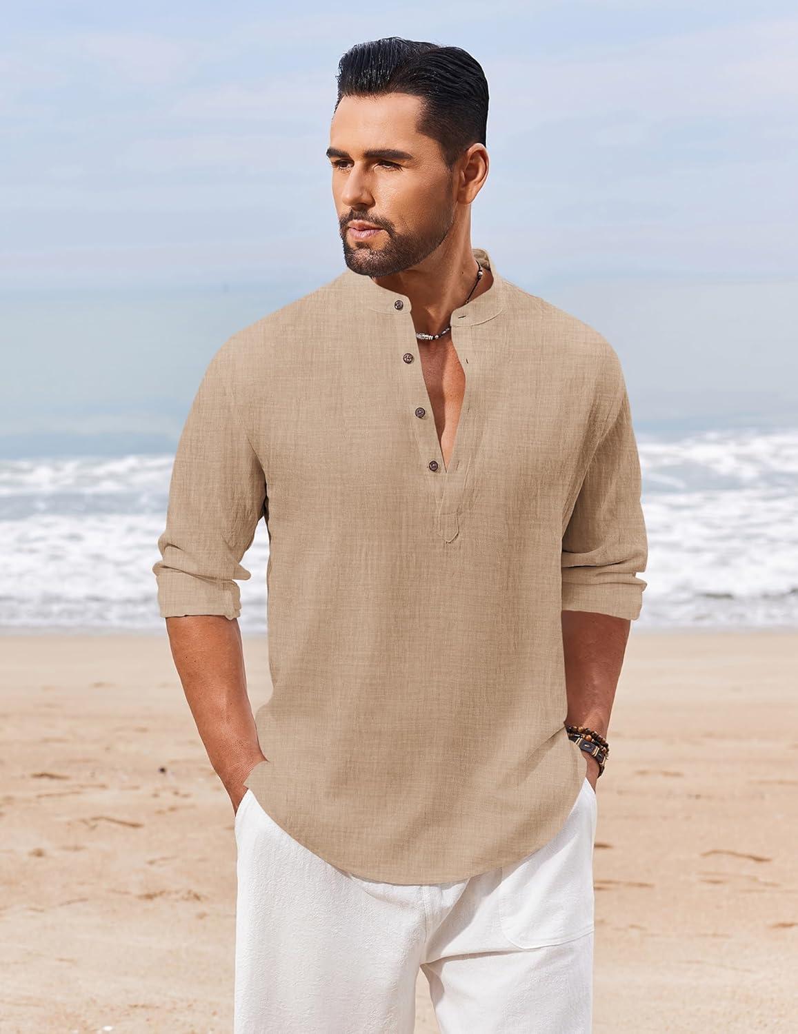 COOFANDY Men’s Cotton Linen Henley Shirt Casual Beach Hippie Shirts Long Sleeve T-Shirts(Light Khaki)