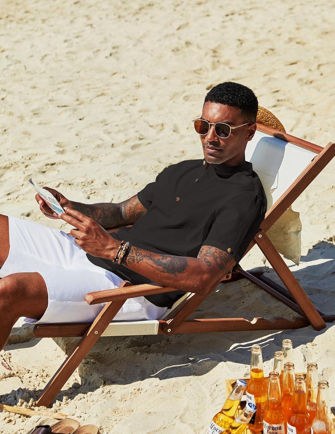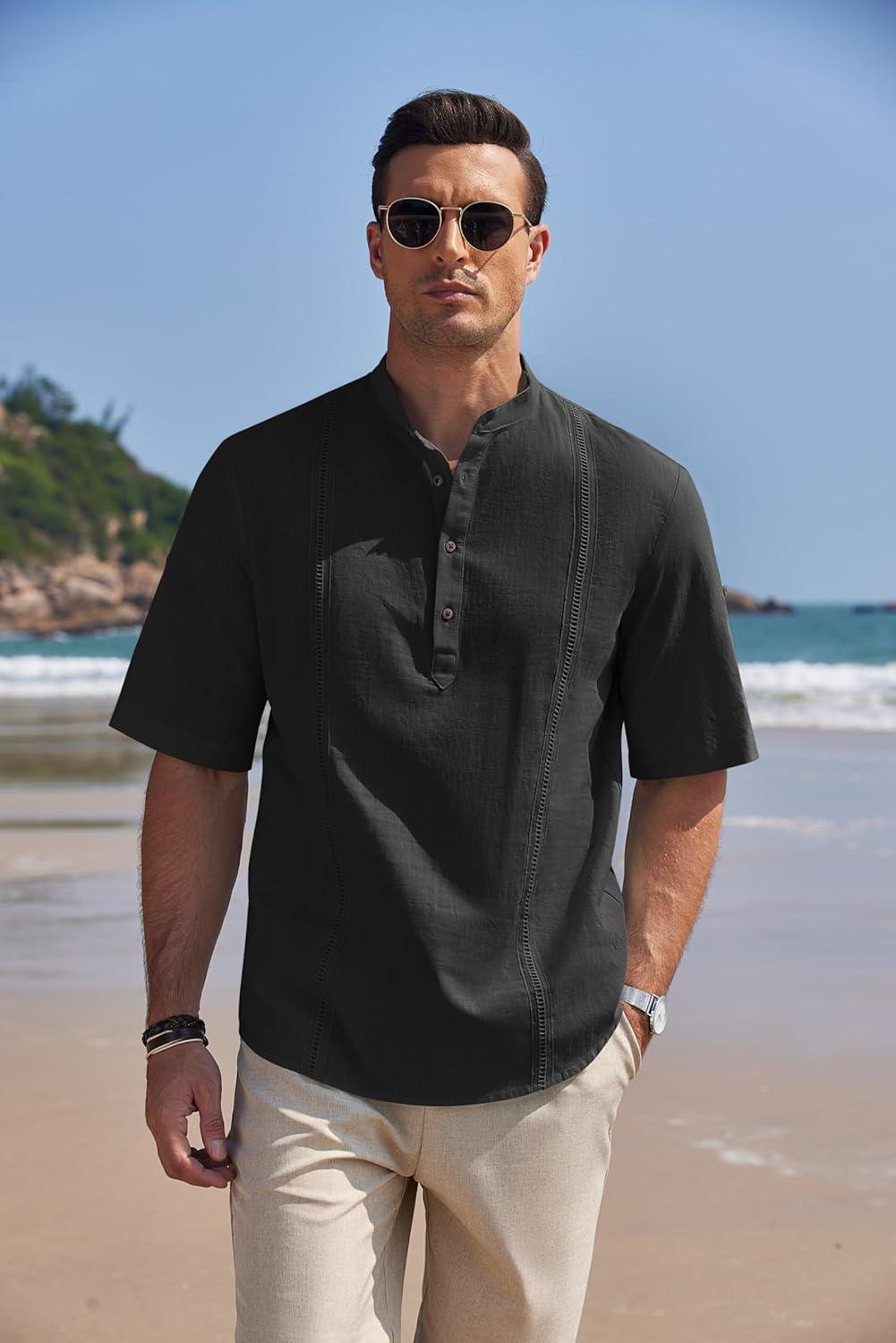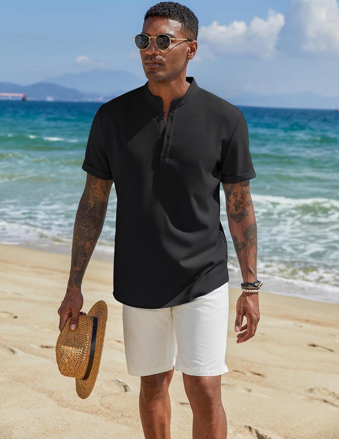 COOFANDY Henley Shirts for Men Short Sleeve Band Collar Casual Shirt Summer Hippie Vacation Beach T Shirts with Pocket(Black)