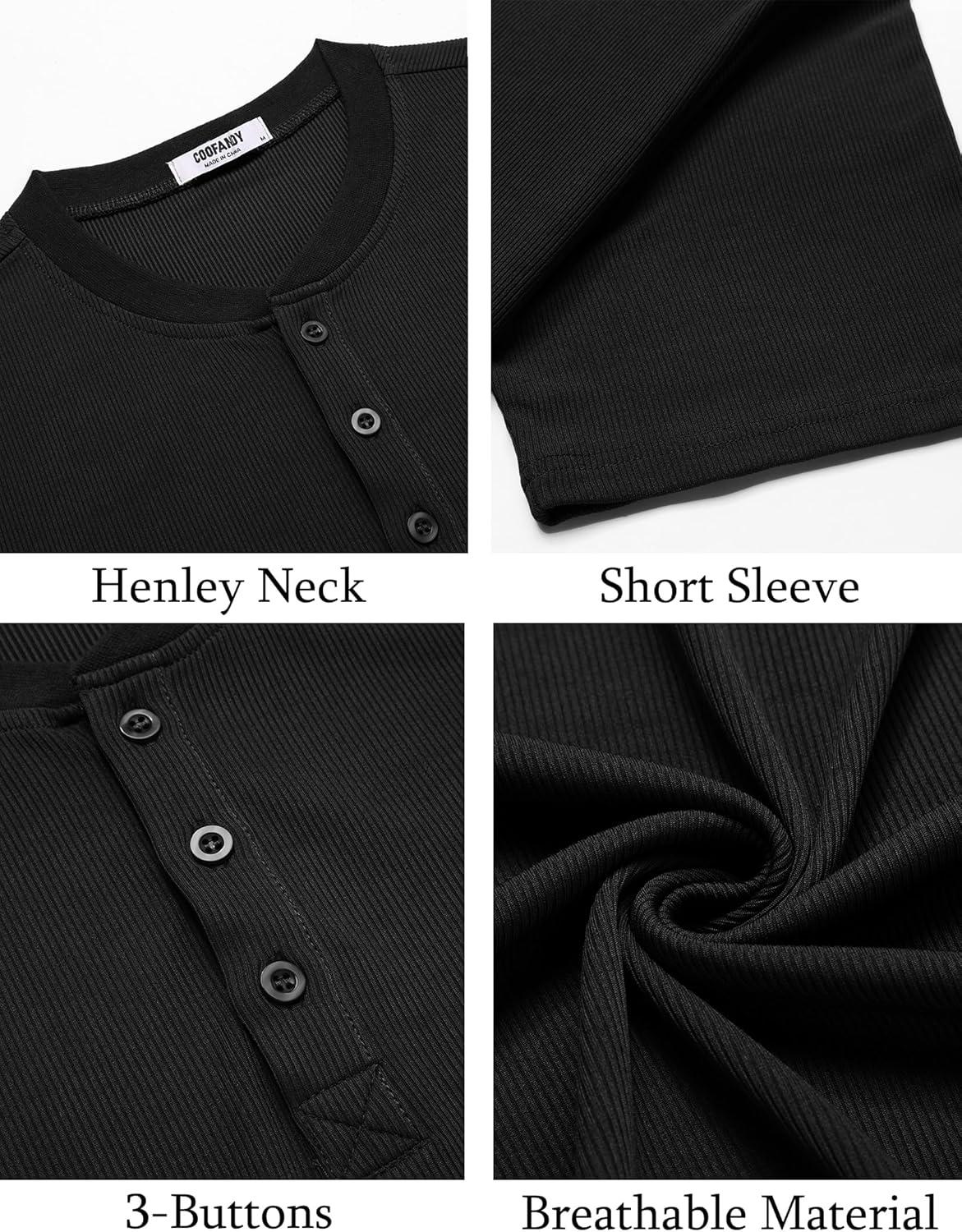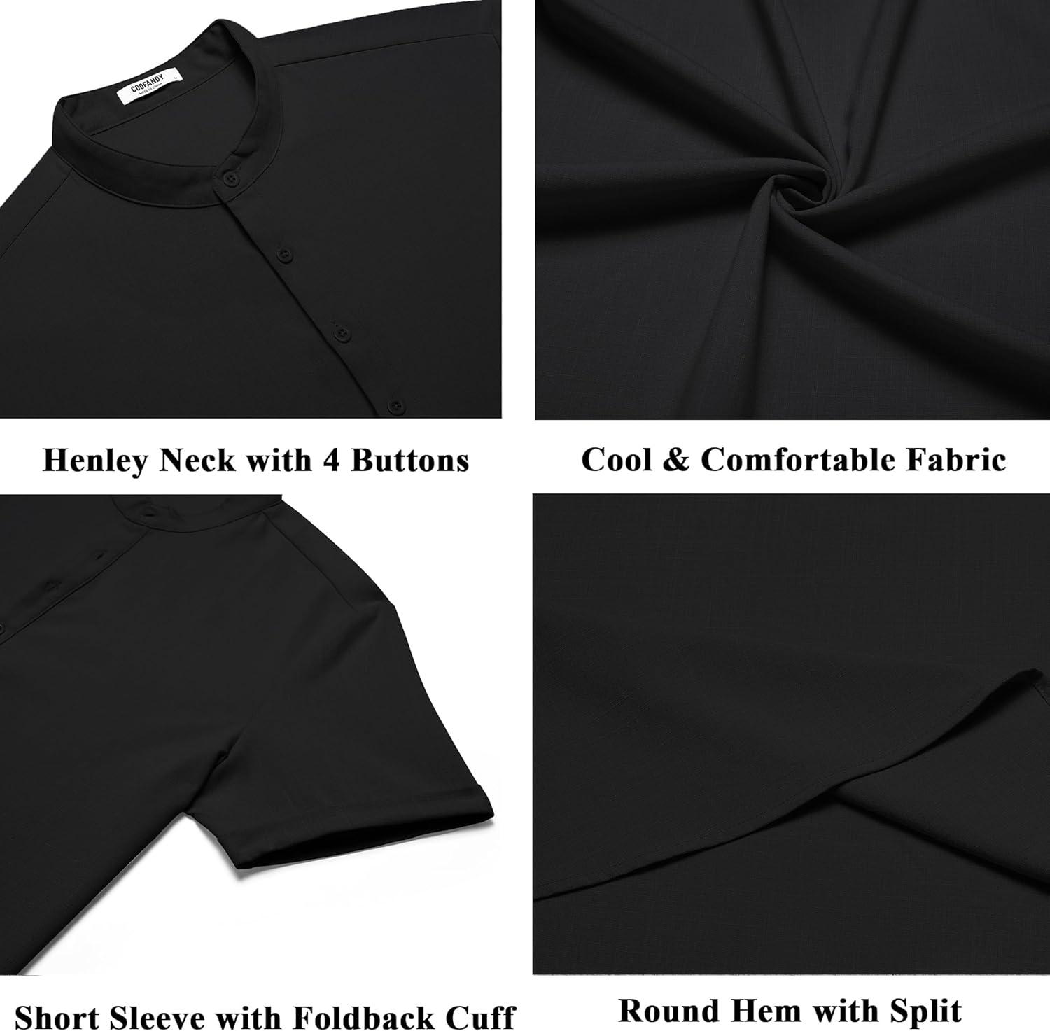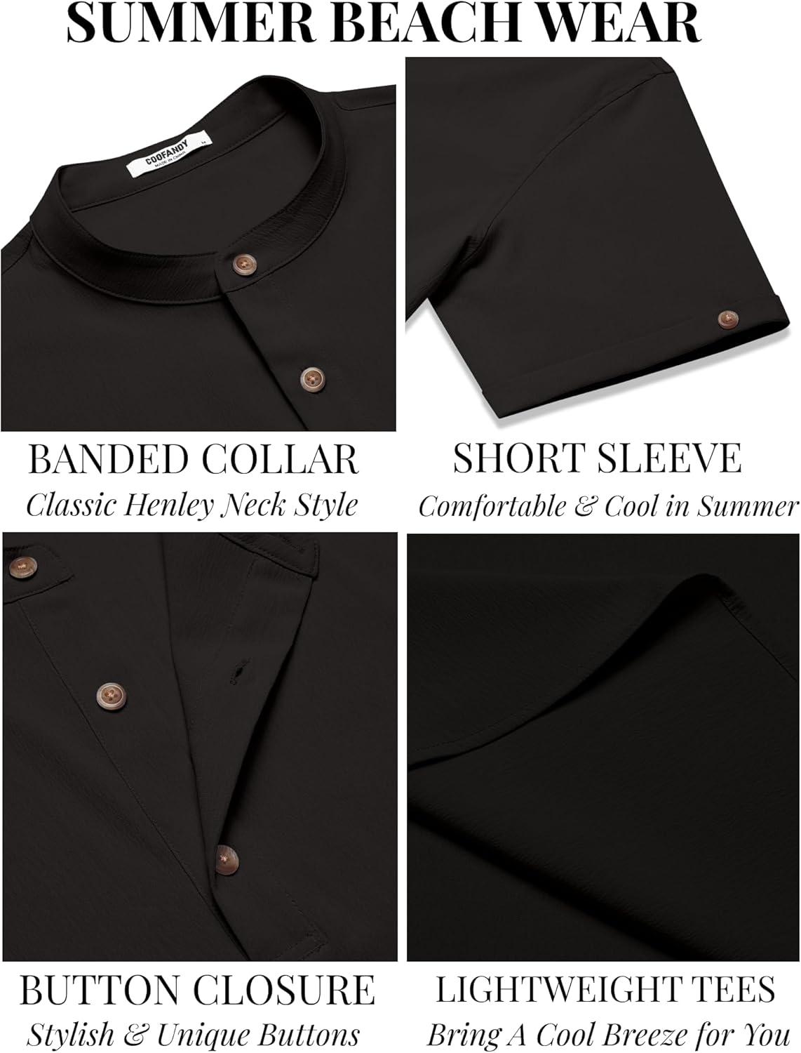COOFANDY Men’s Casual Henley Shirts Short Sleeve Summer Beach T-Shirts Banded Collar Henleys Button Tee Shirt(Black)