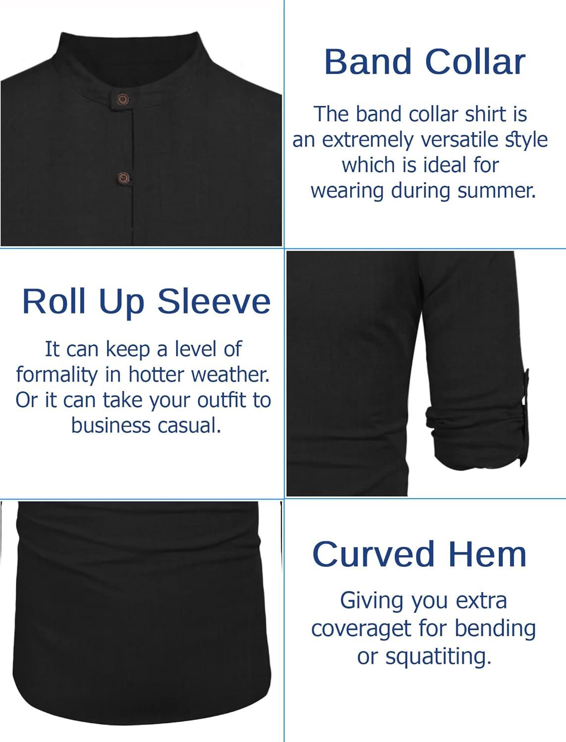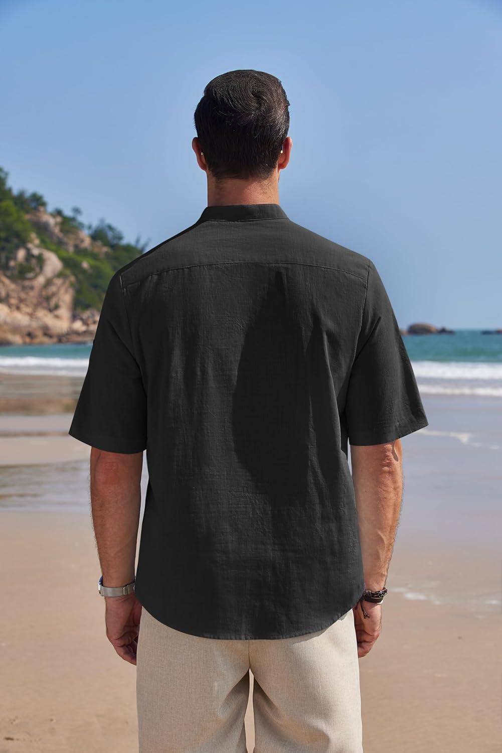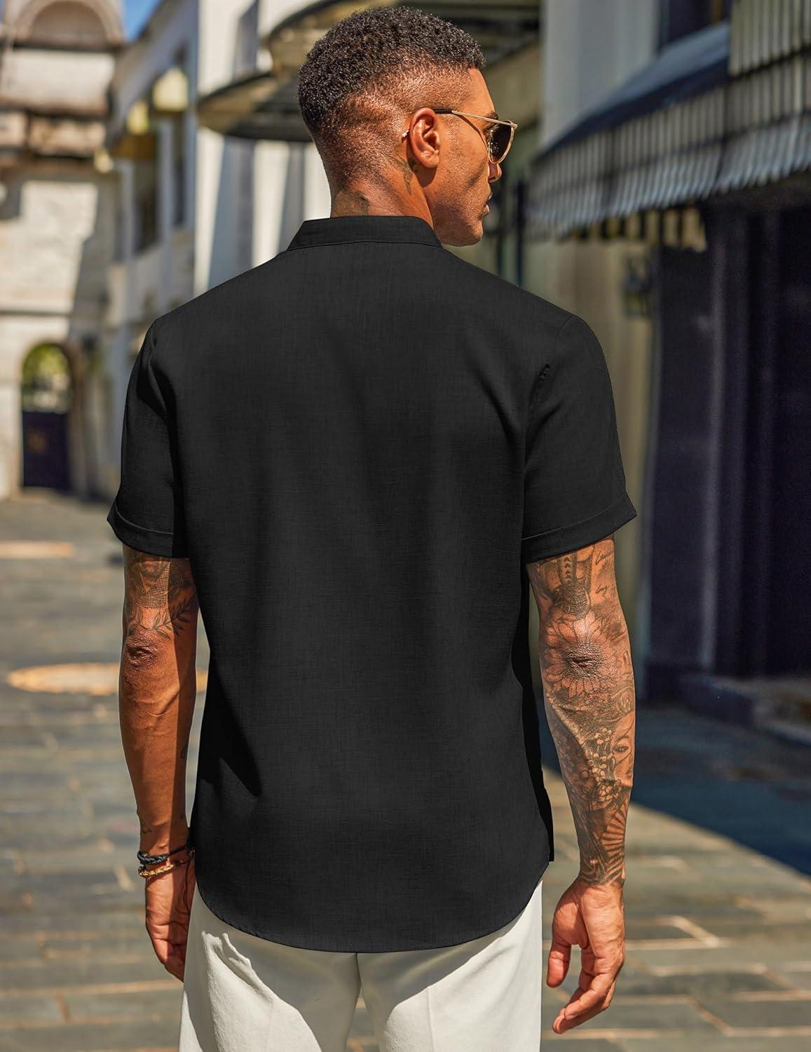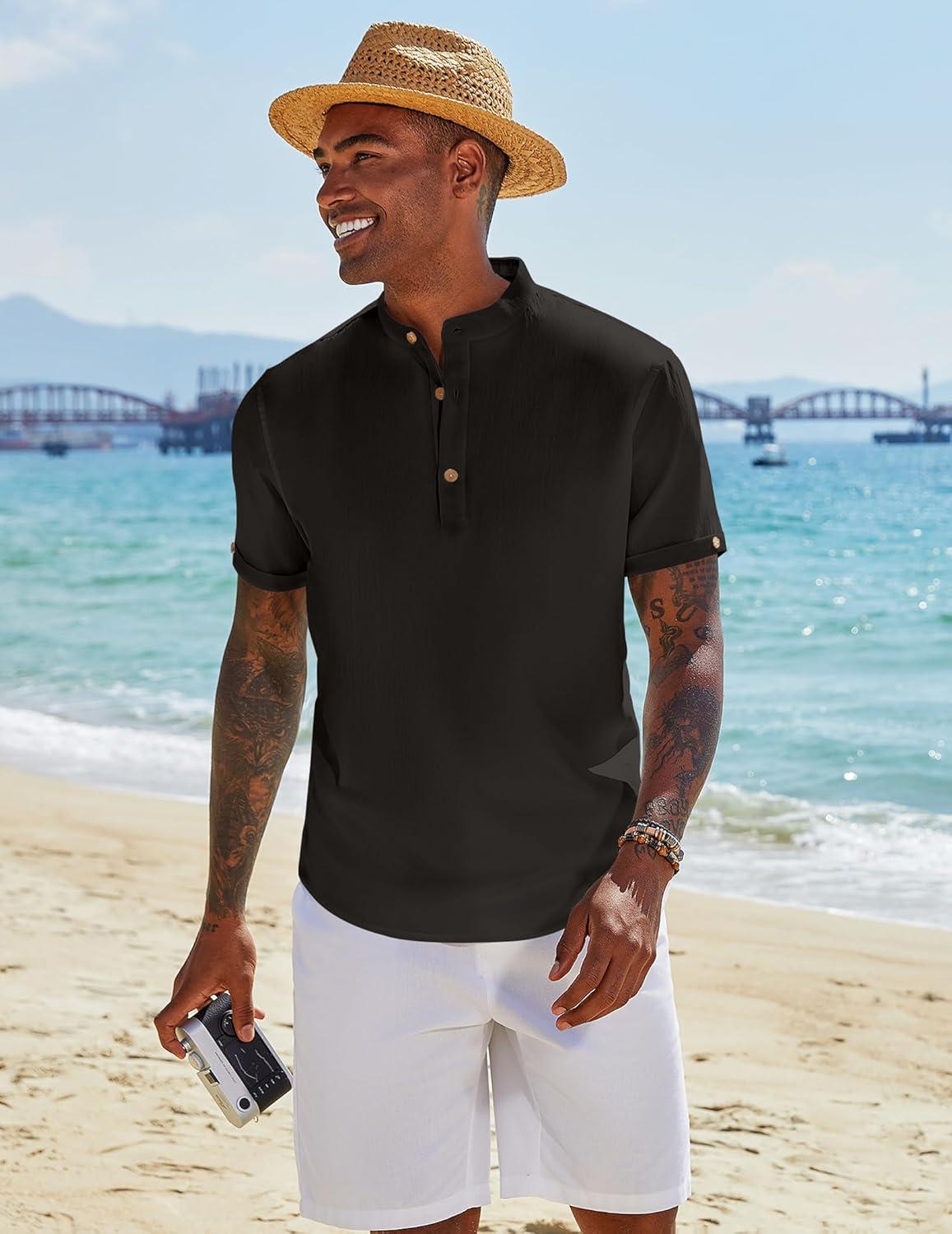 COOFANDY Men’s Casual Linen Henley Shirts Short Sleeve Band Collar Summer Beach Vacation T-Shirts(Black)