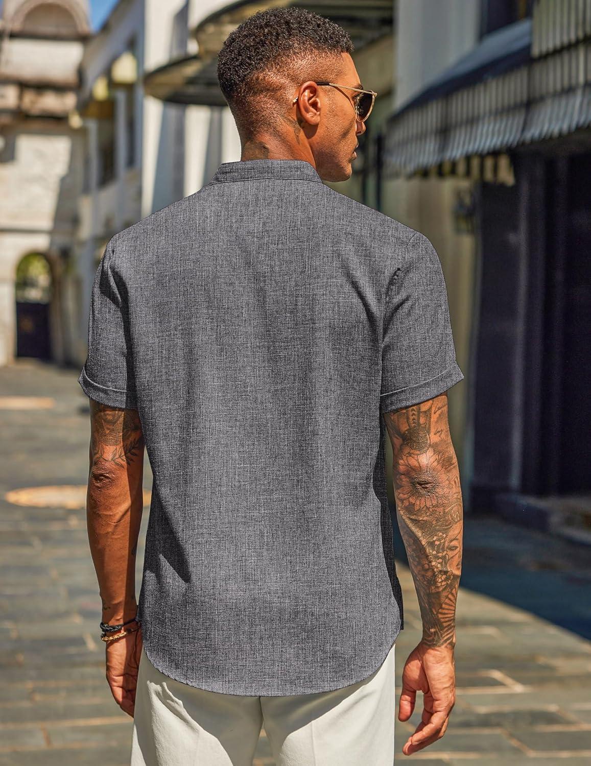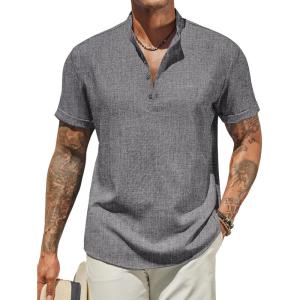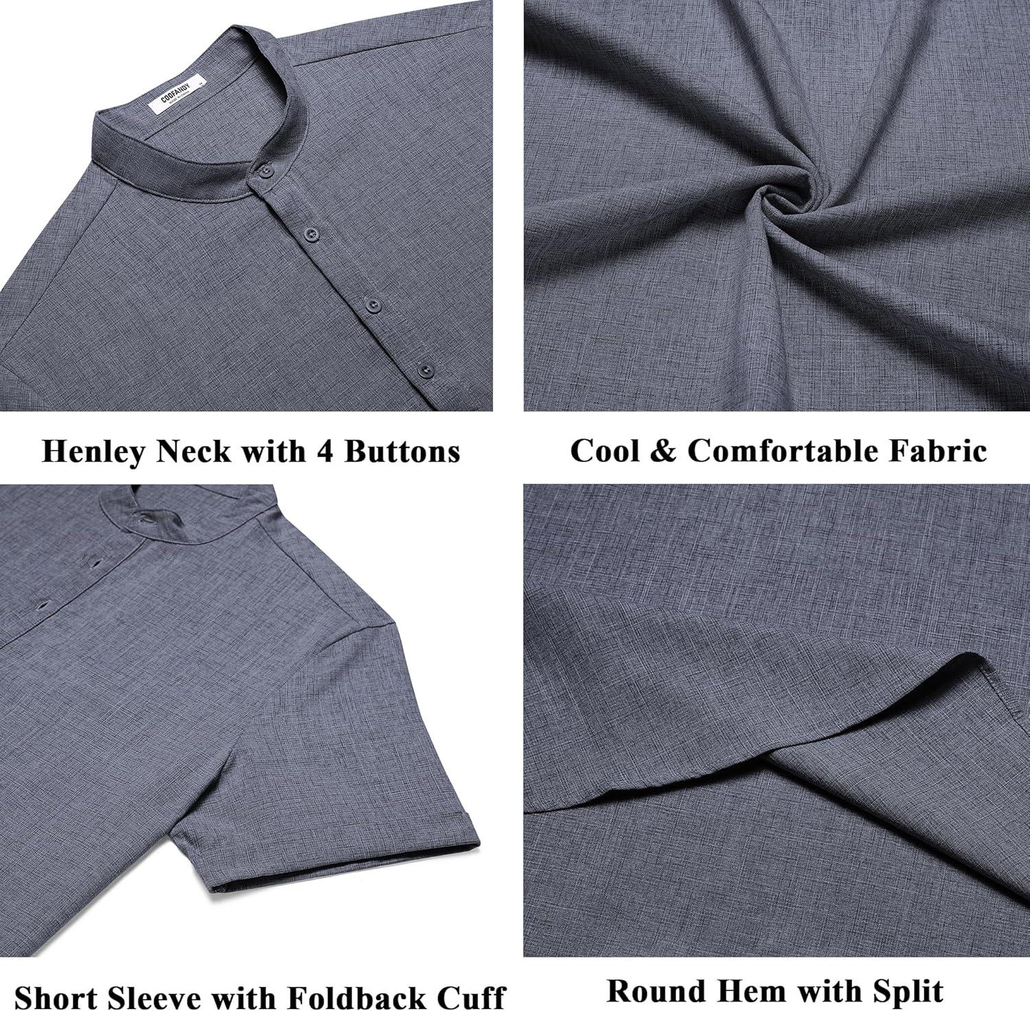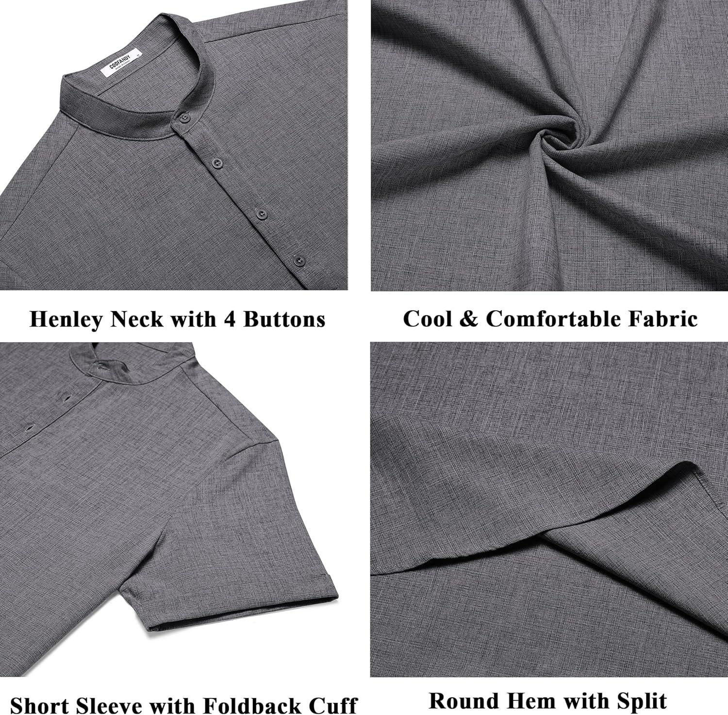 COOFANDY Men’s Casual Linen Henley Shirts Short Sleeve Band Collar Summer Beach Vacation T-Shirts(Dark Grey)