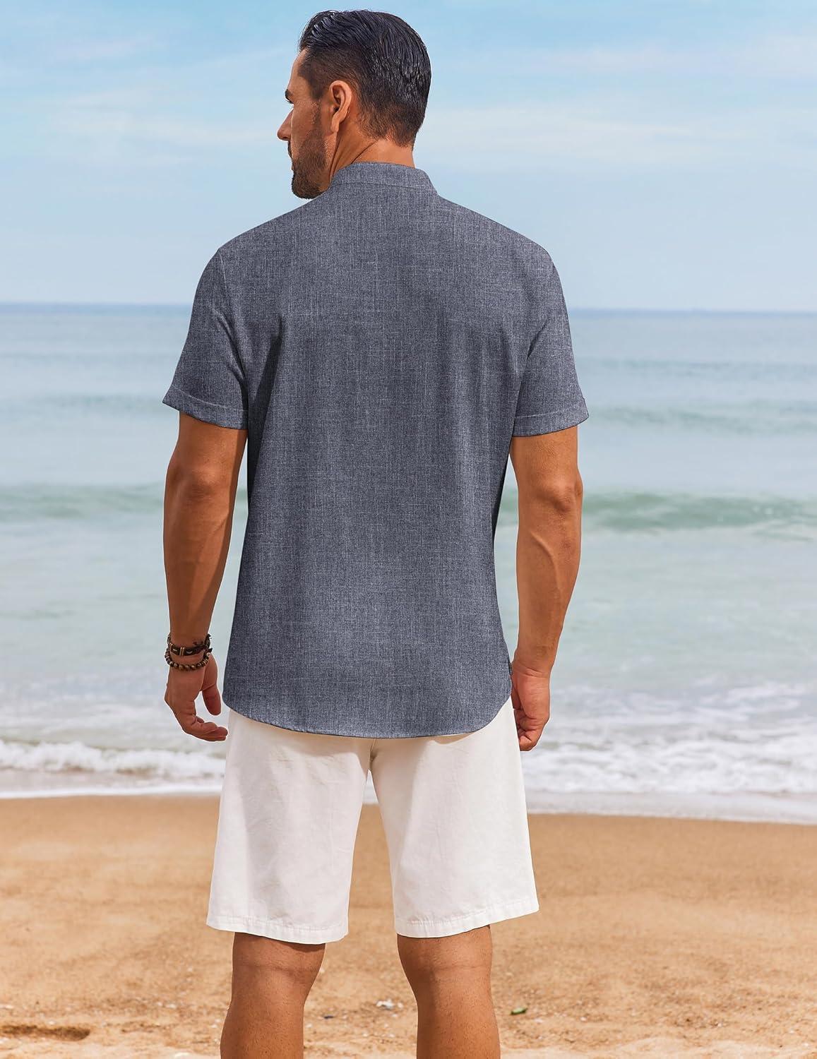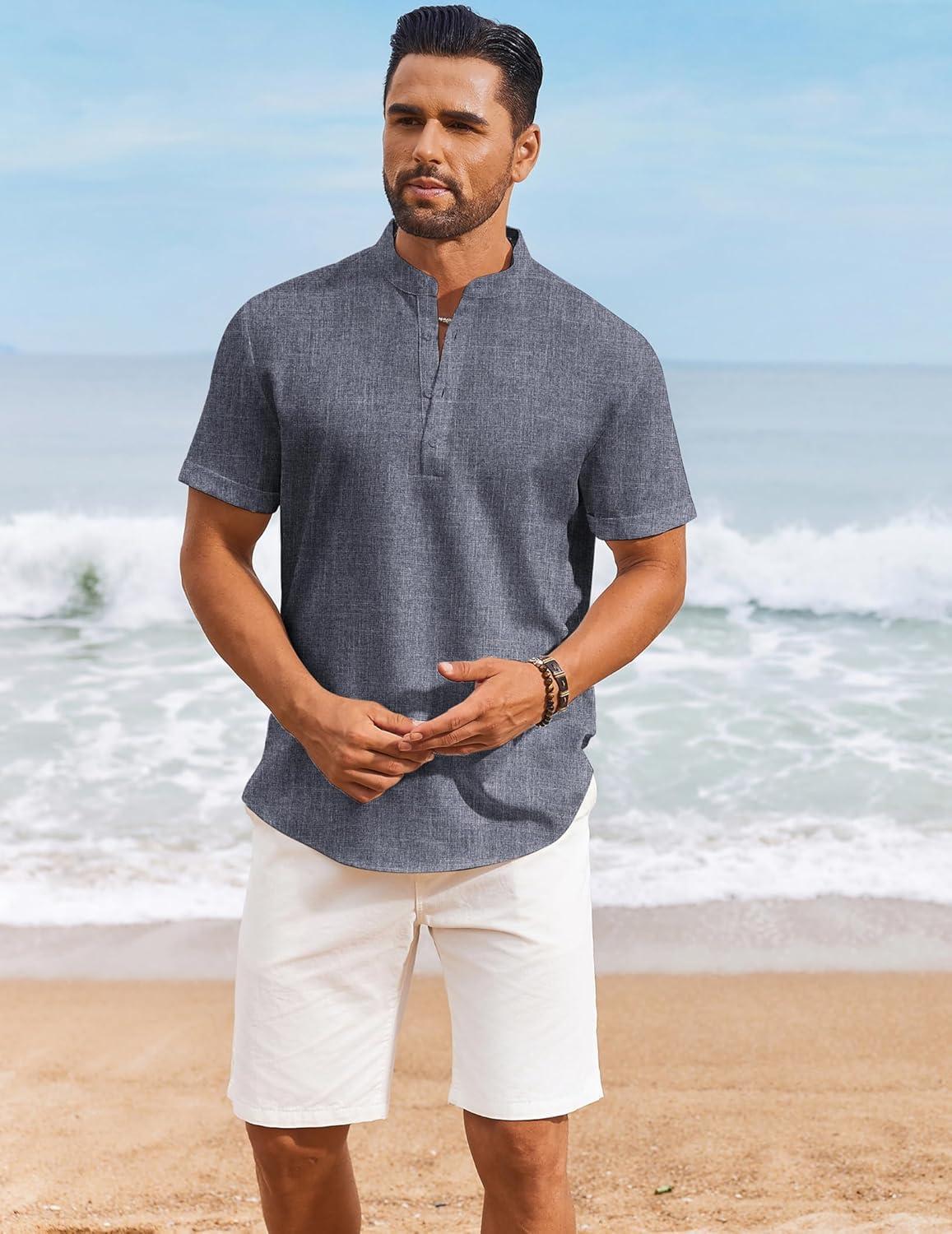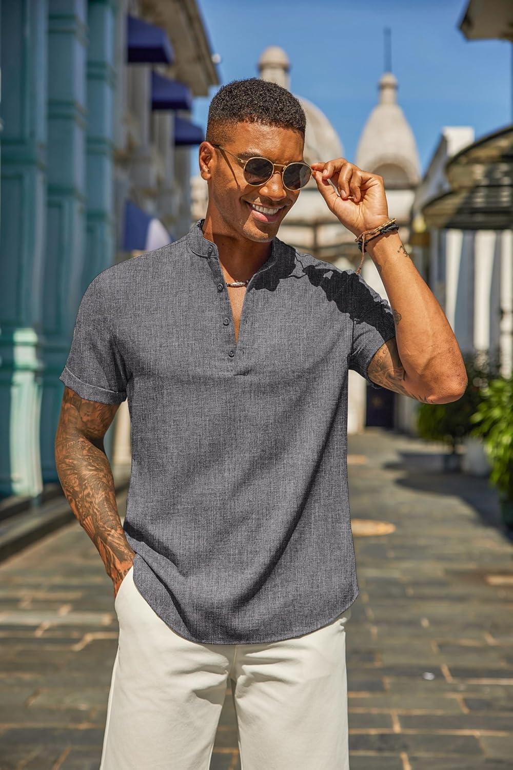 COOFANDY Men’s Casual Linen Henley Shirts Short Sleeve Band Collar Summer Beach Vacation T-Shirts(Dark Grey)