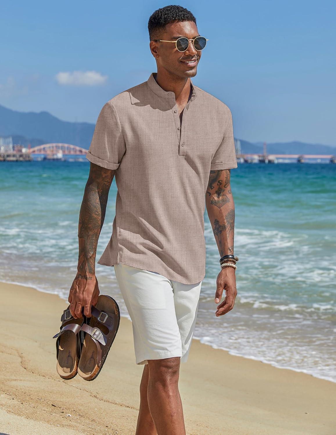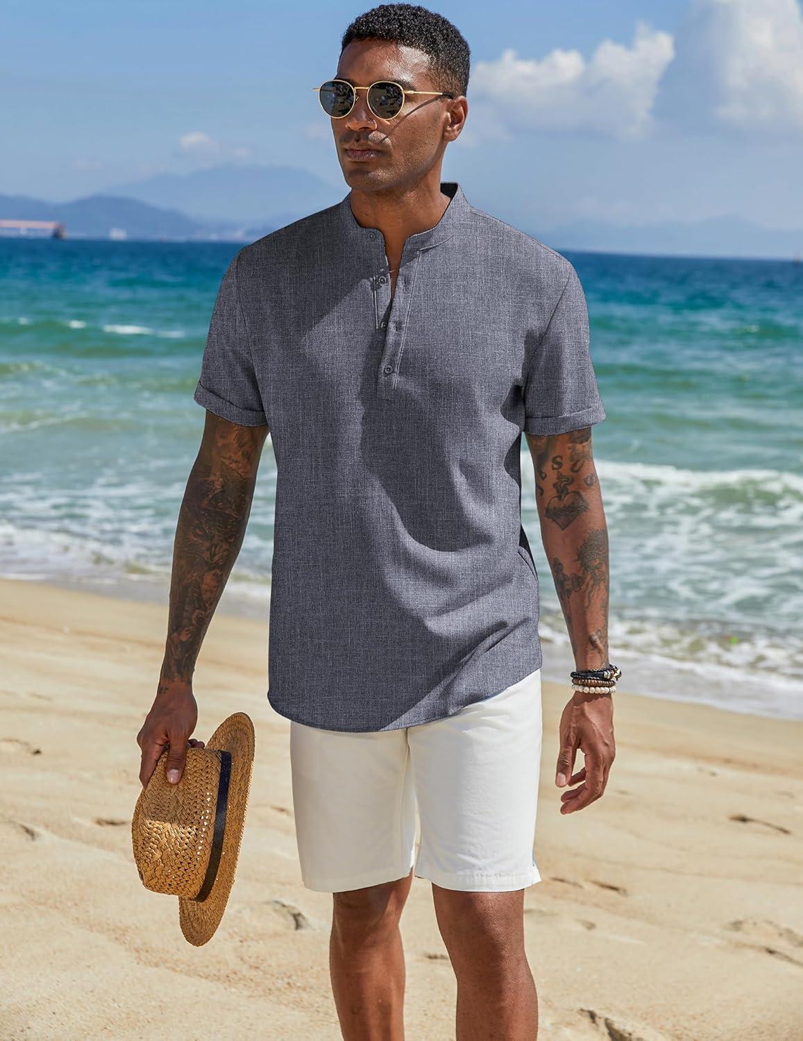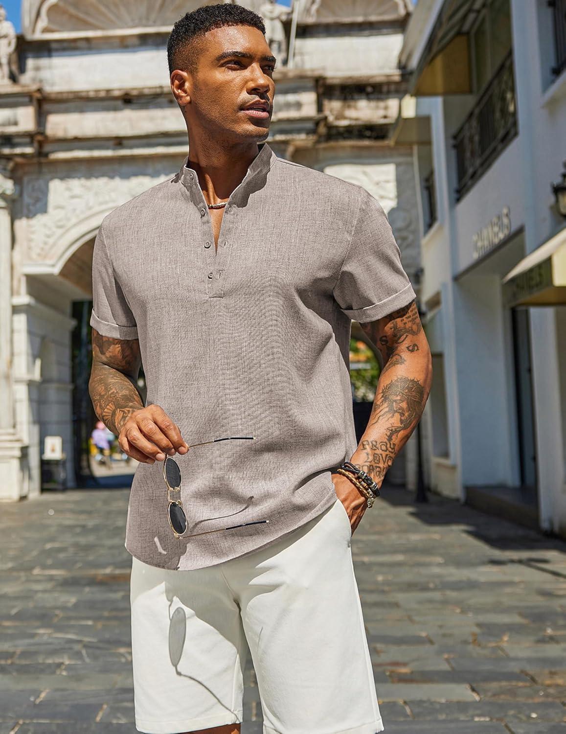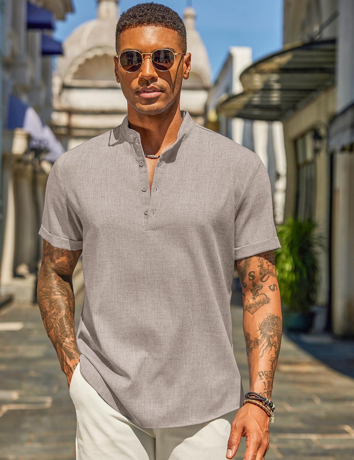 COOFANDY Men’s Casual Linen Henley Shirts Short Sleeve Band Collar Summer Beach Vacation T-Shirts(Stone)