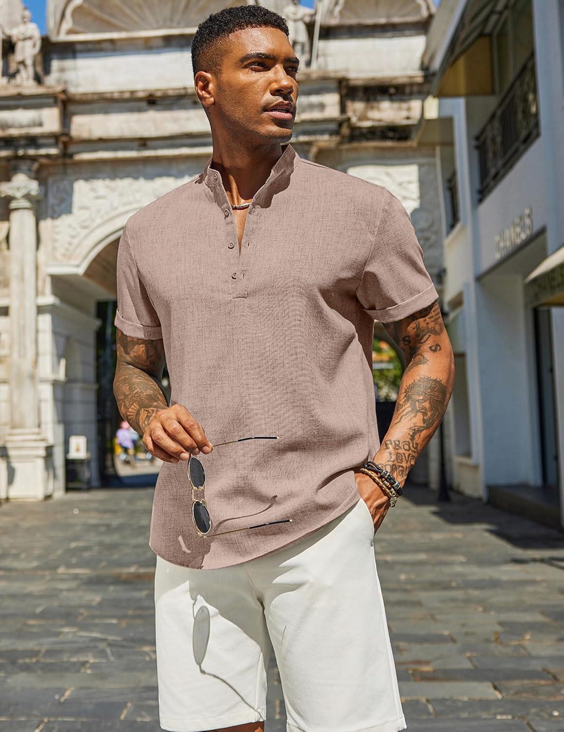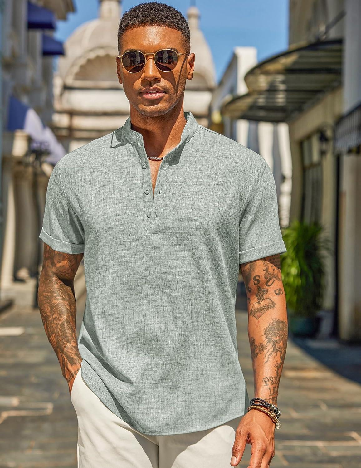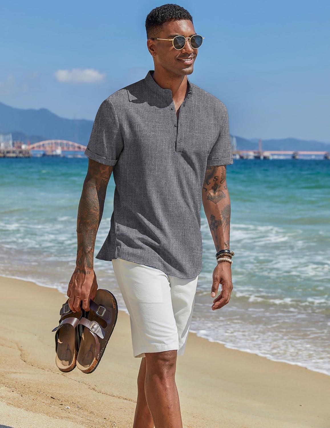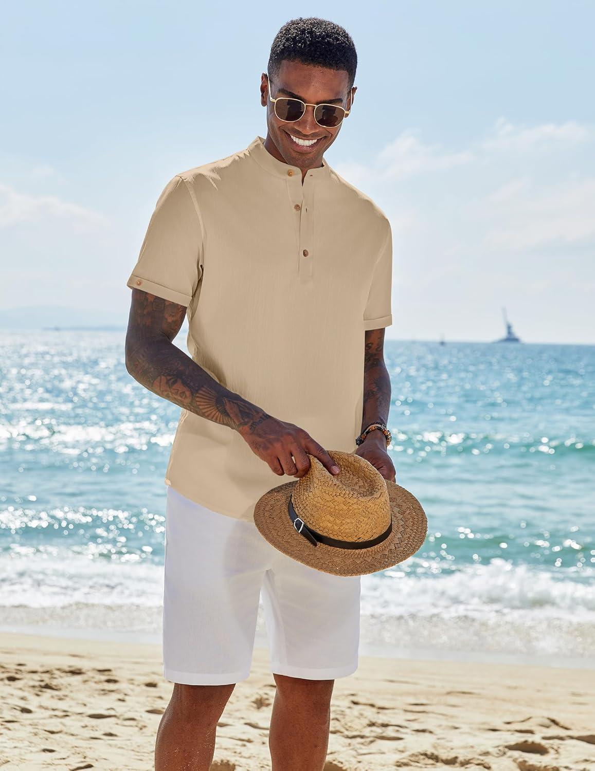 COOFANDY Men’s Casual Linen Henley Shirts Short Sleeve Band Collar Summer Beach Vacation T-Shirts(Stone)