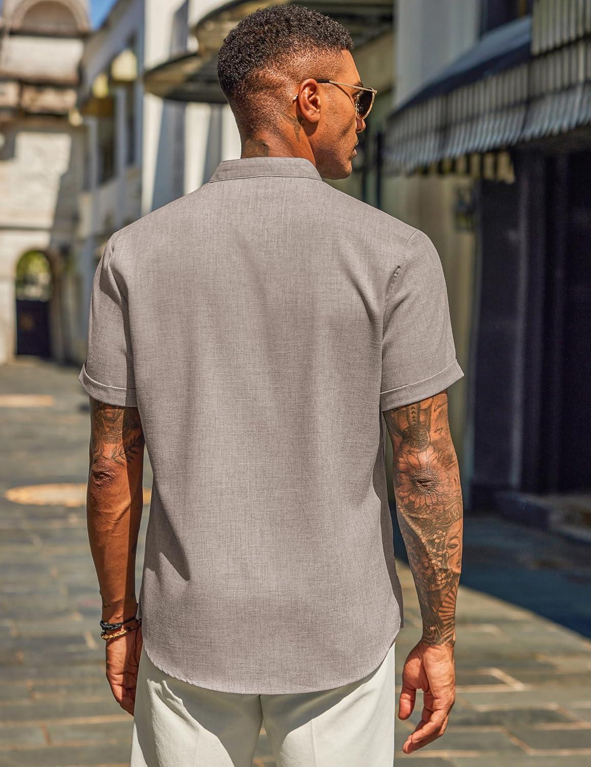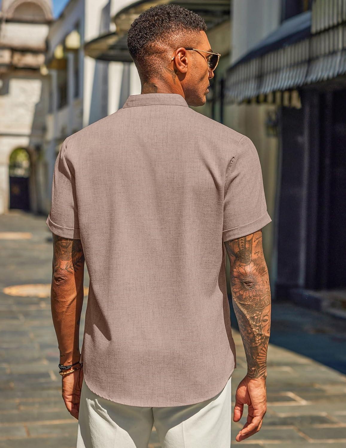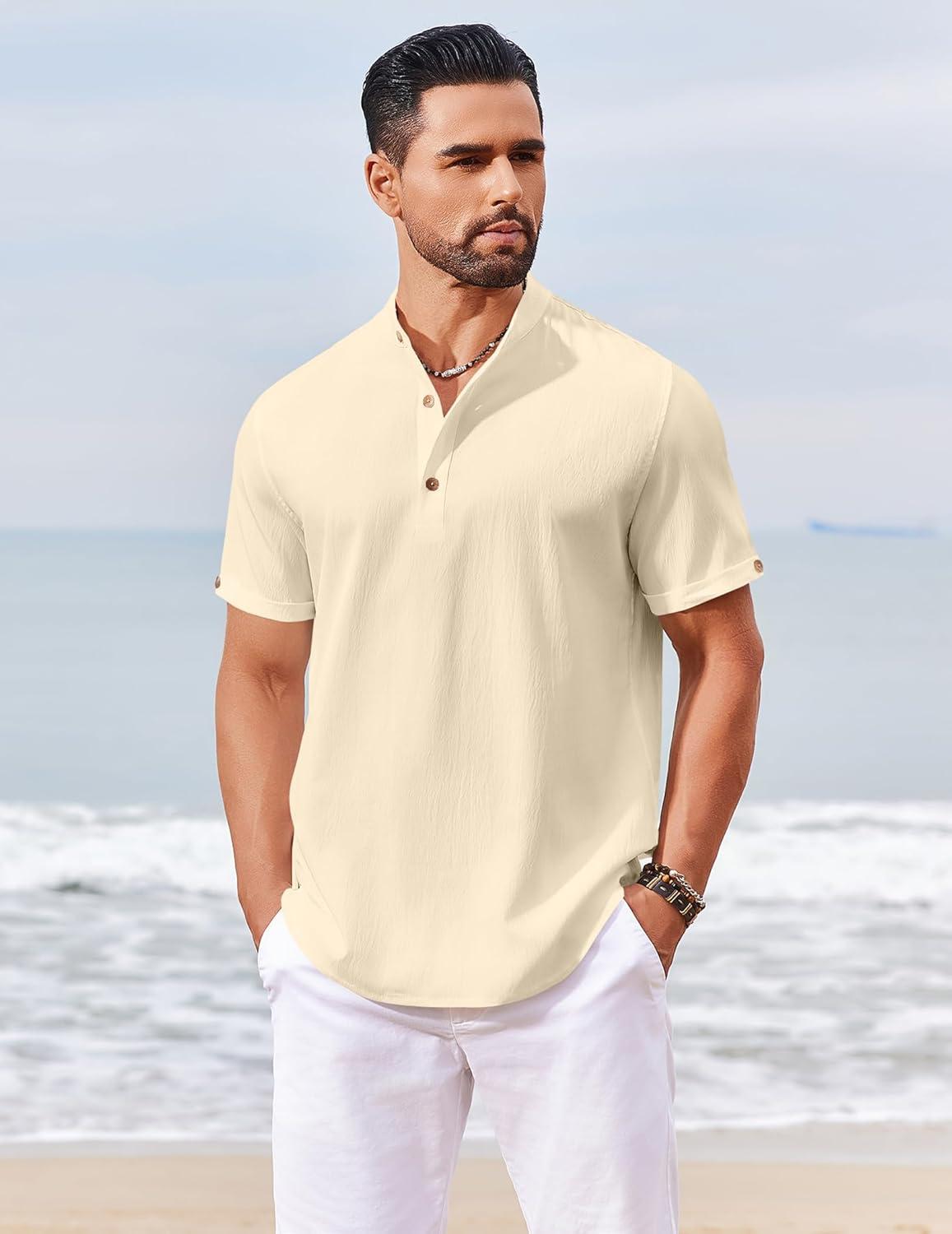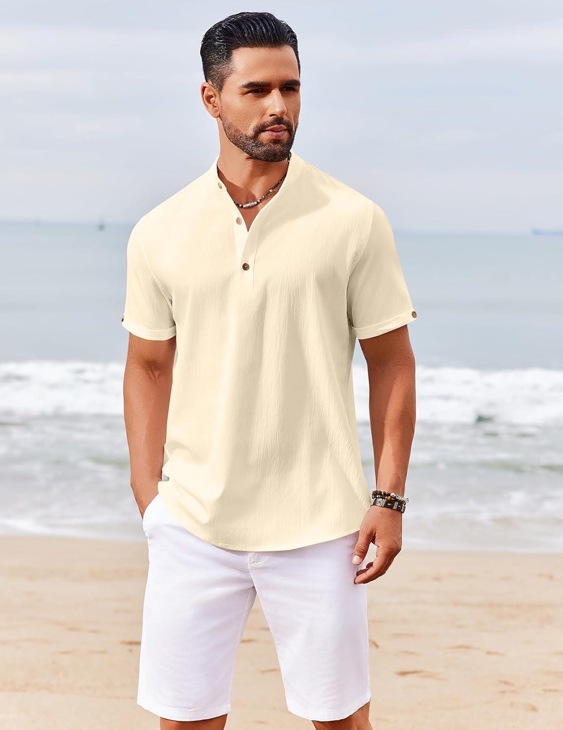 COOFANDY Men’s Casual Linen Henley Shirts Short Sleeve Band Collar Summer Beach Vacation T-Shirts(Stone)