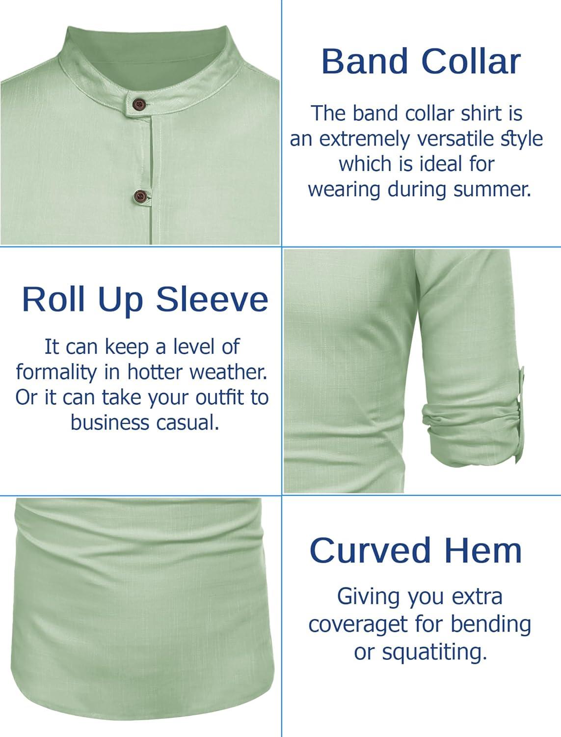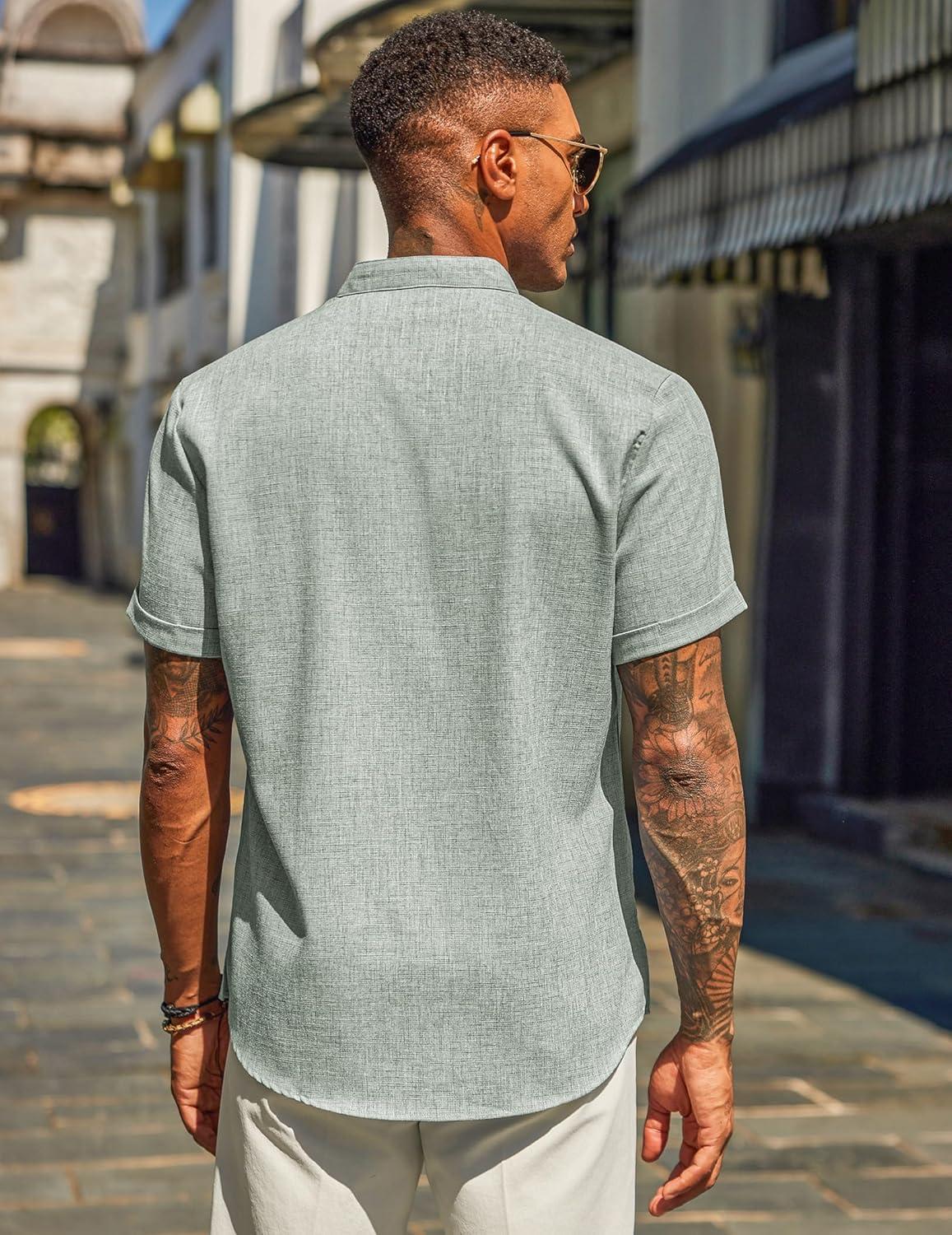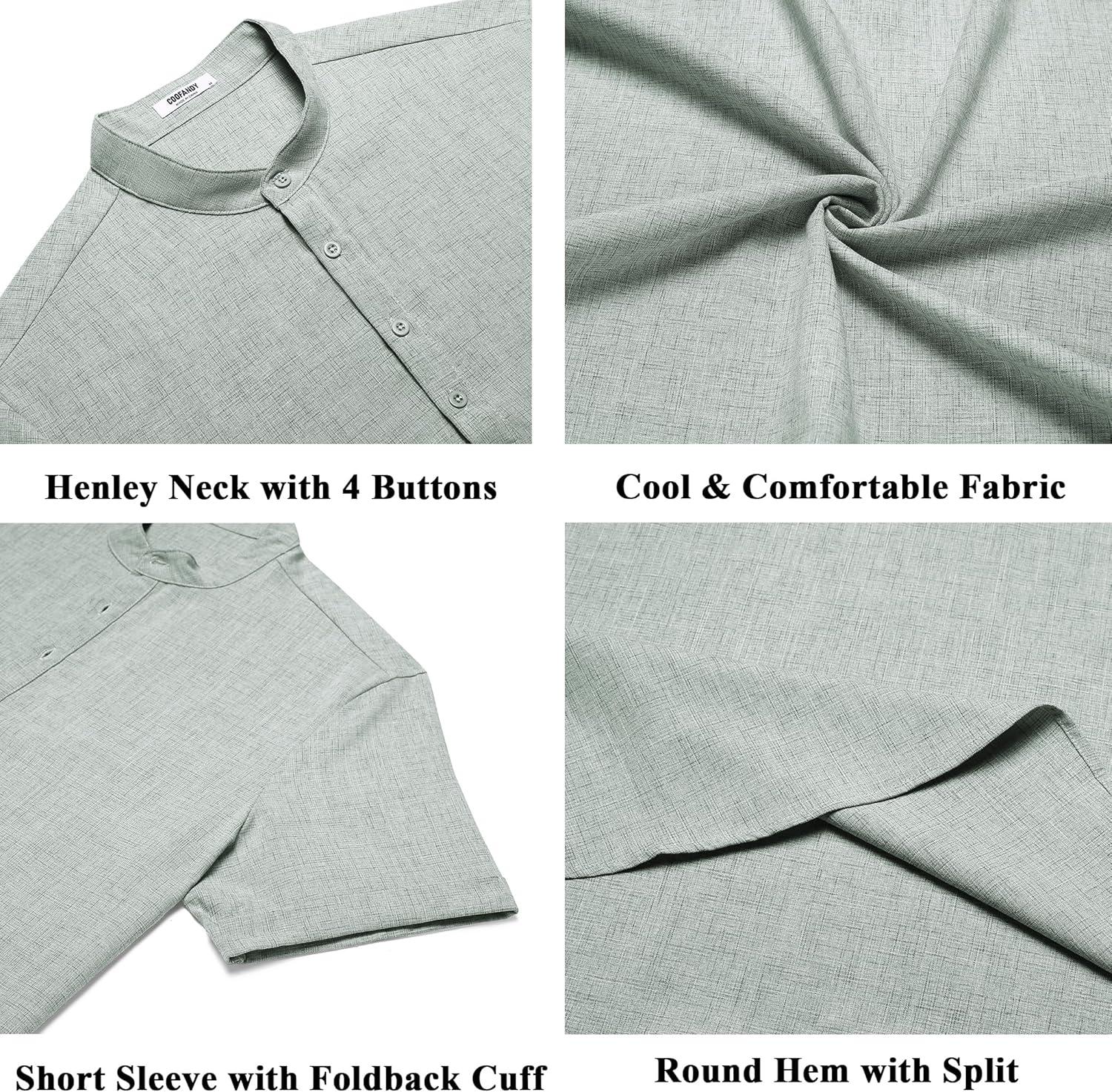 COOFANDY Men’s Casual Linen Henley Shirts Short Sleeve Band Collar Summer Beach Vacation T-Shirts(Light Green)