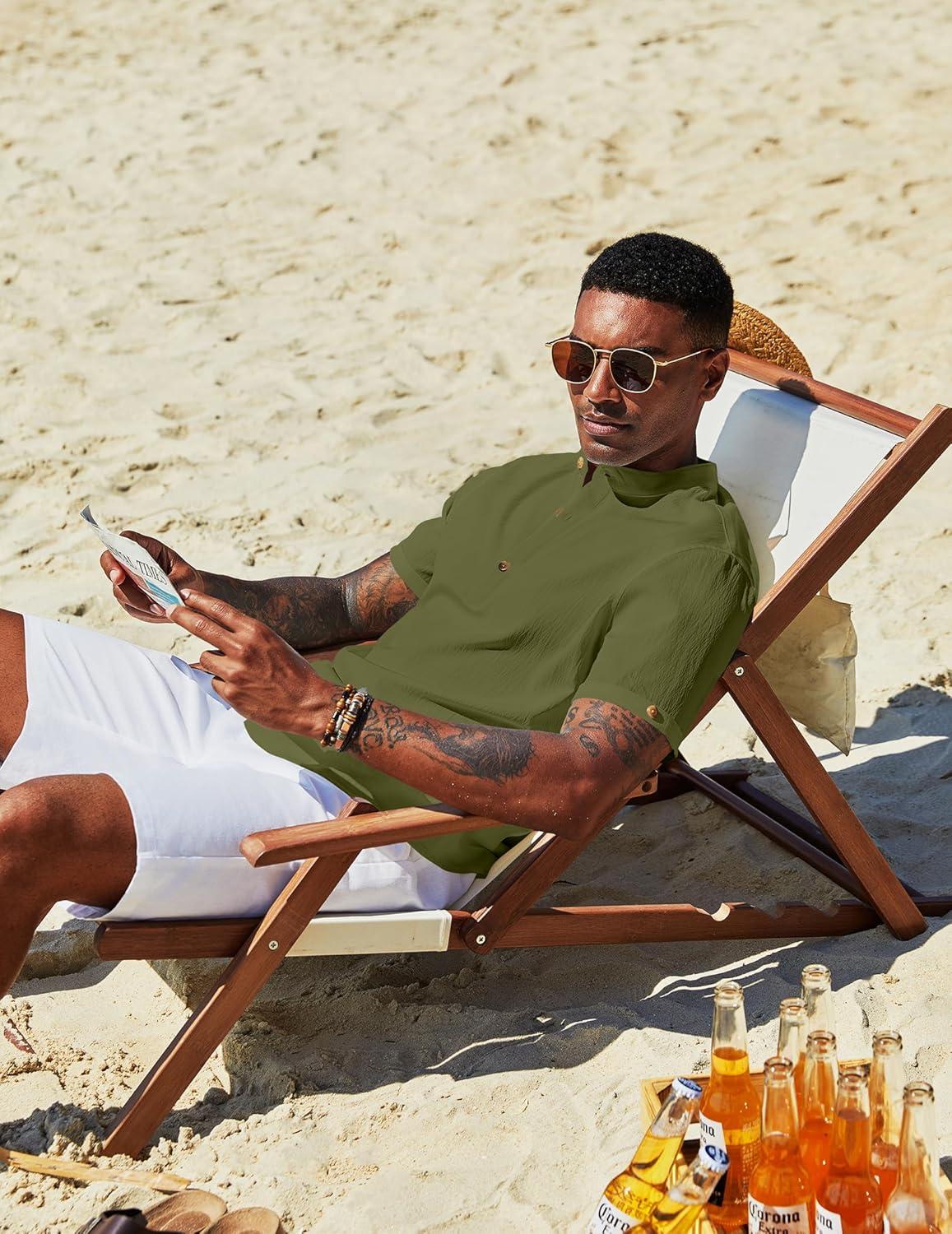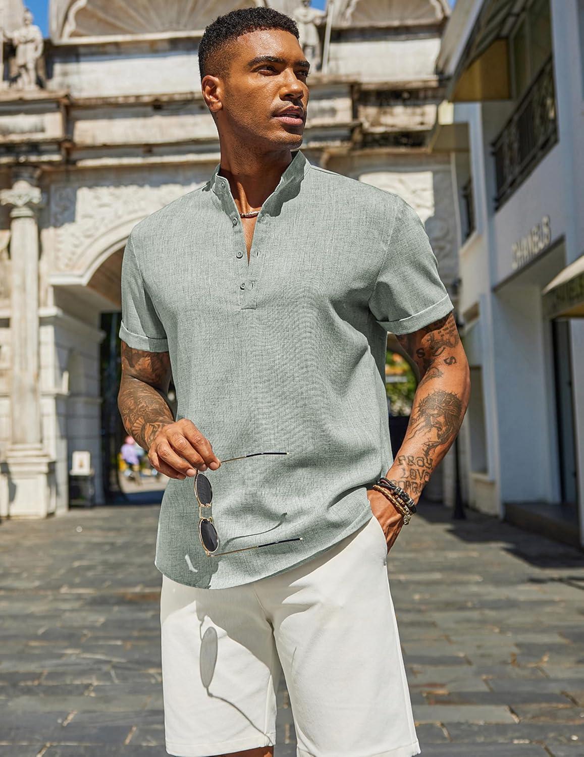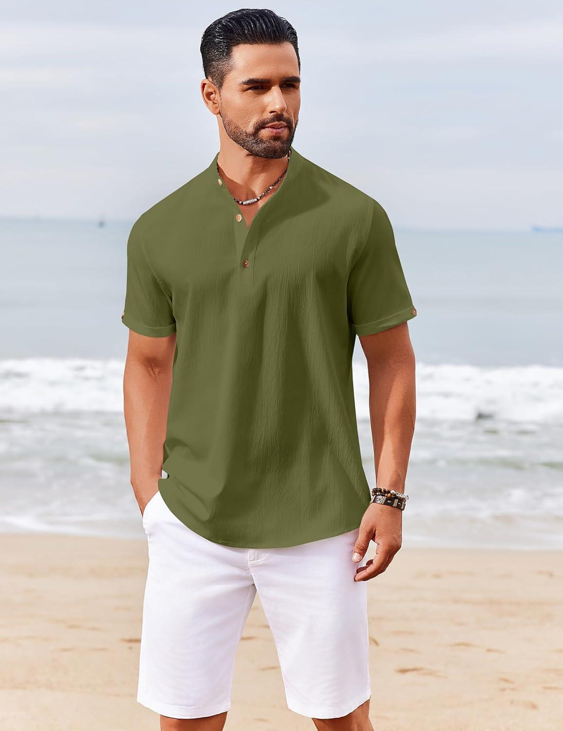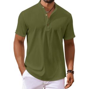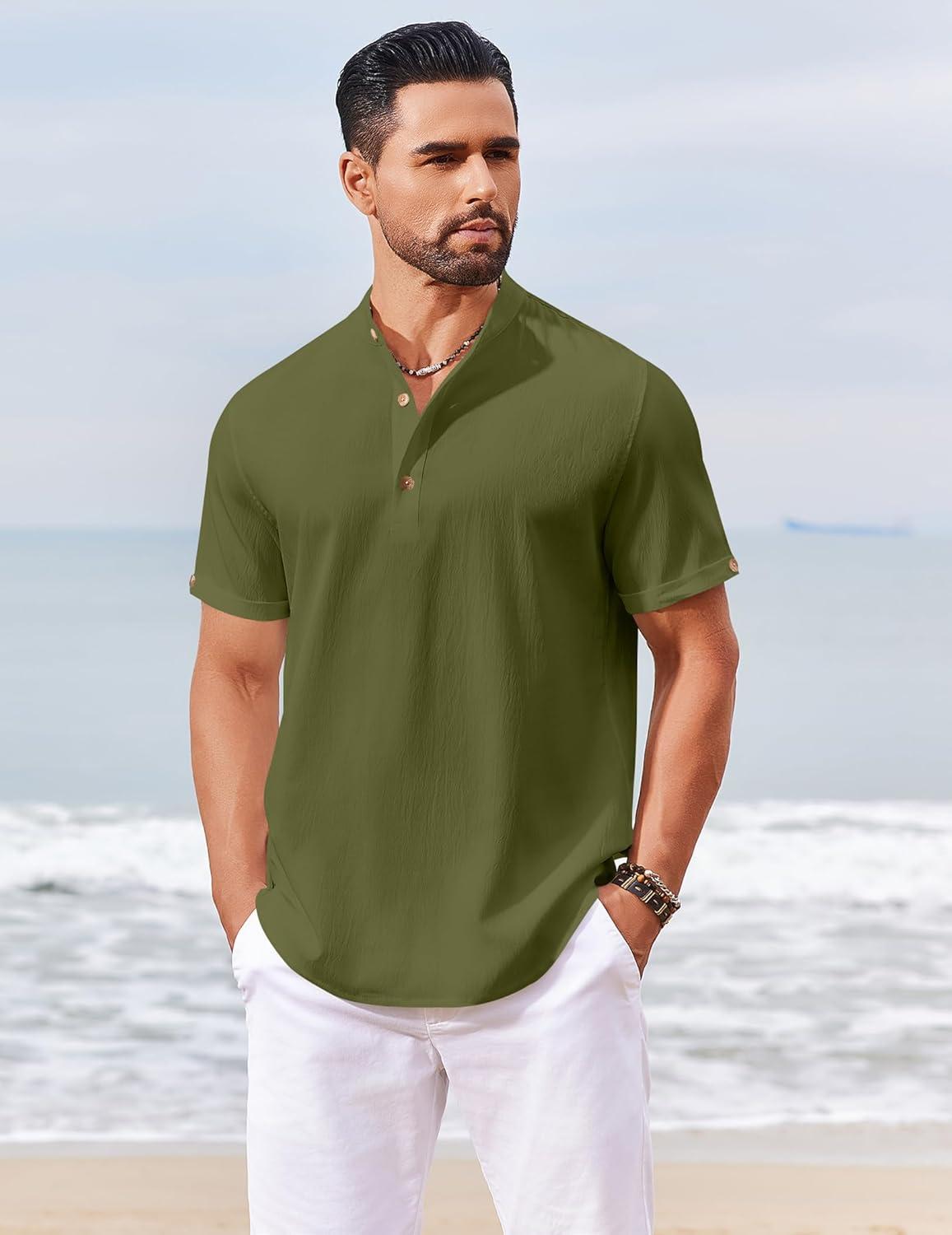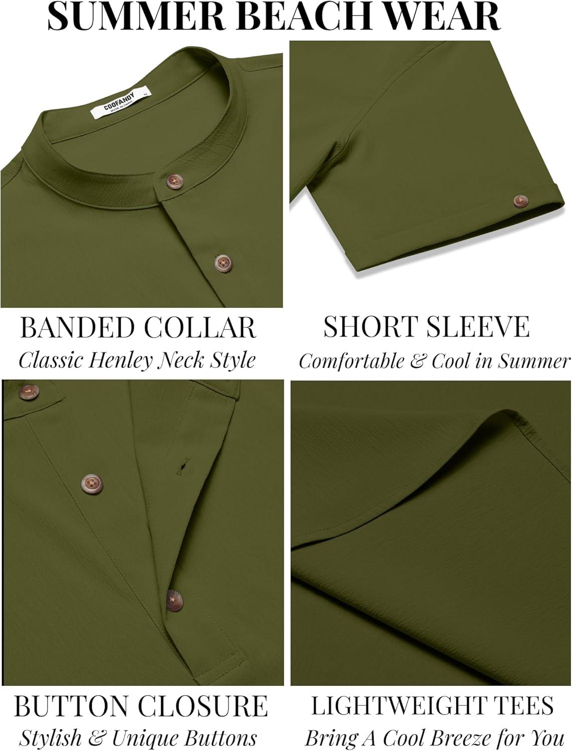 COOFANDY Henley Shirts for Men Short Sleeve Band Collar Casual Shirt Summer Hippie Vacation Beach T Shirts with Pocket(Army Green)