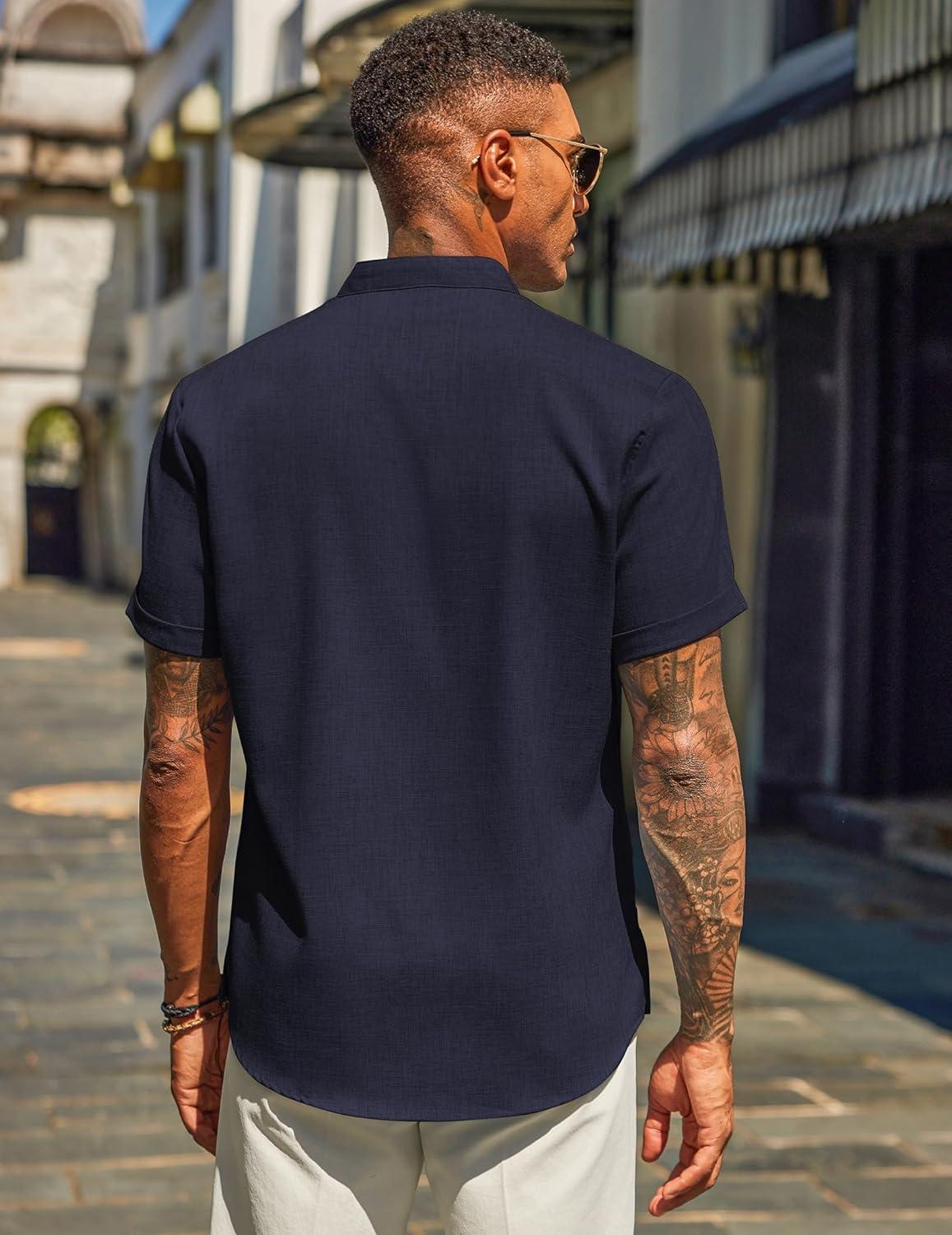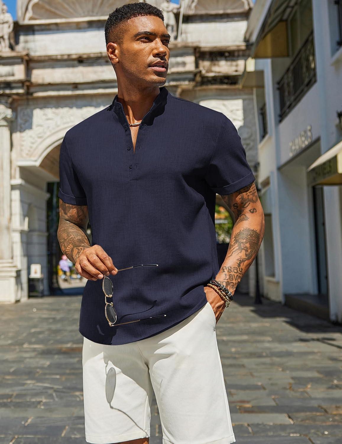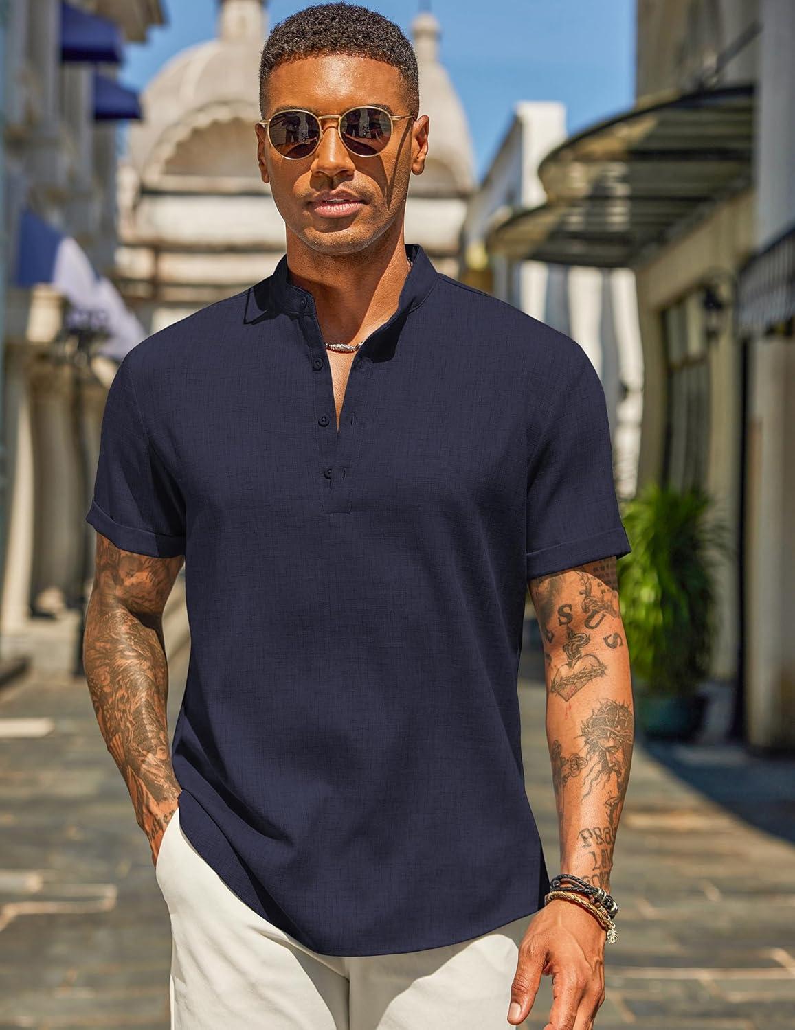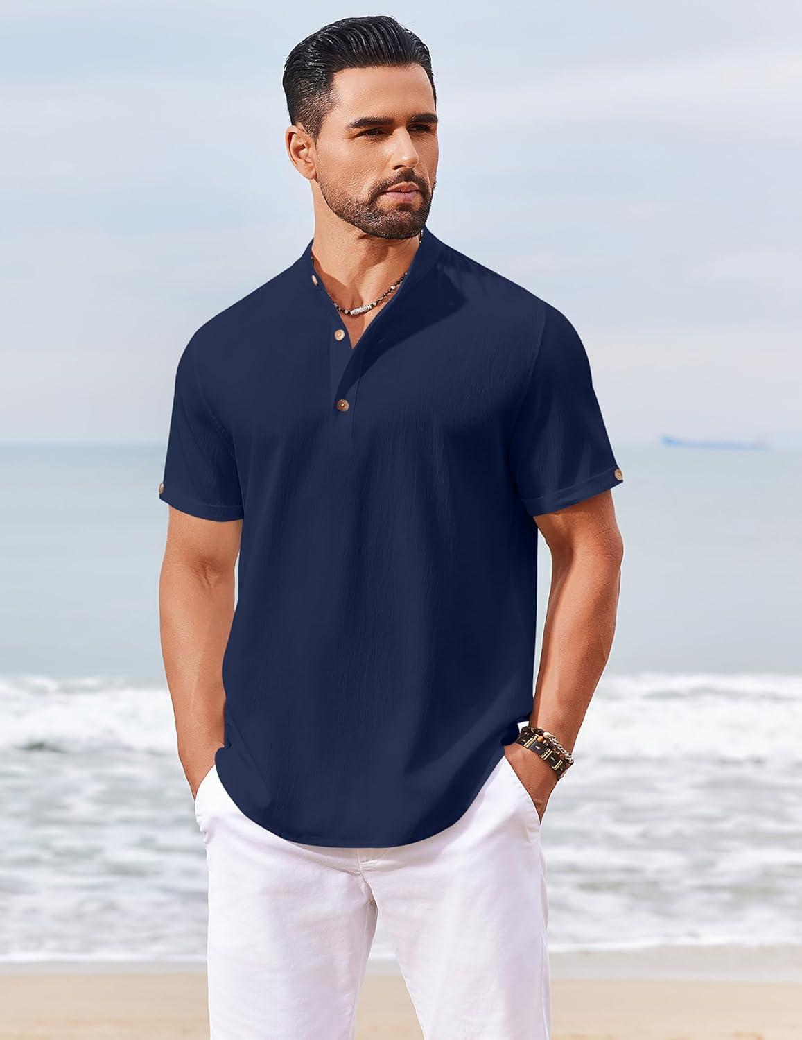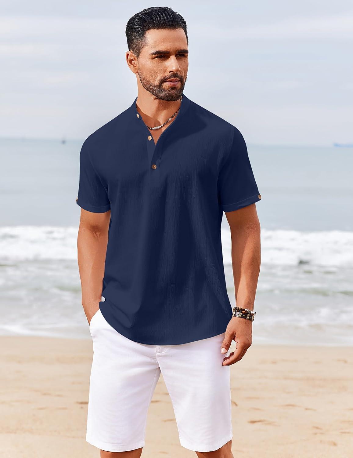 COOFANDY Men’s Casual Linen Henley Shirts Short Sleeve Band Collar Summer Beach Vacation T-Shirts(Navy Blue)