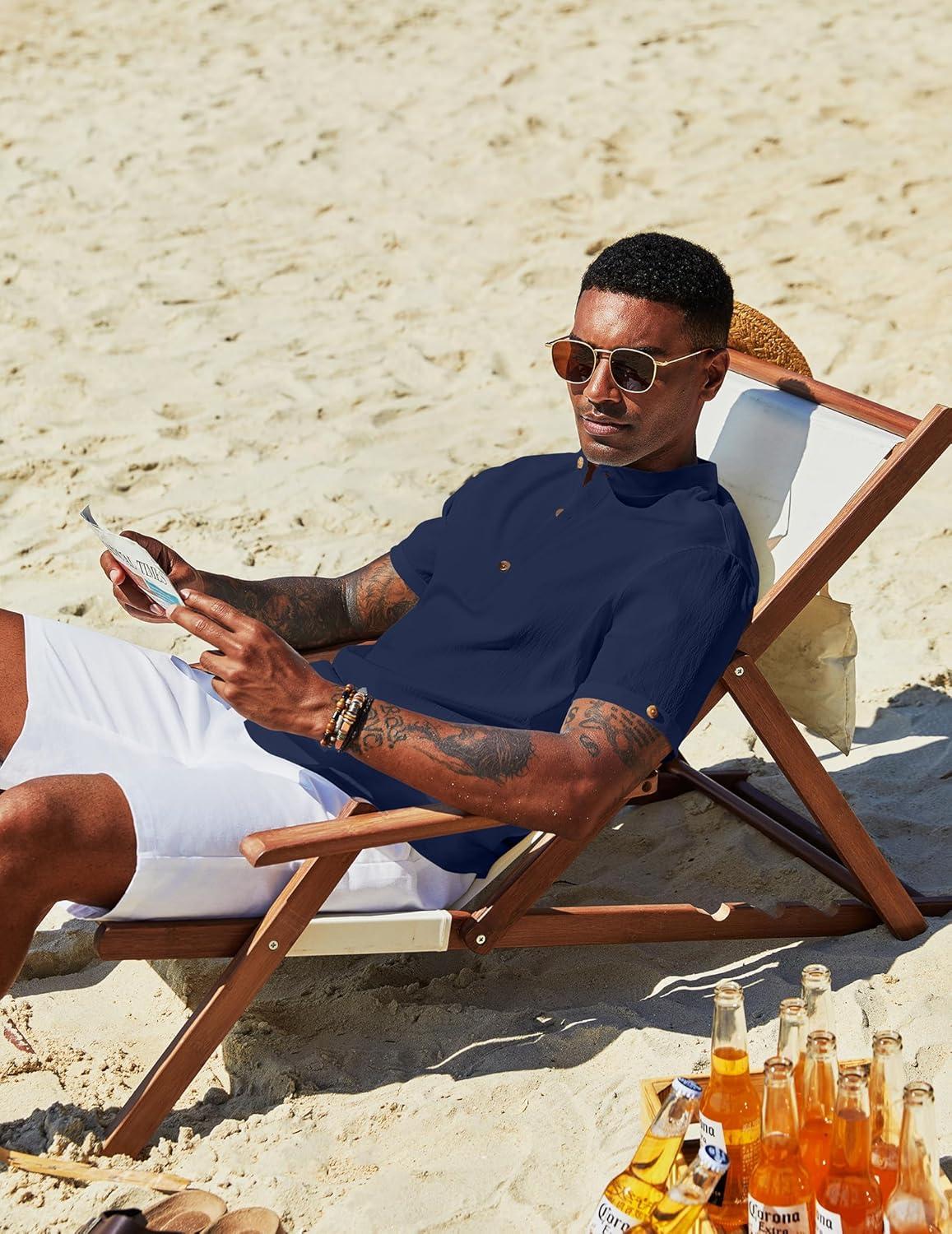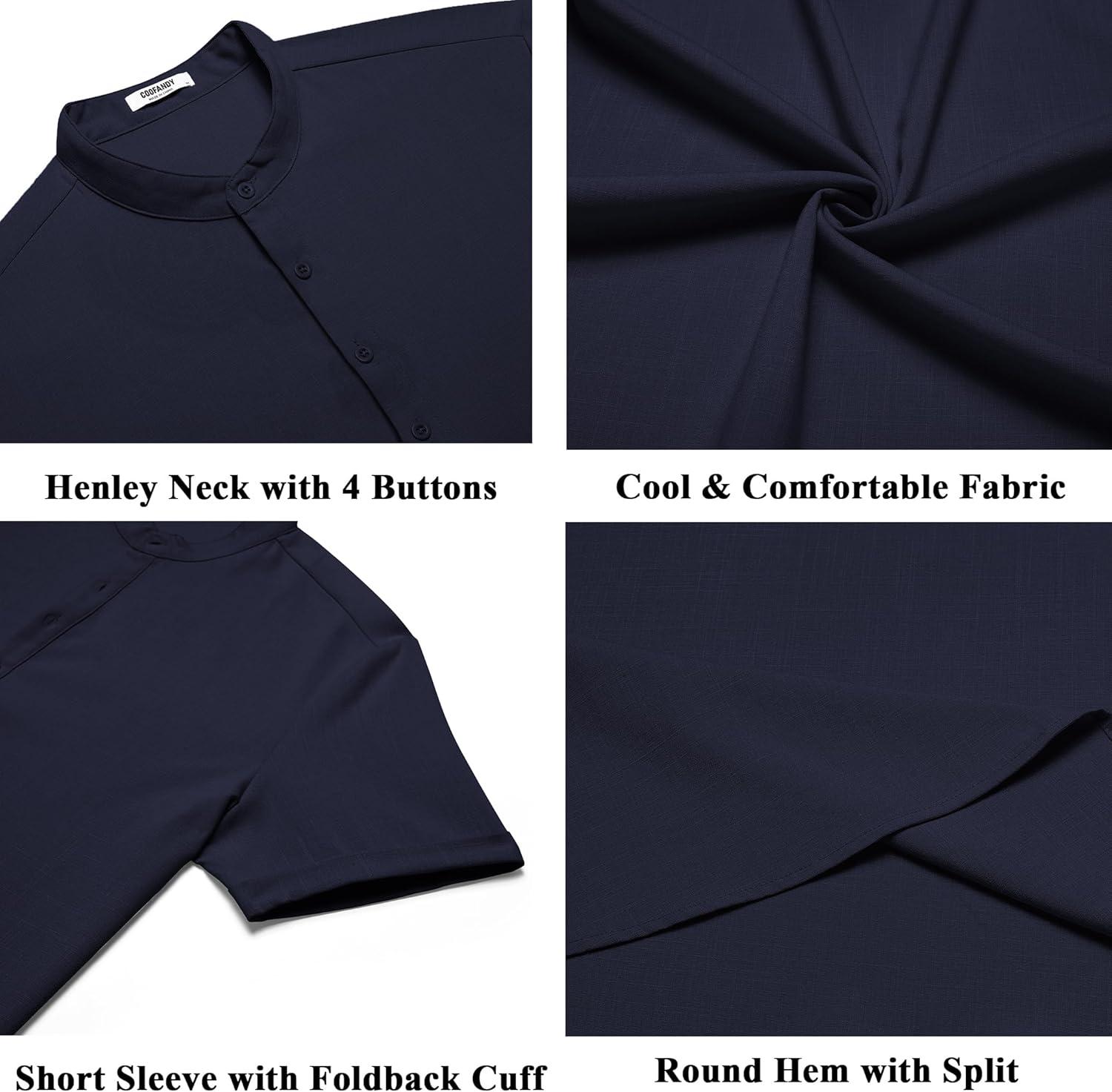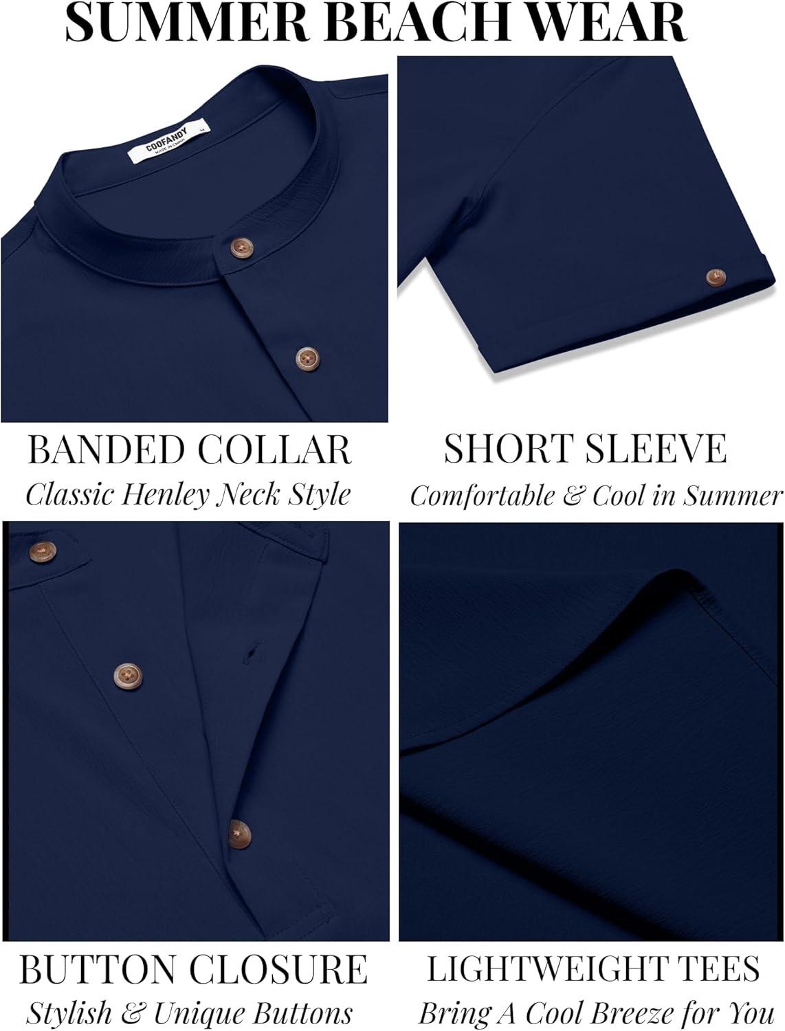 COOFANDY Henley Shirts for Men Short Sleeve Band Collar Casual Shirt Summer Hippie Vacation Beach T Shirts with Pocket(Navy Blue)