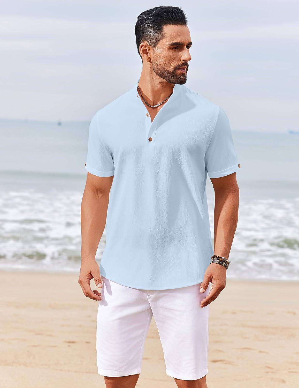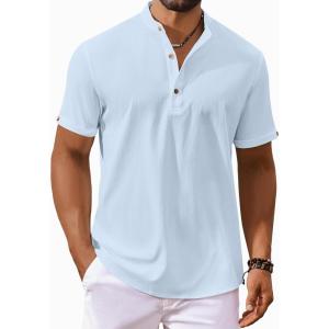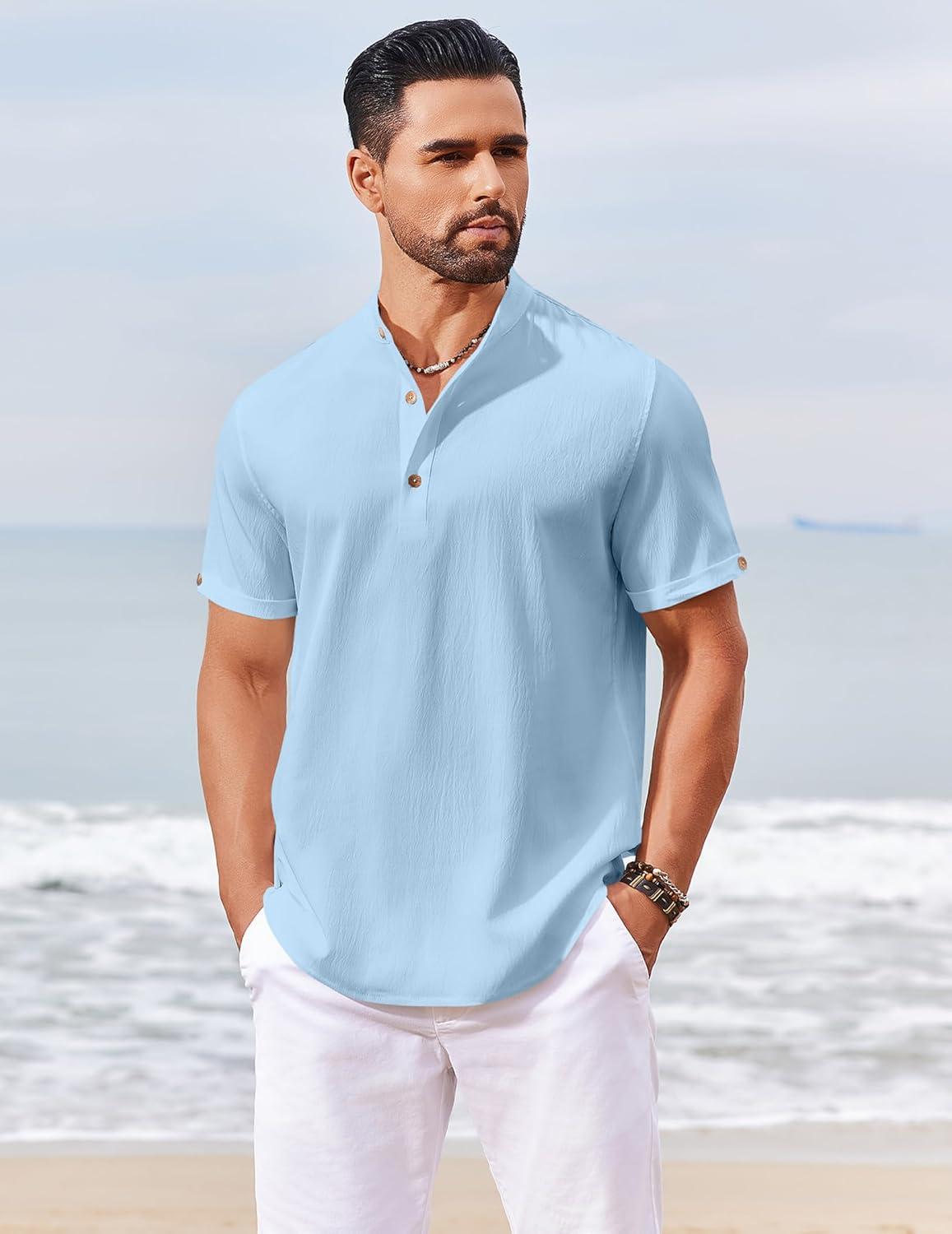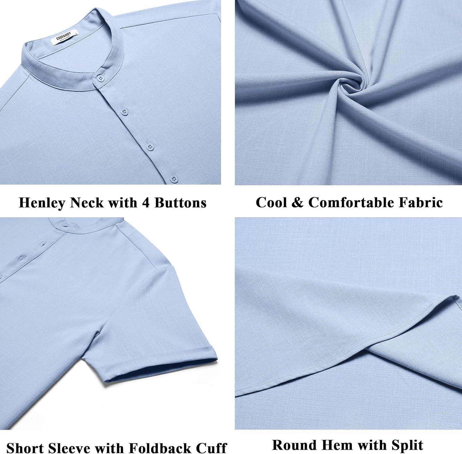 COOFANDY Men’s Casual Linen Henley Shirts Short Sleeve Band Collar Summer Beach Vacation T-Shirts(Solid Light Blue)