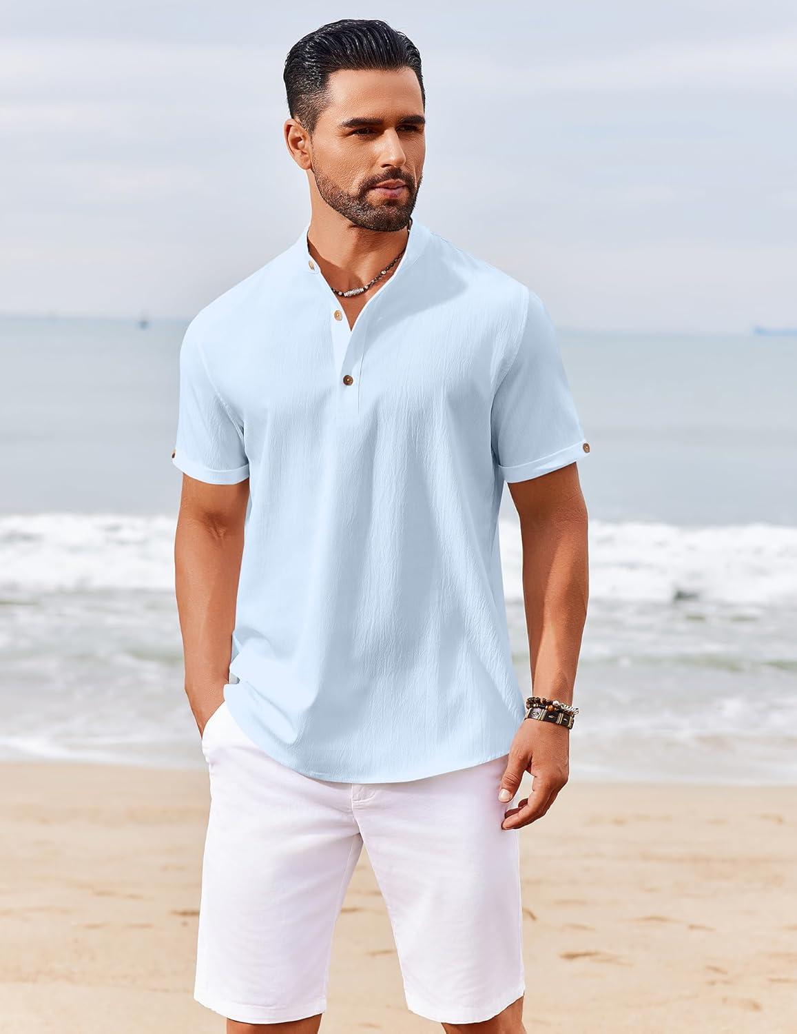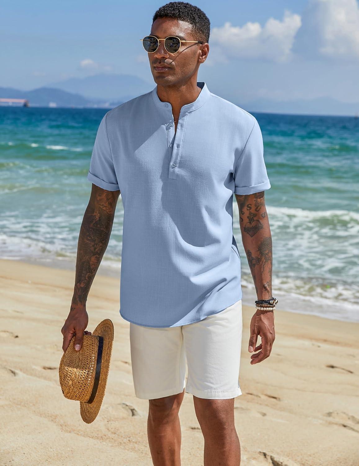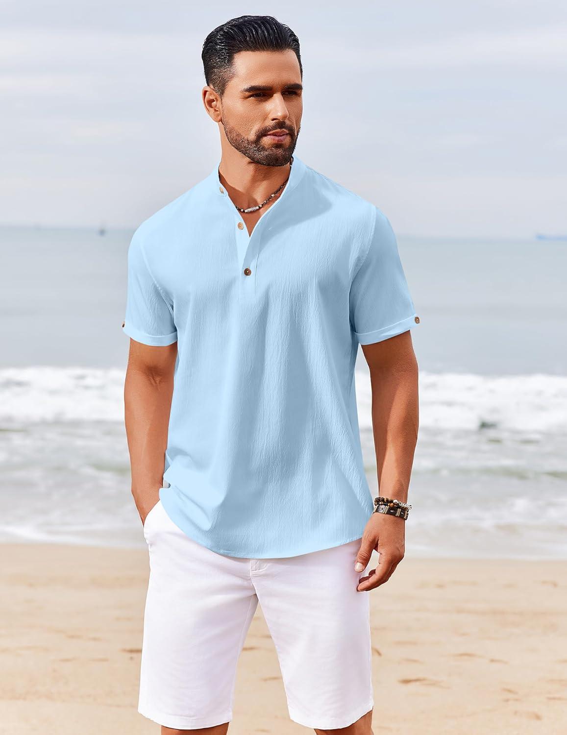 COOFANDY Men’s Casual Linen Henley Shirts Short Sleeve Band Collar Summer Beach Vacation T-Shirts(Solid Light Blue)
