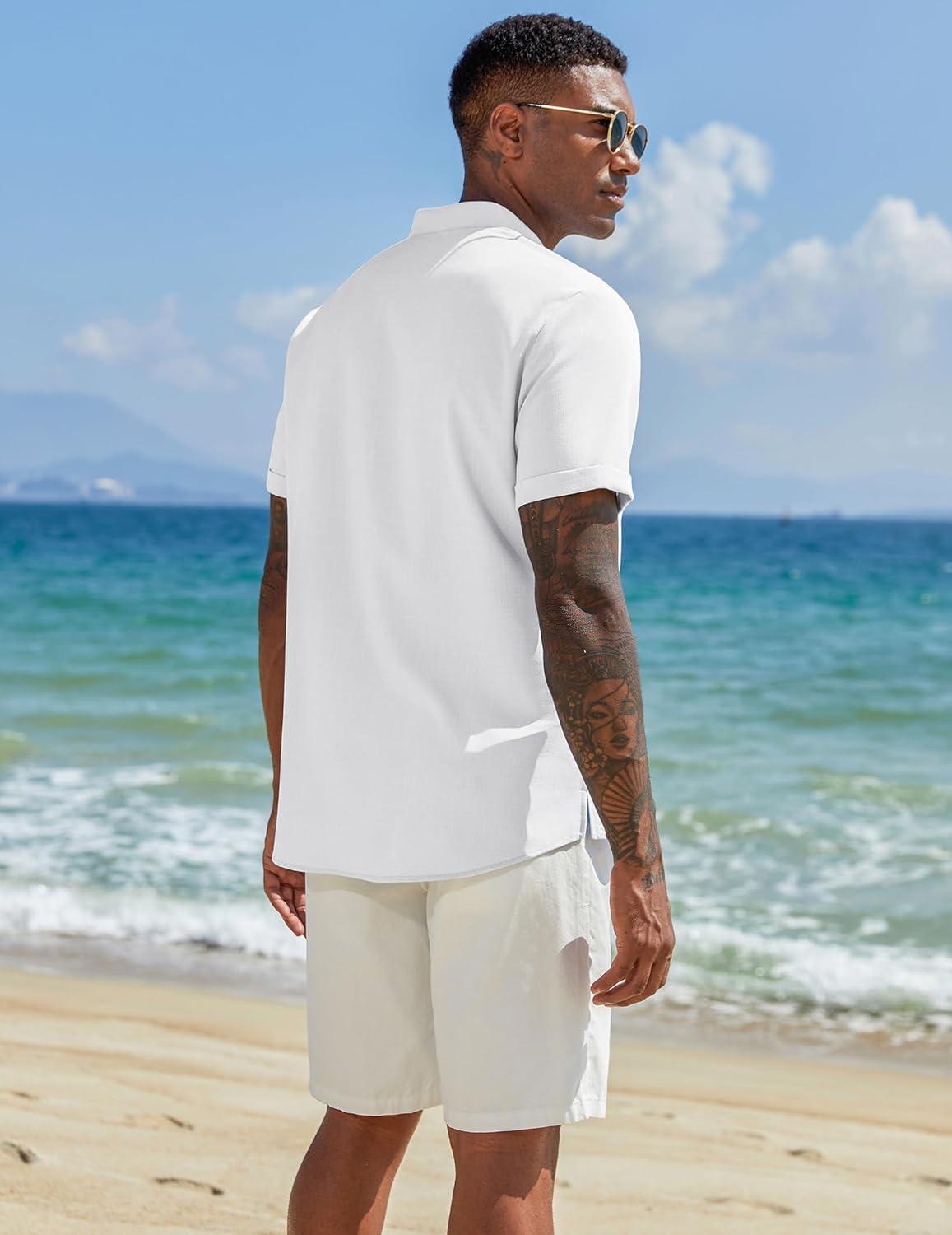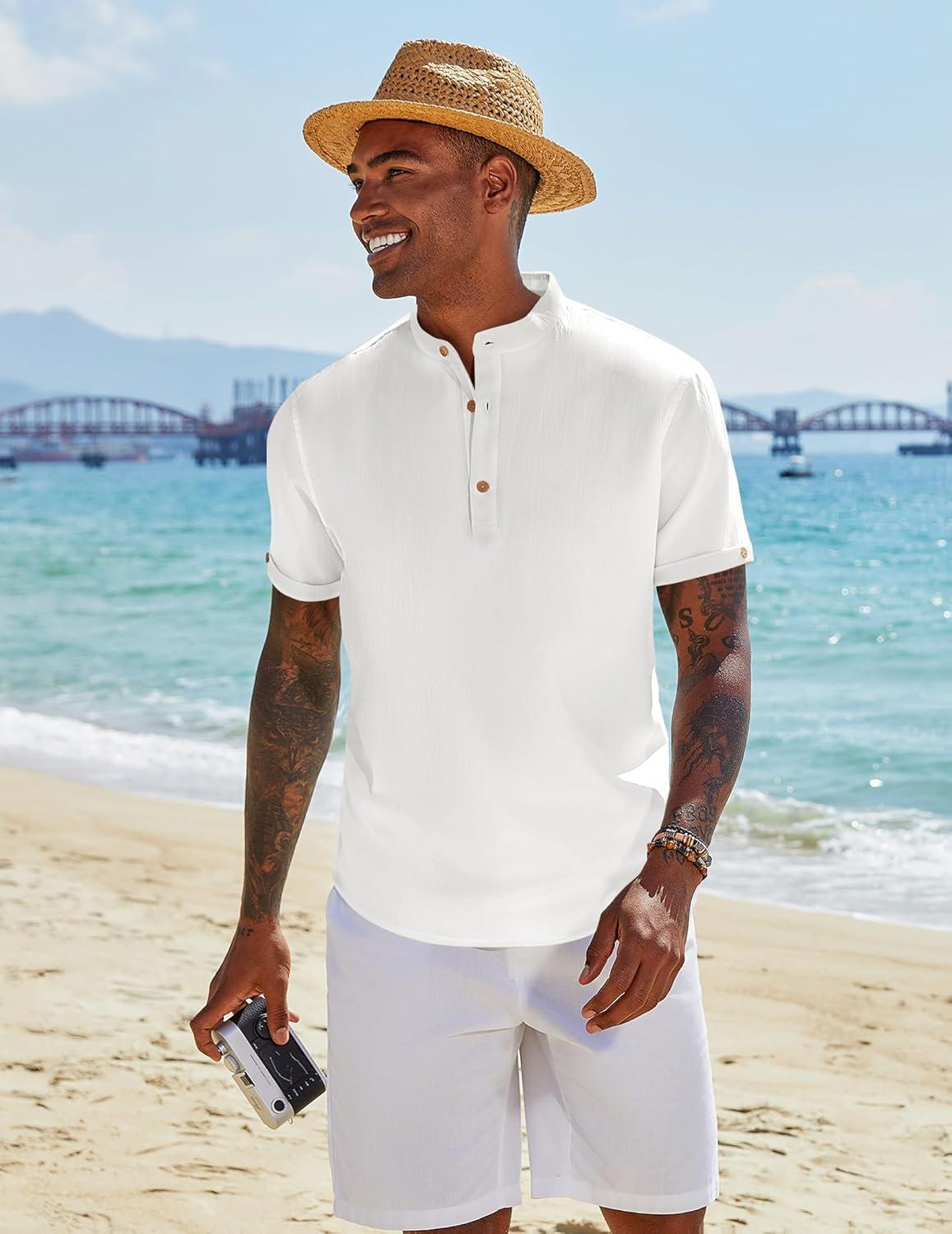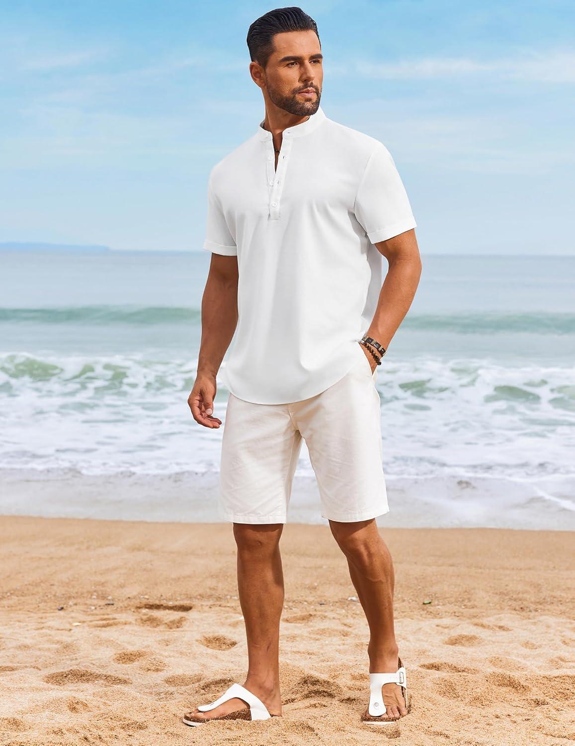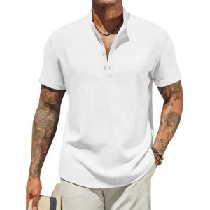 COOFANDY Men’s Casual Linen Henley Shirts Short Sleeve Band Collar Summer Beach Vacation T-Shirts(White)
