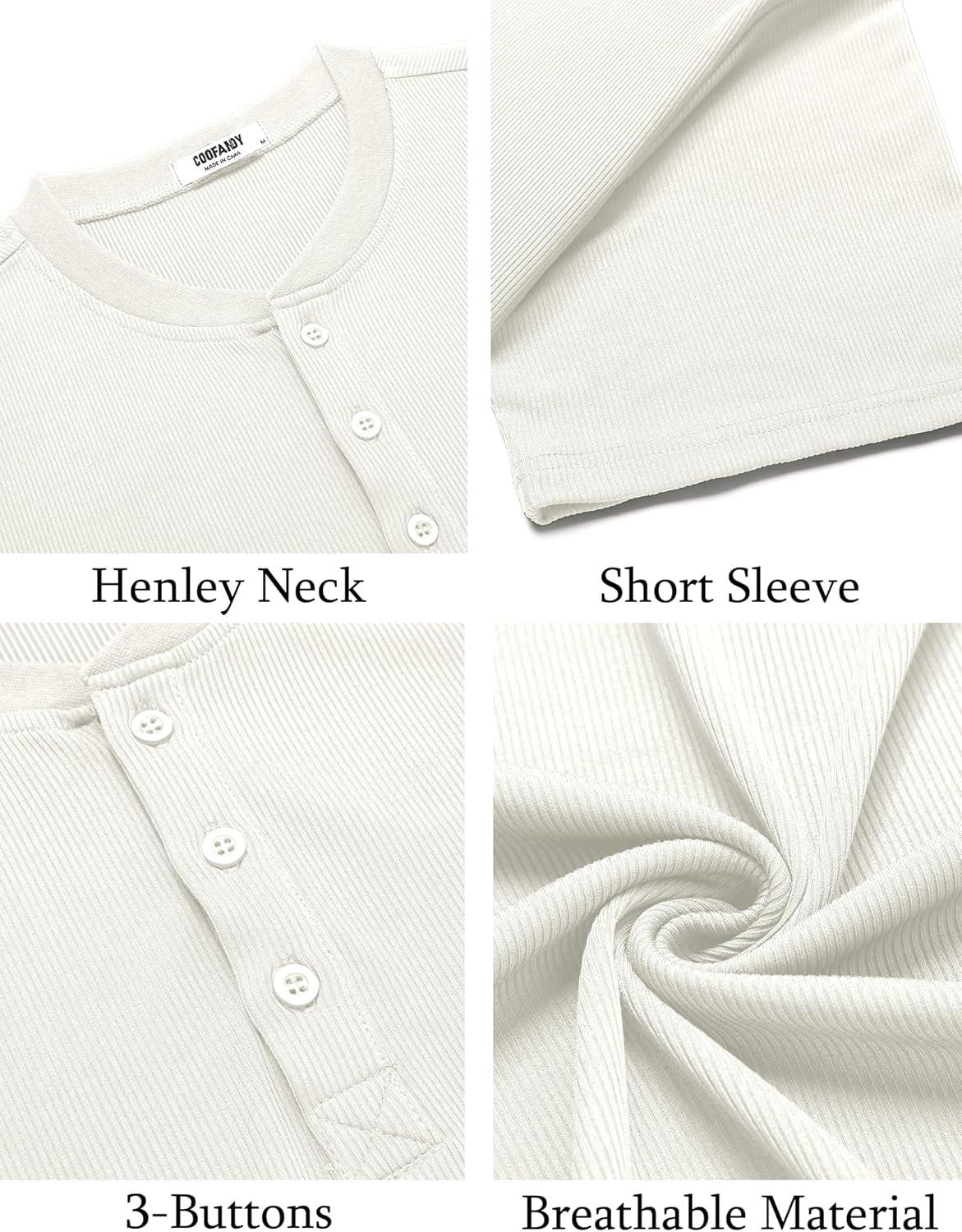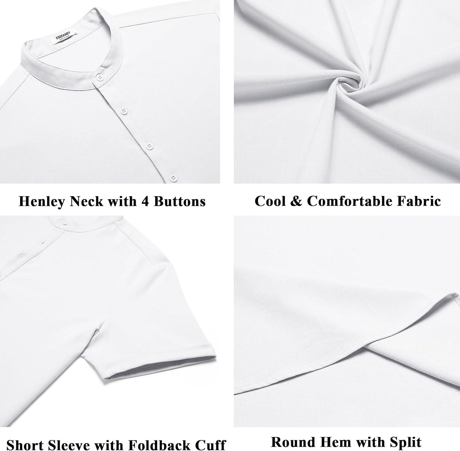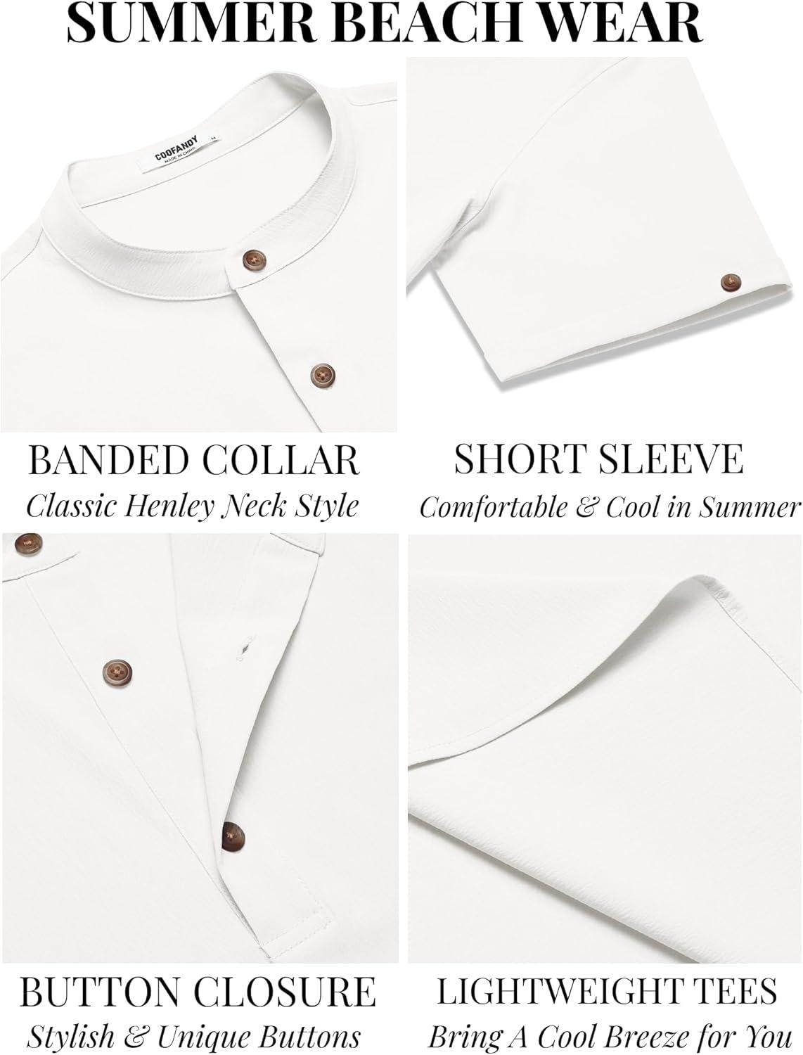 COOFANDY Men’s Casual Henley Shirts Short Sleeve Summer Beach T-Shirts Banded Collar Henleys Button Tee Shirt(All White)