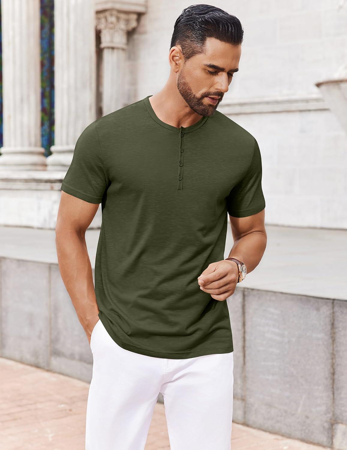 COOFANDY Men’s Henley Shirts Short Sleeve Collarless Button T-Shirt Fashion Casual Basic Tee Tops(Army Green)