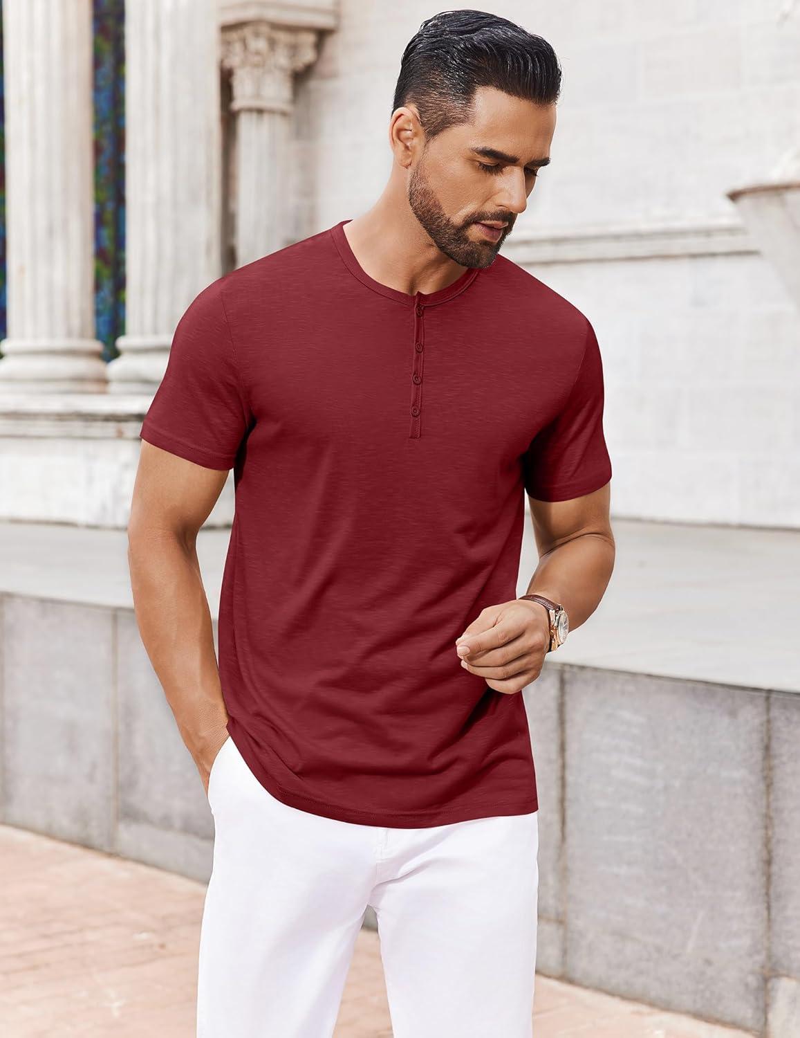 COOFANDY Men’s Henley Shirts Short Sleeve Collarless Button T-Shirt Fashion Casual Basic Tee Tops(Wine Red)