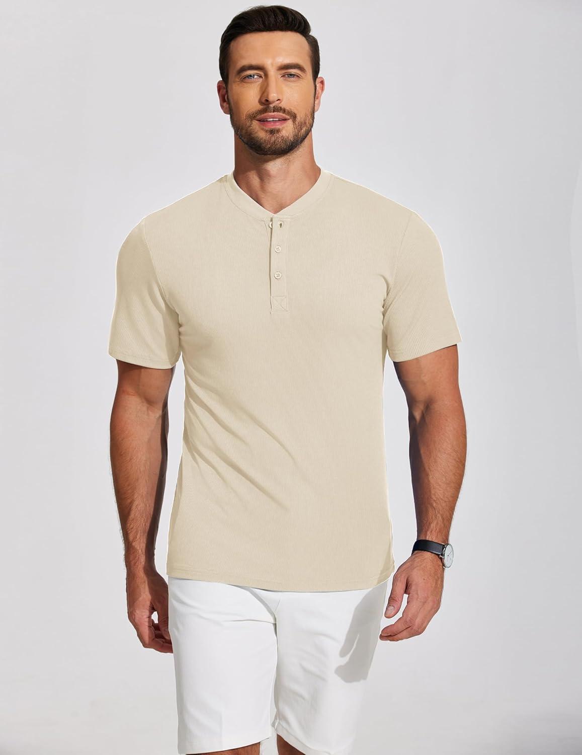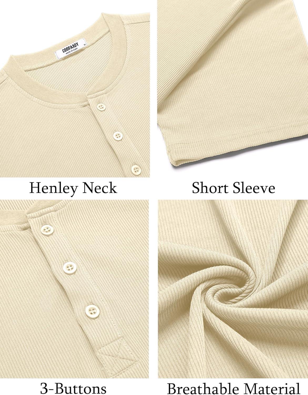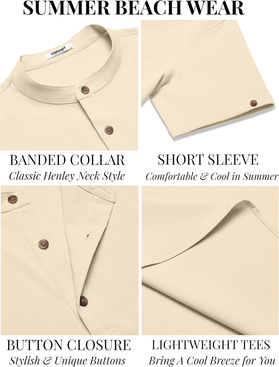 COOFANDY Men’s Casual Henley Shirts Short Sleeve Summer Beach T-Shirts Banded Collar Henleys Button Tee Shirt(Beige)