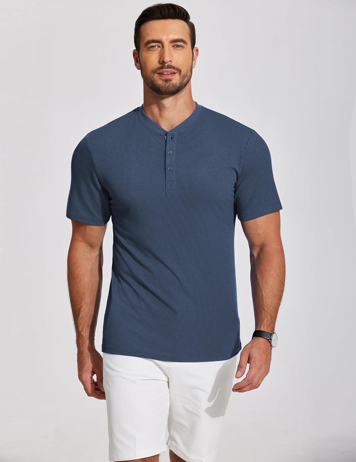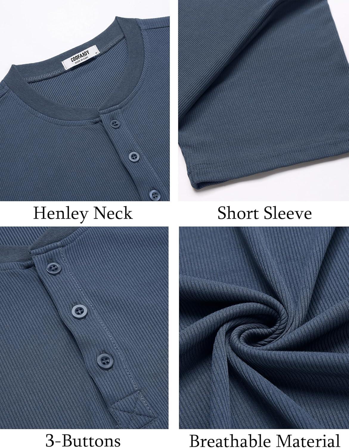 COOFANDY Men’s Casual Henley Shirts Short Sleeve Summer Beach T-Shirts Banded Collar Henleys Button Tee Shirt(Blue)