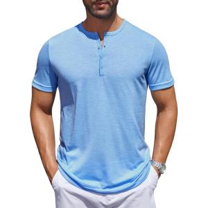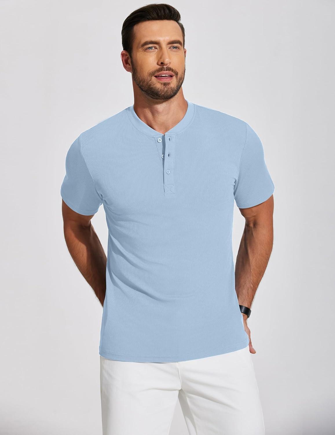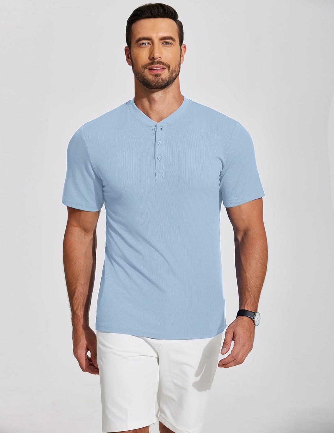 COOFANDY Men’s Henley Shirts Short Sleeve Collarless Button T-Shirt Fashion Casual Basic Tee Tops(Light Blue)