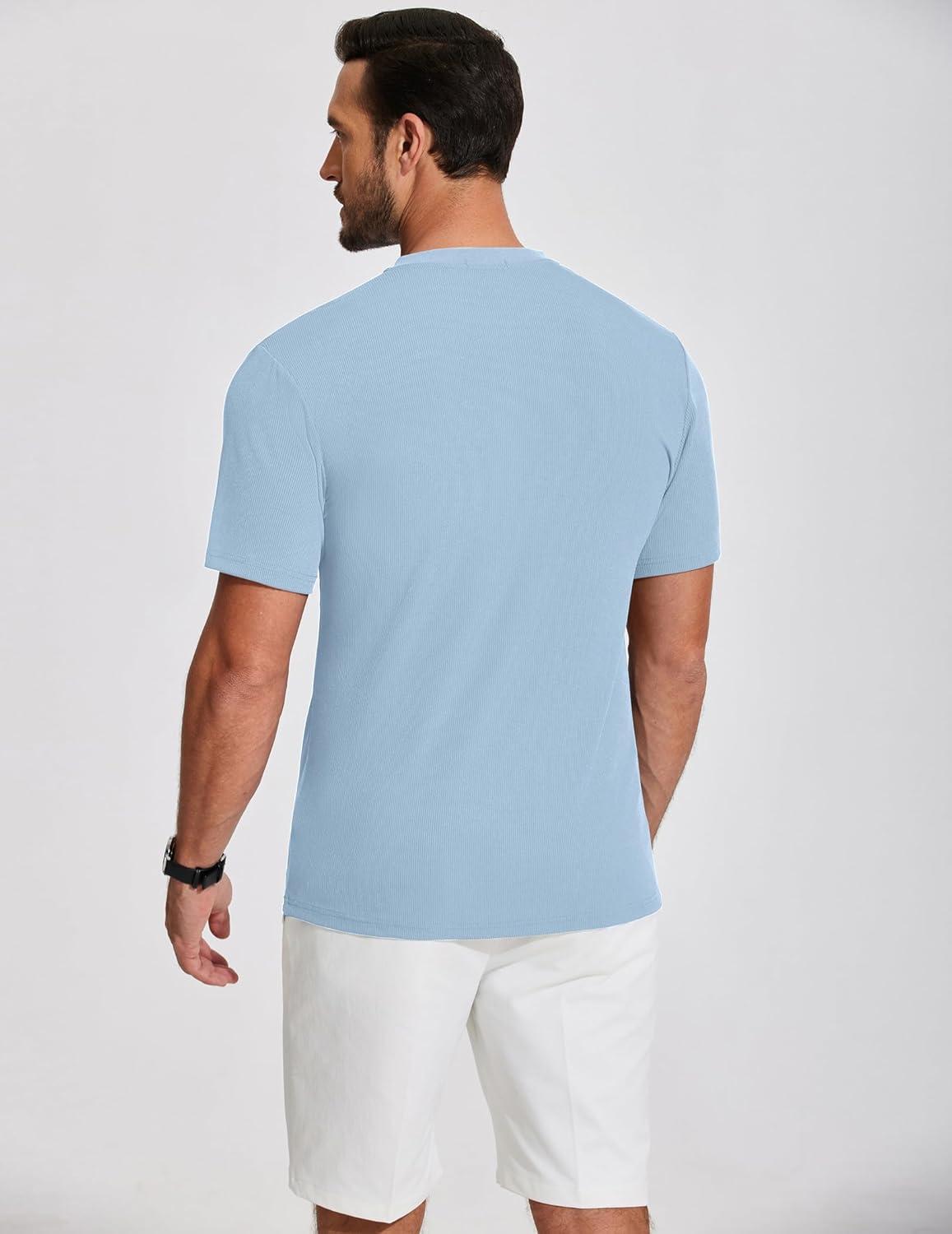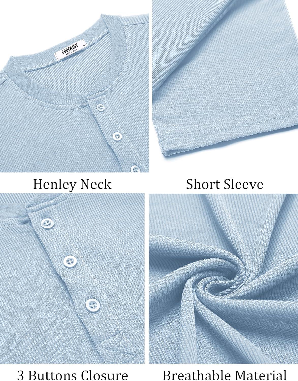 COOFANDY Mens Henley Shirts Short Sleeve Tshirt Basic Button Tees Summer Ribbed Pocket T Shirt Casual Stretch Tops(Light Blue)
