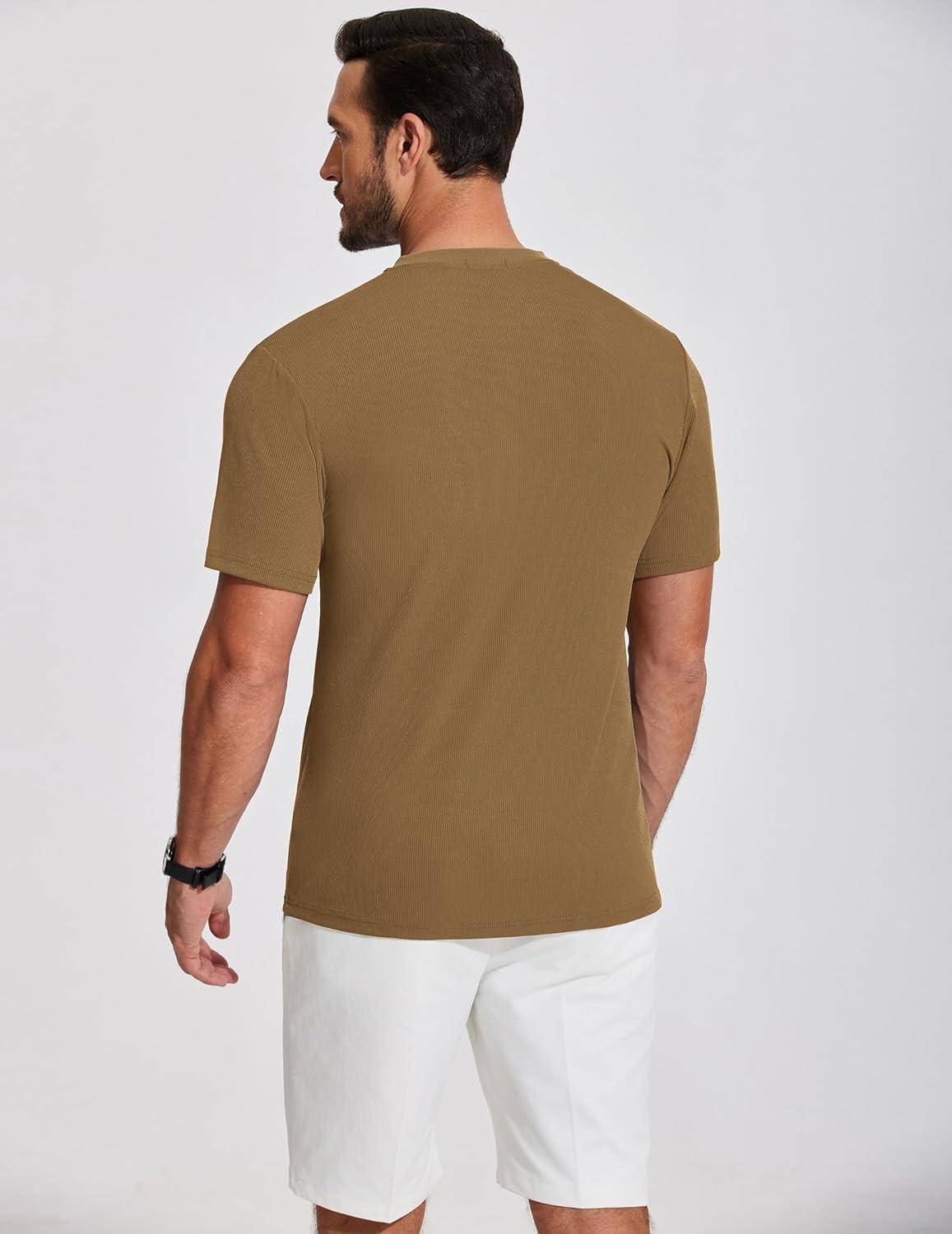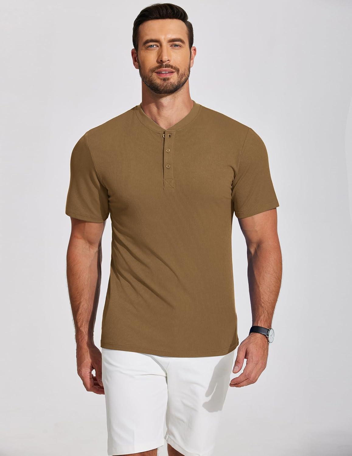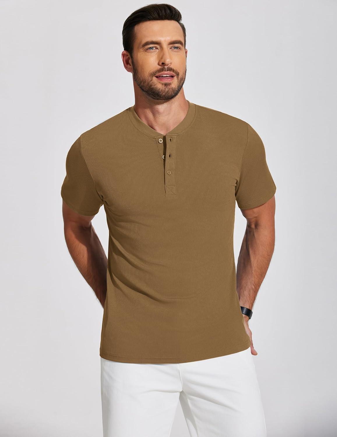 COOFANDY Men’s Henley Shirts Short Sleeve Ribbed T-Shirts Bodybuilding Workout Tee Shirts(Light Brown)