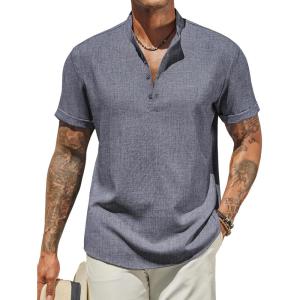 COOFANDY Men’s Casual Linen Henley Shirts Short Sleeve Band Collar Summer Beach Vacation T-Shirts(Dark Heather Blue)