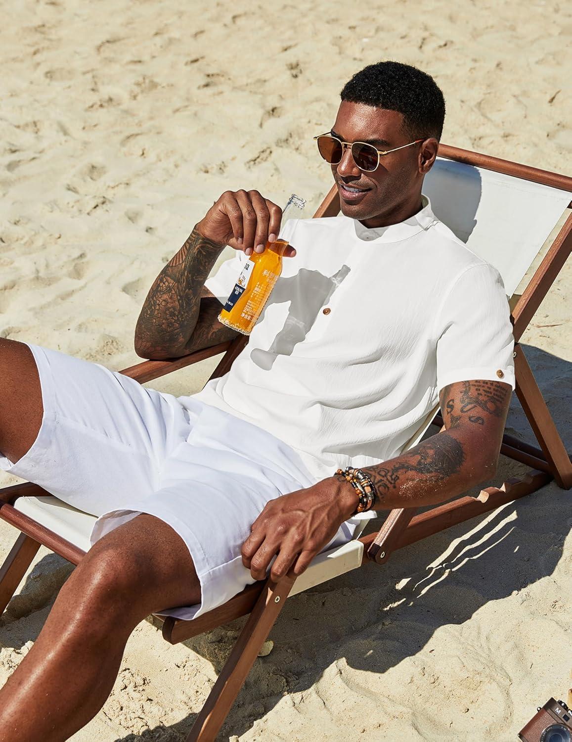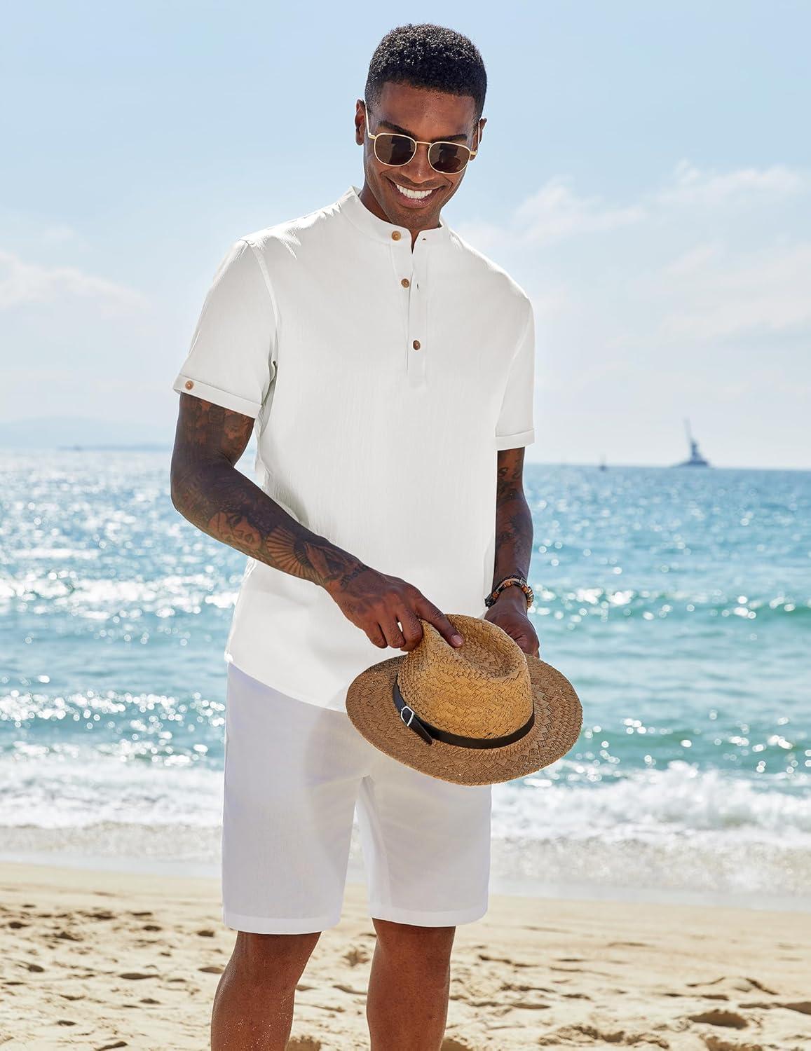 COOFANDY Henley Shirts for Men Short Sleeve Band Collar Casual Shirt Summer Hippie Vacation Beach T Shirts with Pocket(White)