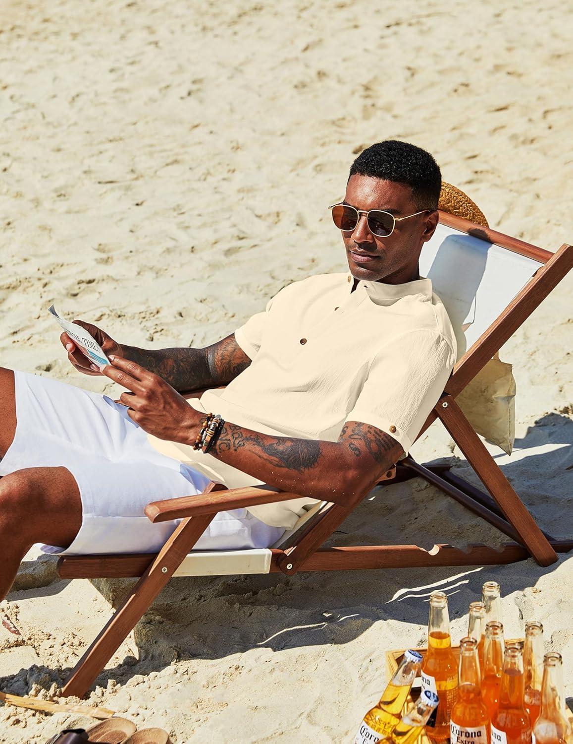 COOFANDY Henley Shirts for Men Short Sleeve Band Collar Casual Shirt Summer Hippie Vacation Beach T Shirts with Pocket(Champagne)