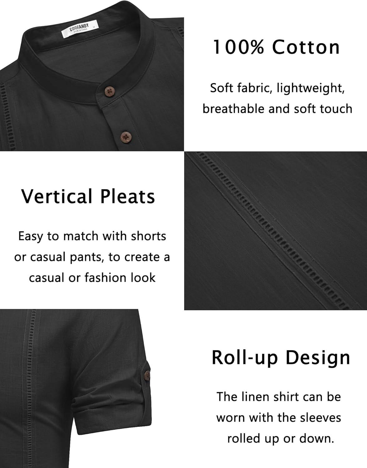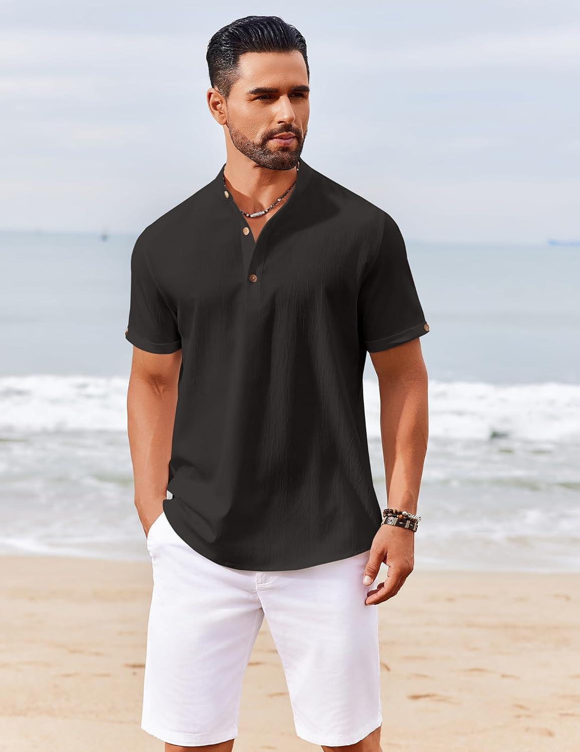 COOFANDY Men’s Cotton Linen Henley Shirt Short Sleeve Hippie Casual Band Collar Summer Beach T-Shirts(Black)