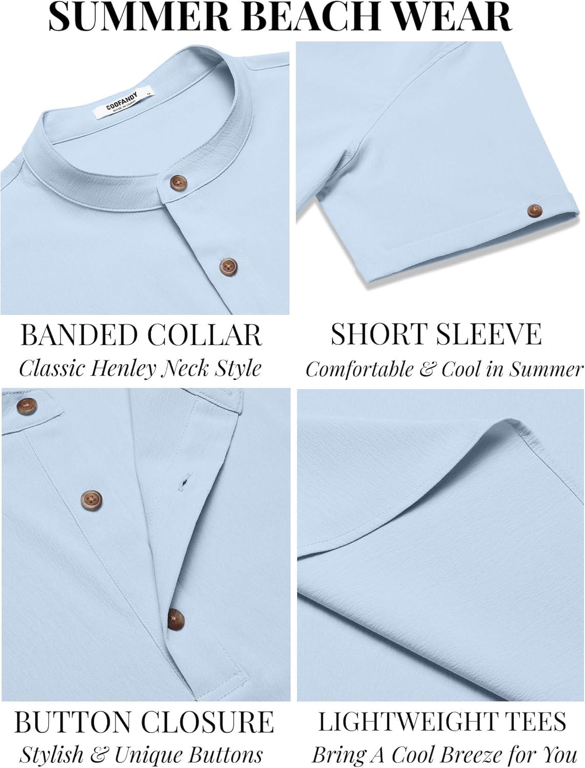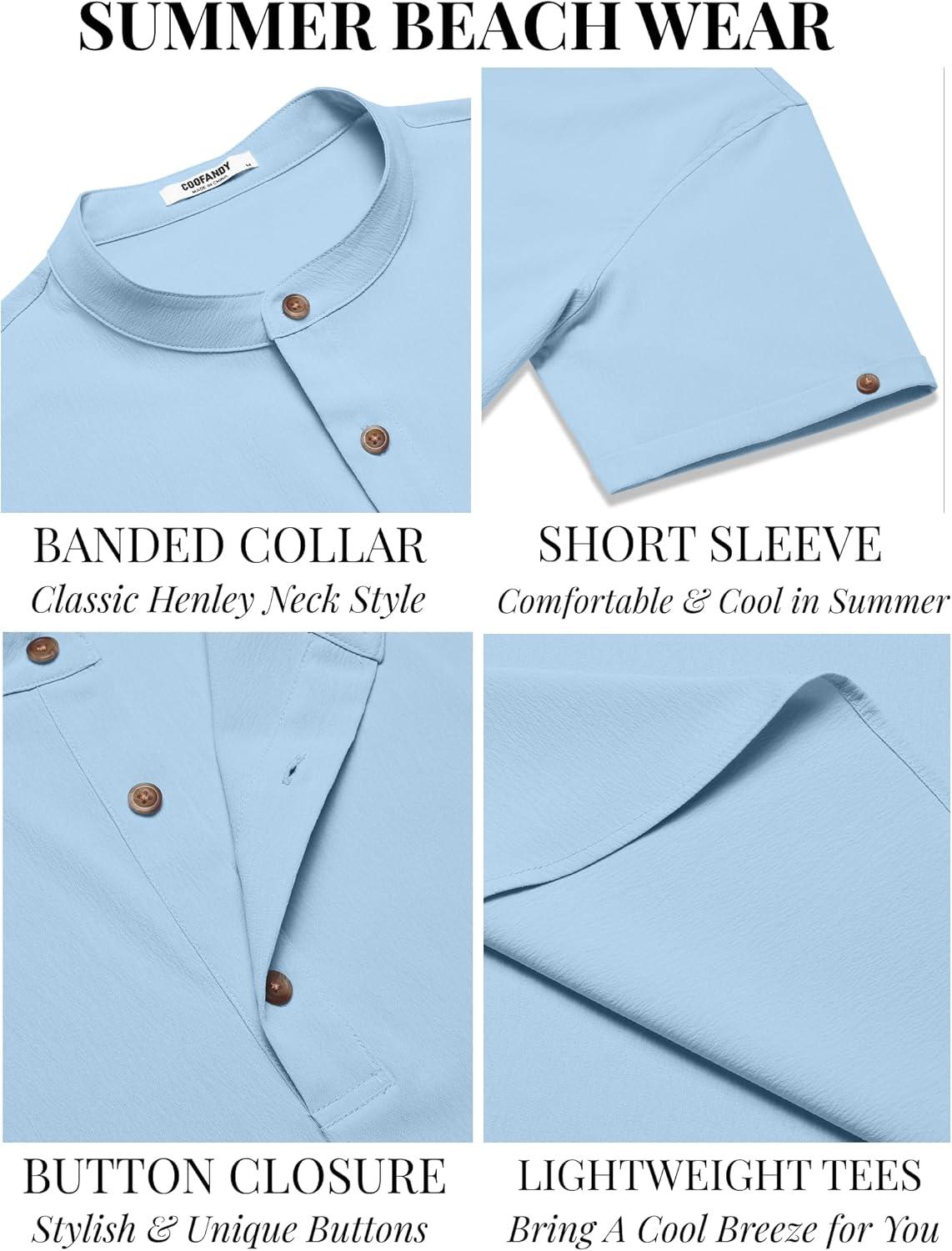 COOFANDY Men’s Casual Henley Shirts Short Sleeve Summer Beach T-Shirts Banded Collar Henleys Button Tee Shirt(Sky Blue)