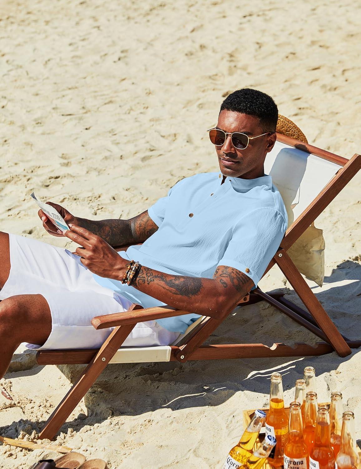 COOFANDY Henley Shirts for Men Short Sleeve Band Collar Casual Shirt Summer Hippie Vacation Beach T Shirts with Pocket(Light Blue)