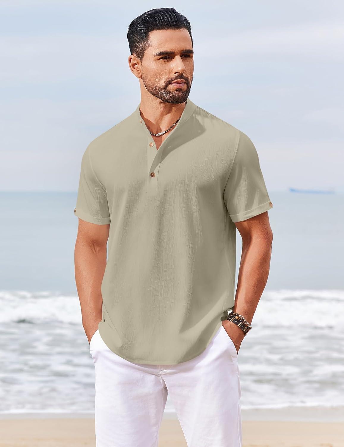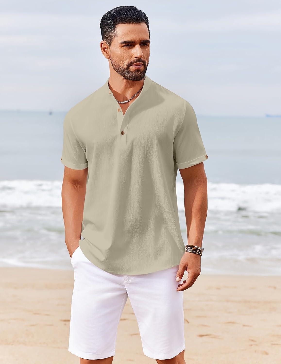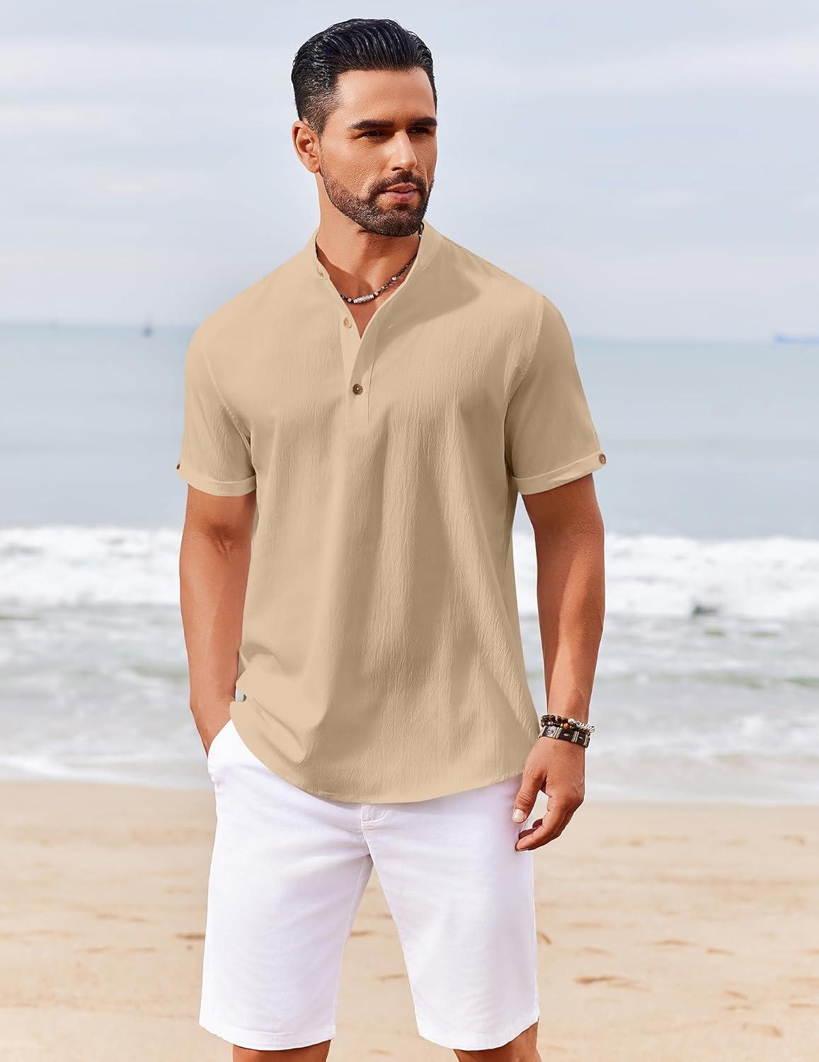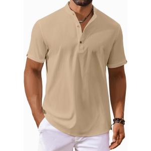 COOFANDY Men’s Casual Linen Henley Shirts Short Sleeve Band Collar Summer Beach Vacation T-Shirts(Khaki)