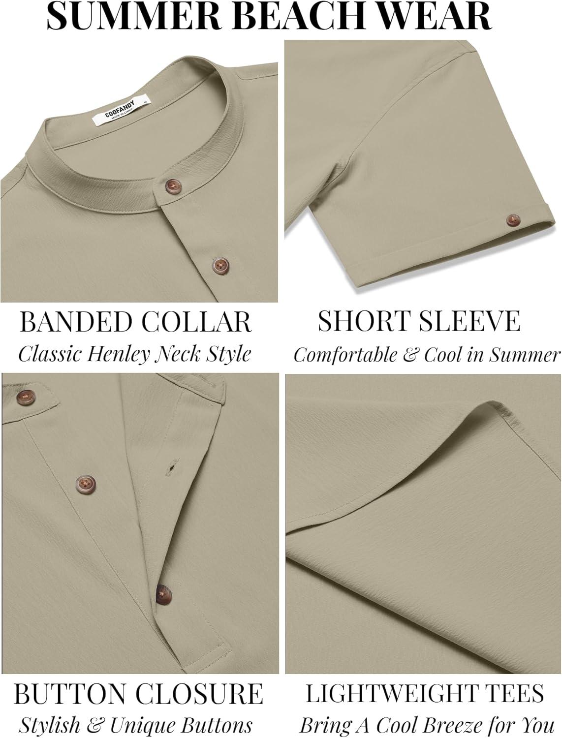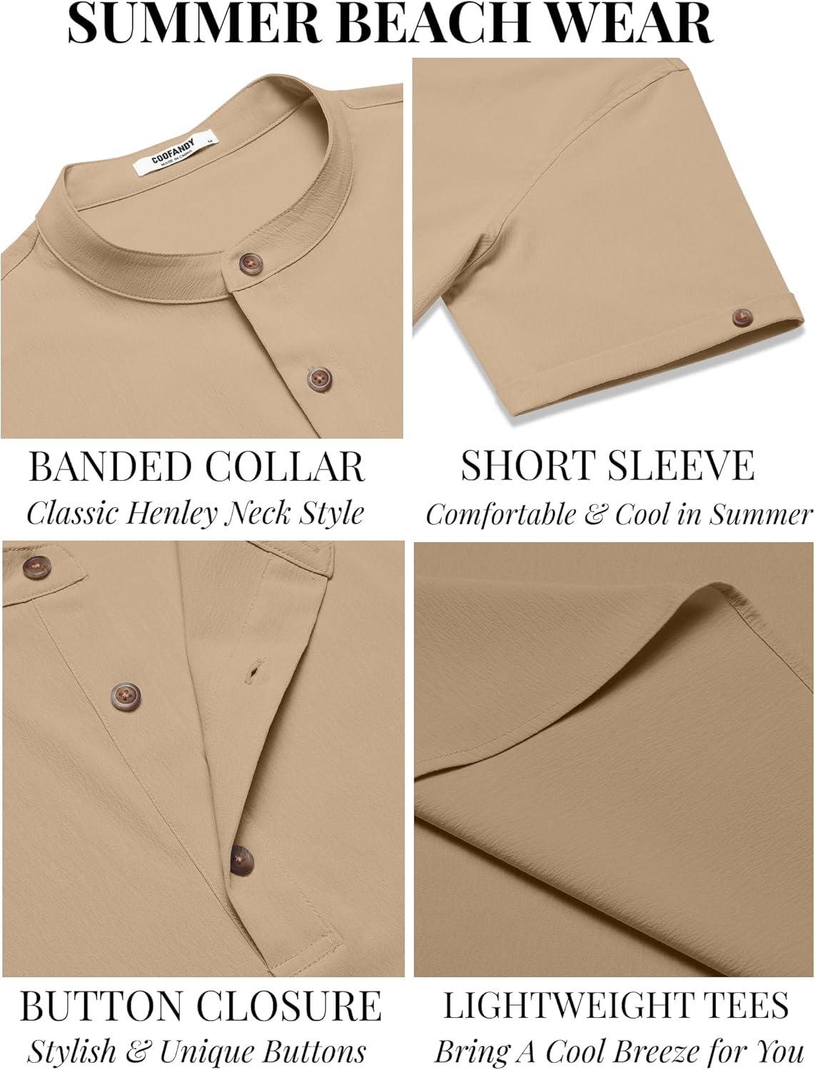 COOFANDY Men’s Casual Henley Shirts Short Sleeve Summer Beach T-Shirts Banded Collar Henleys Button Tee Shirt(Khaki)